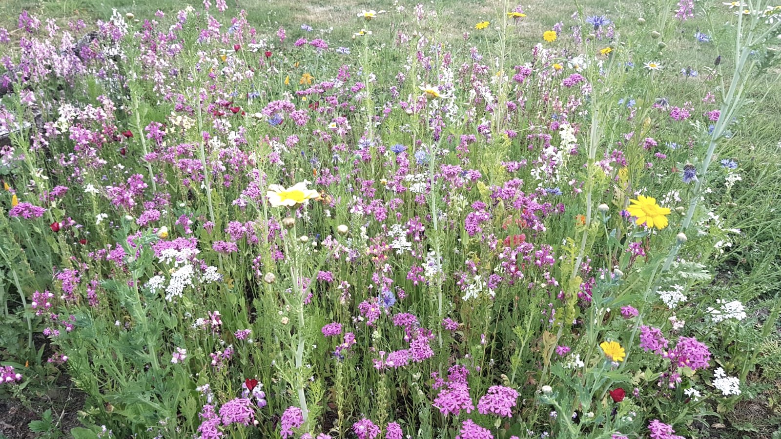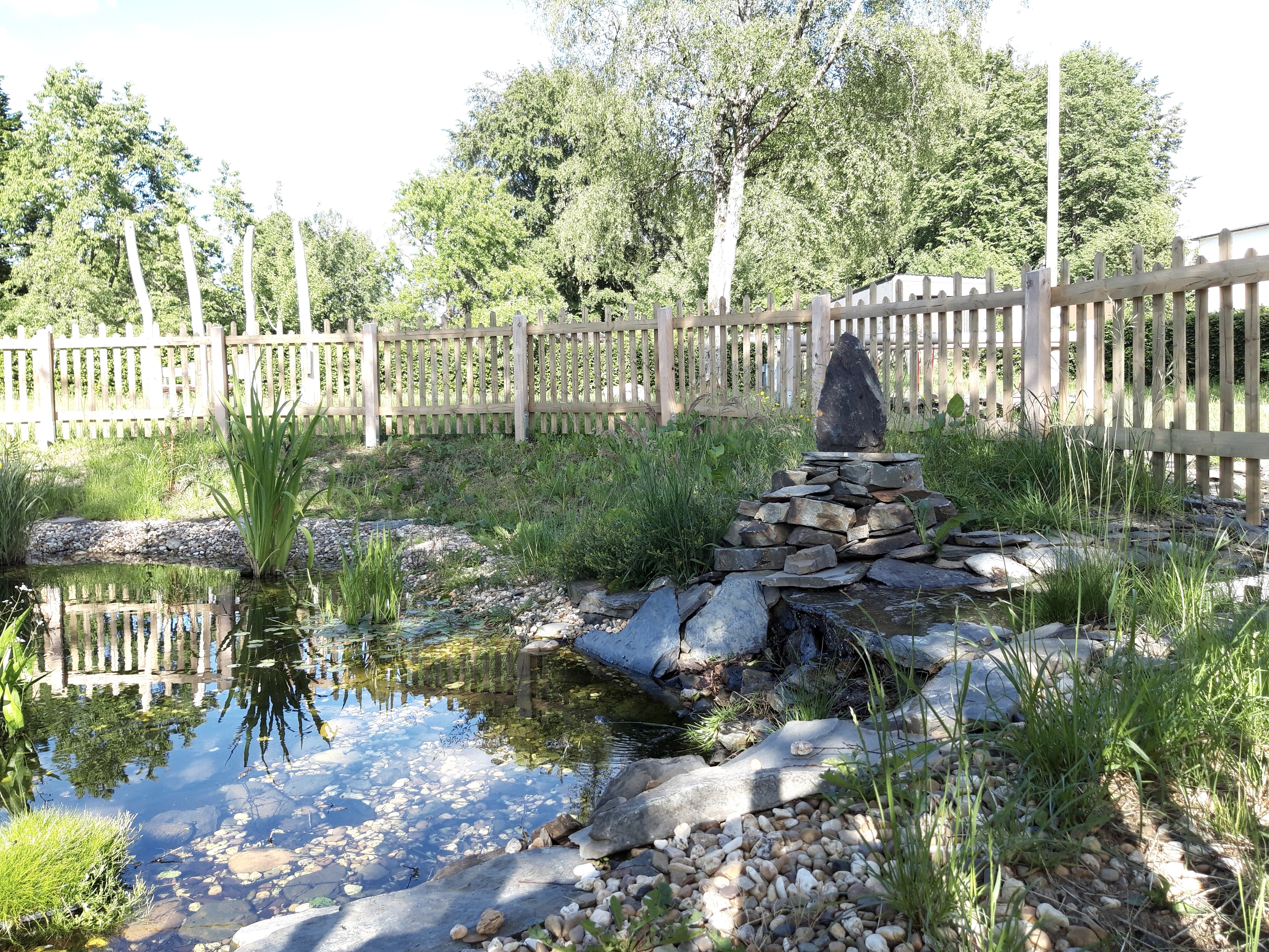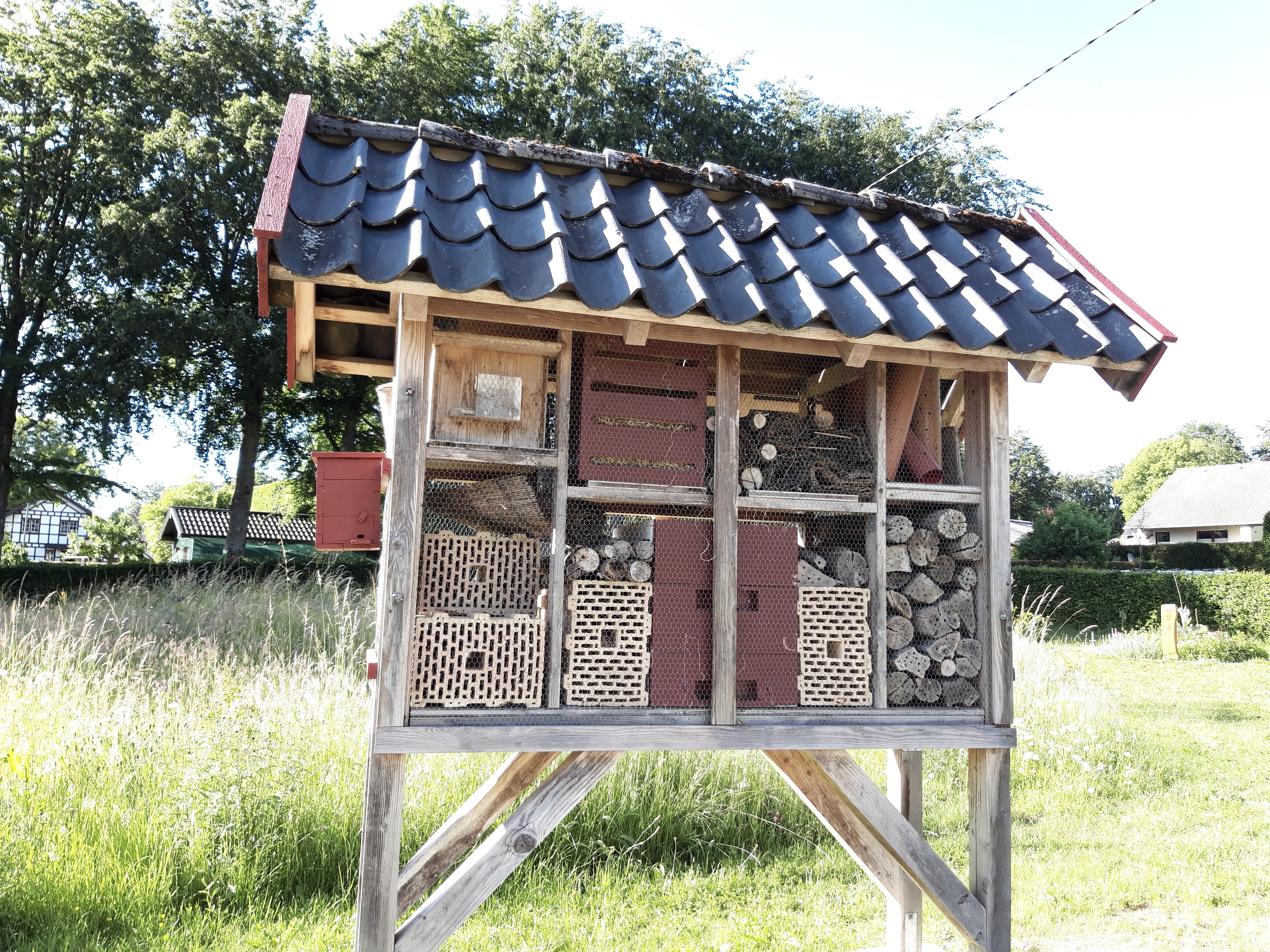 Gleich am Start des Heckenwegs genau gegenüber des Nationalpark-Tors, entdecken wir das Dorfbiotop mit dem schönen Picknickplatz. Natürlich eingefriedet von Buchenhecken ist hier eine kleine Naturoase entstanden, die uns neugierig macht. Das Insektenhotel, die Wildblumen, Kräuter und Bachgeplätscher; wir entschließen uns spontan zu einer Kaffeepause aus dem Rucksack, um das alles in Ruhe anzusehen.