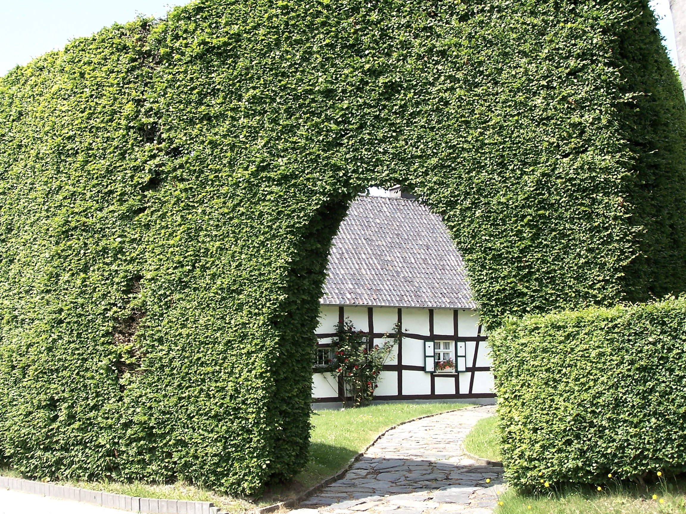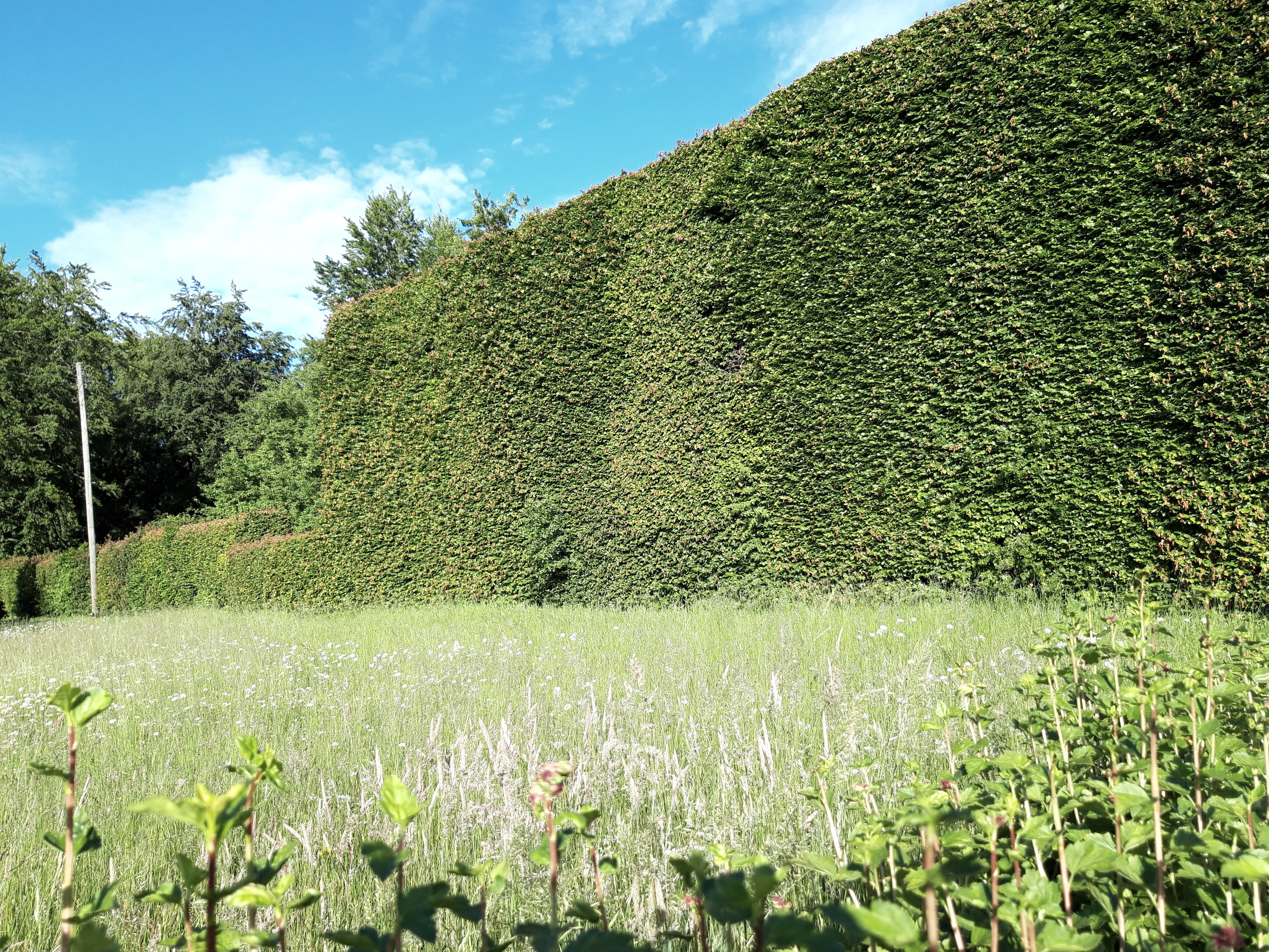 Und dann geht es los in die Weiherstraße. Wir bestaunen die imposanten Buchenhecken die zum Teil bis zu 6m hoch, 1m tief und bis zu 30m lang sind. Wir können gut nachvollziehen, dass die Hecken die Gebäude vor Wind, Regen und Schnee schützen, denn die Häuser und Gärten sind vom Weg aus kaum zu sehen. Und während wir noch überlegen, wie man solche Hecken wohl pflegt und schneidet, bemerken wir die großen Bögen für die Hofeinfahrten und richtige Fensterausschnitte, um die Häuser dahinter mit Licht zu versorgen.