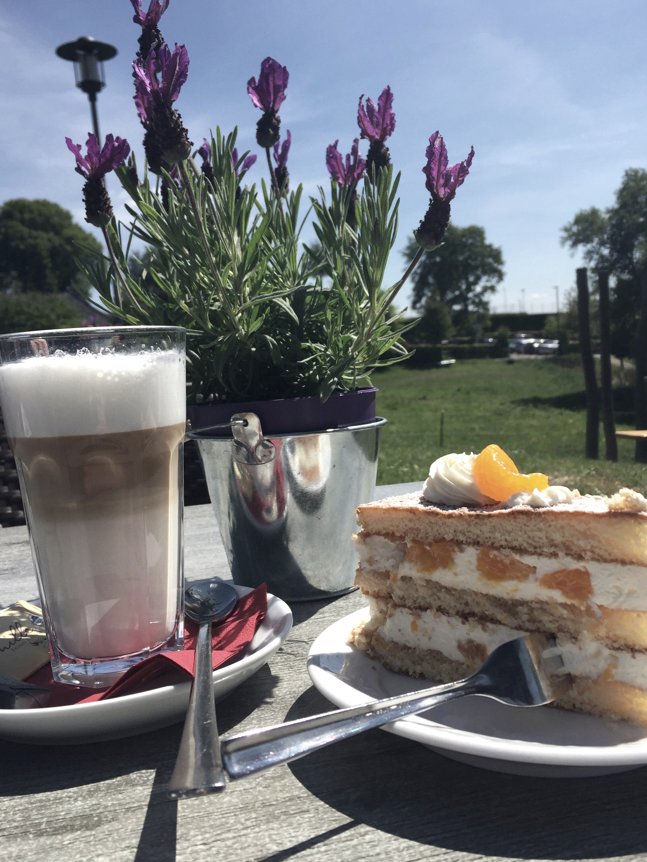 Zurück am Nationalpark-Tor genießen wir zum Ausklang eines schönen Tages den Ausblick von der Außenterrasse des Bistro Alte Molkerei bei Cappuccino und Kuchen.