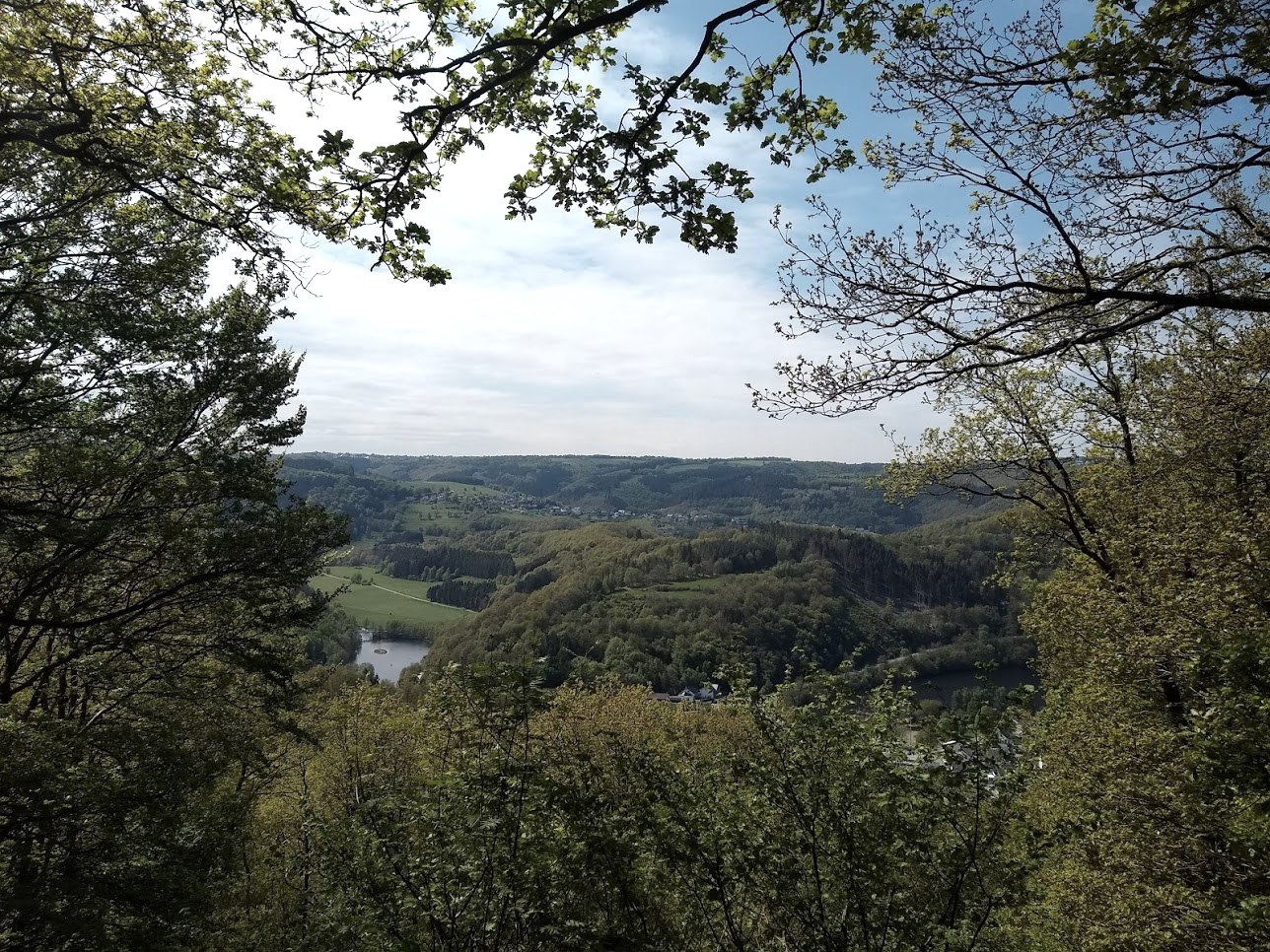 Auf den Hängen über Einruhr. Die kurzweilige, aber anstiegsreiche Wanderung führt vom Heilsteinhaus vorbei am Einruhrer Wassertretbecken auf die Anhöhe zum Aussichtspunkt „Jiescheckerdeeischelche“. Der Panoramablick belohnt den anstrengenden Anstieg.