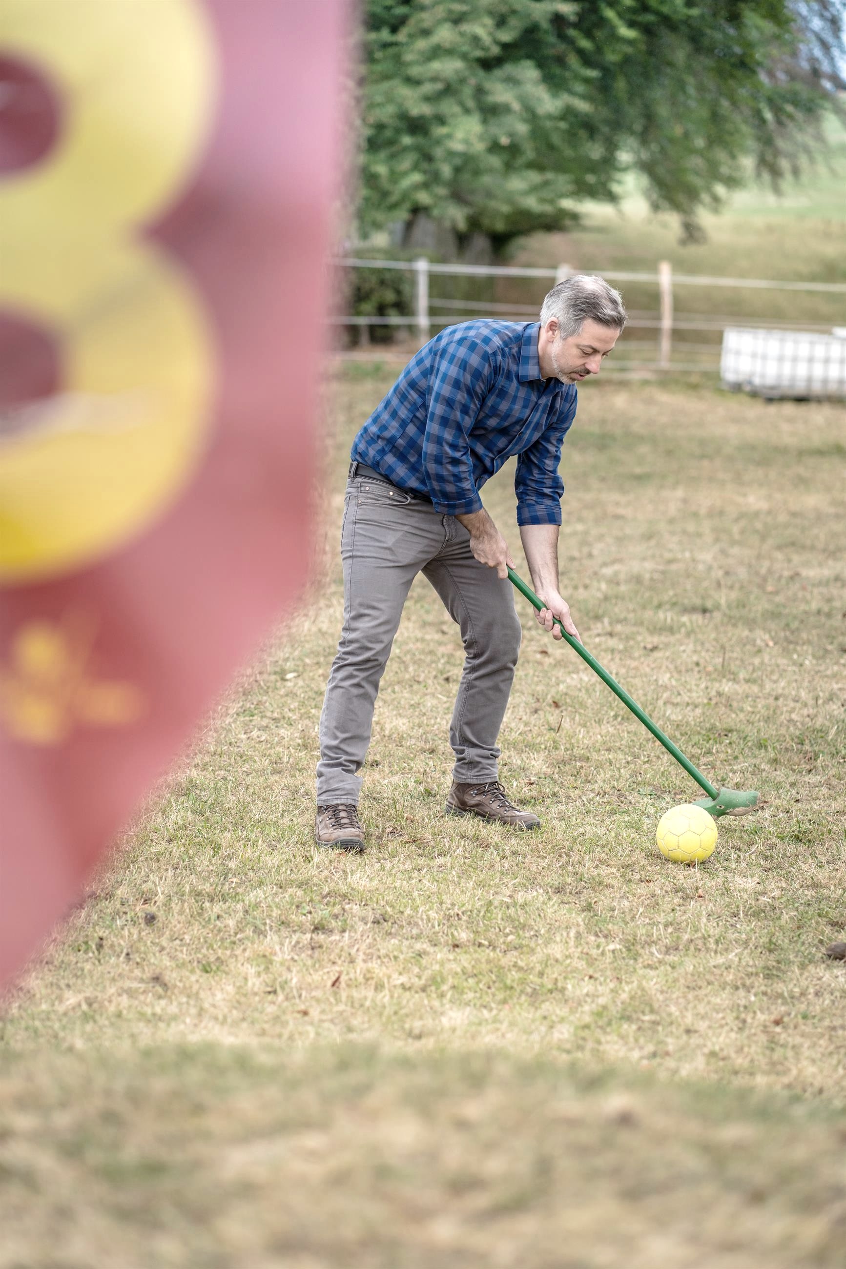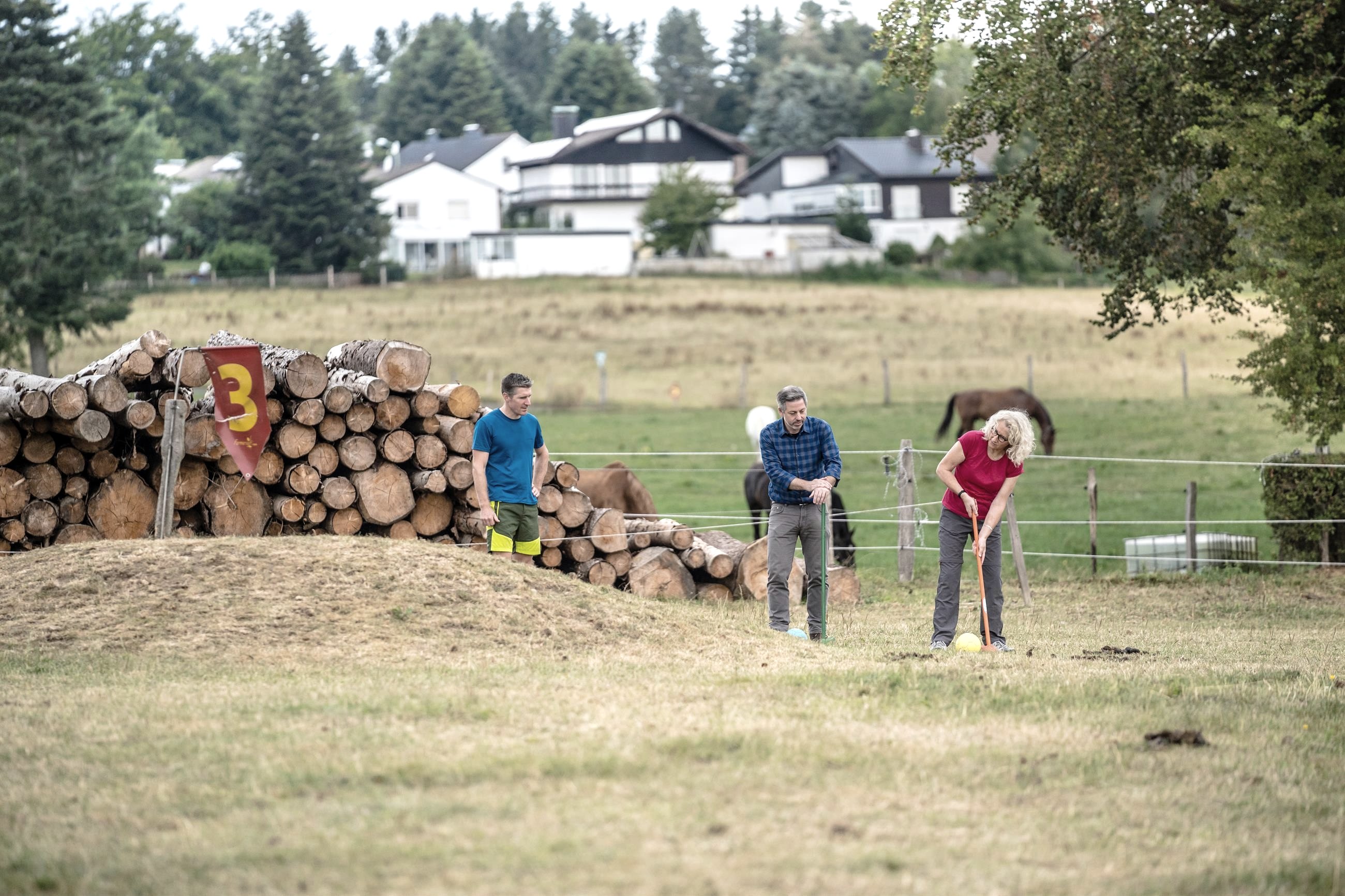 Gespielt wird natürlich auf einer echten Eifelwiese mit abwechslungsreichem Parcours – den man sich hin und wieder sogar mit tierischen Zuschauern teilt. Gespielt wird in Teams von zwei bis sechs Personen.