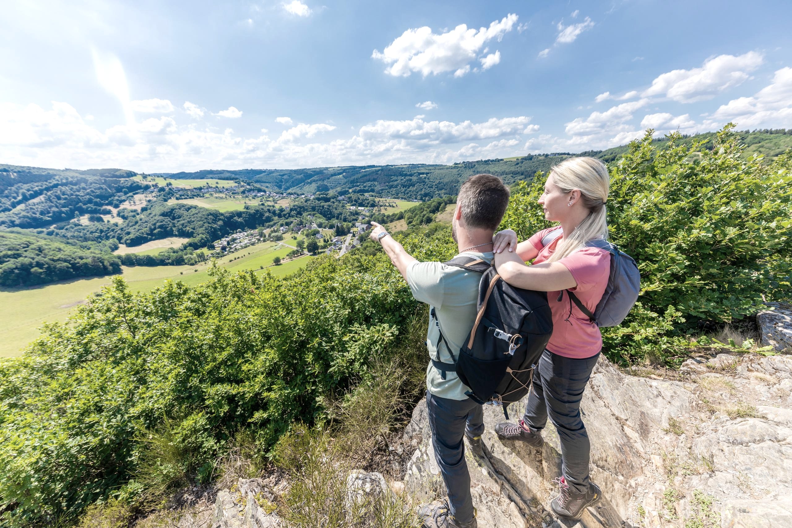 Der herrliche Blick reicht in das Tal der Rur, kurz bevor sie in den Obersee mündet. Auf der gegenüberliegenden Seite des Tals sieht man die Wald- und Offenlandflächen des ehemaligen Truppenübungsplatzes Vogelsang, heutzutage Teil der Nationalparks Eifel.