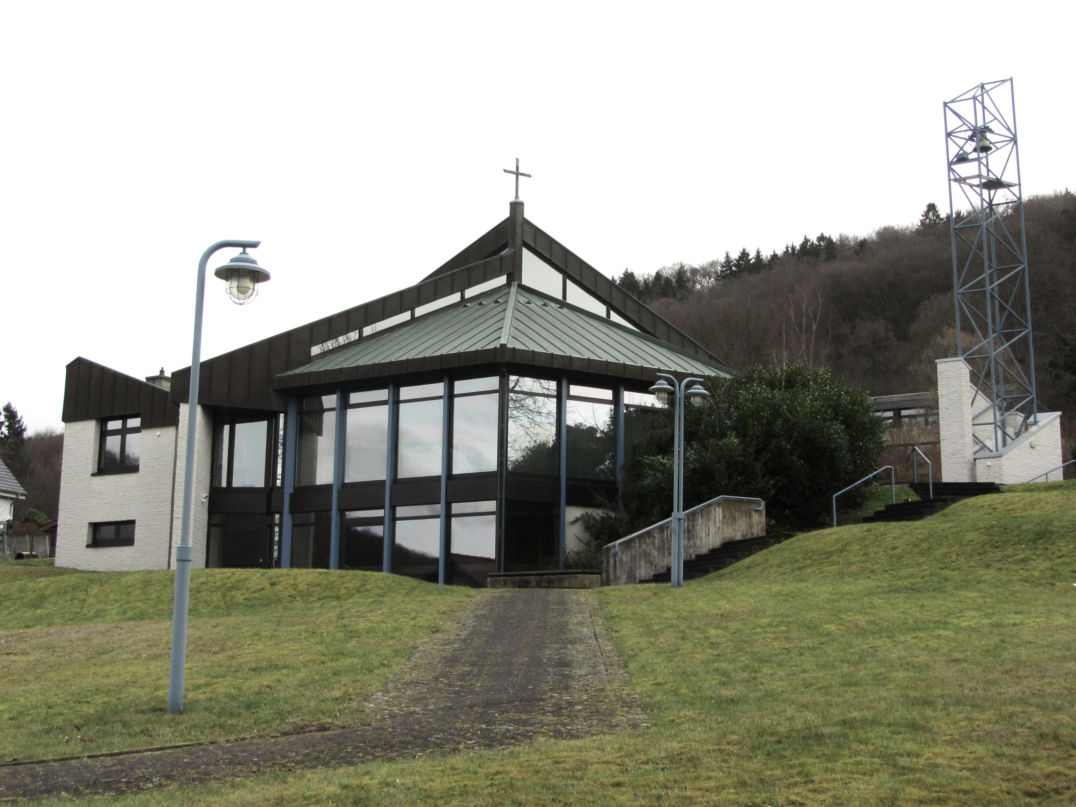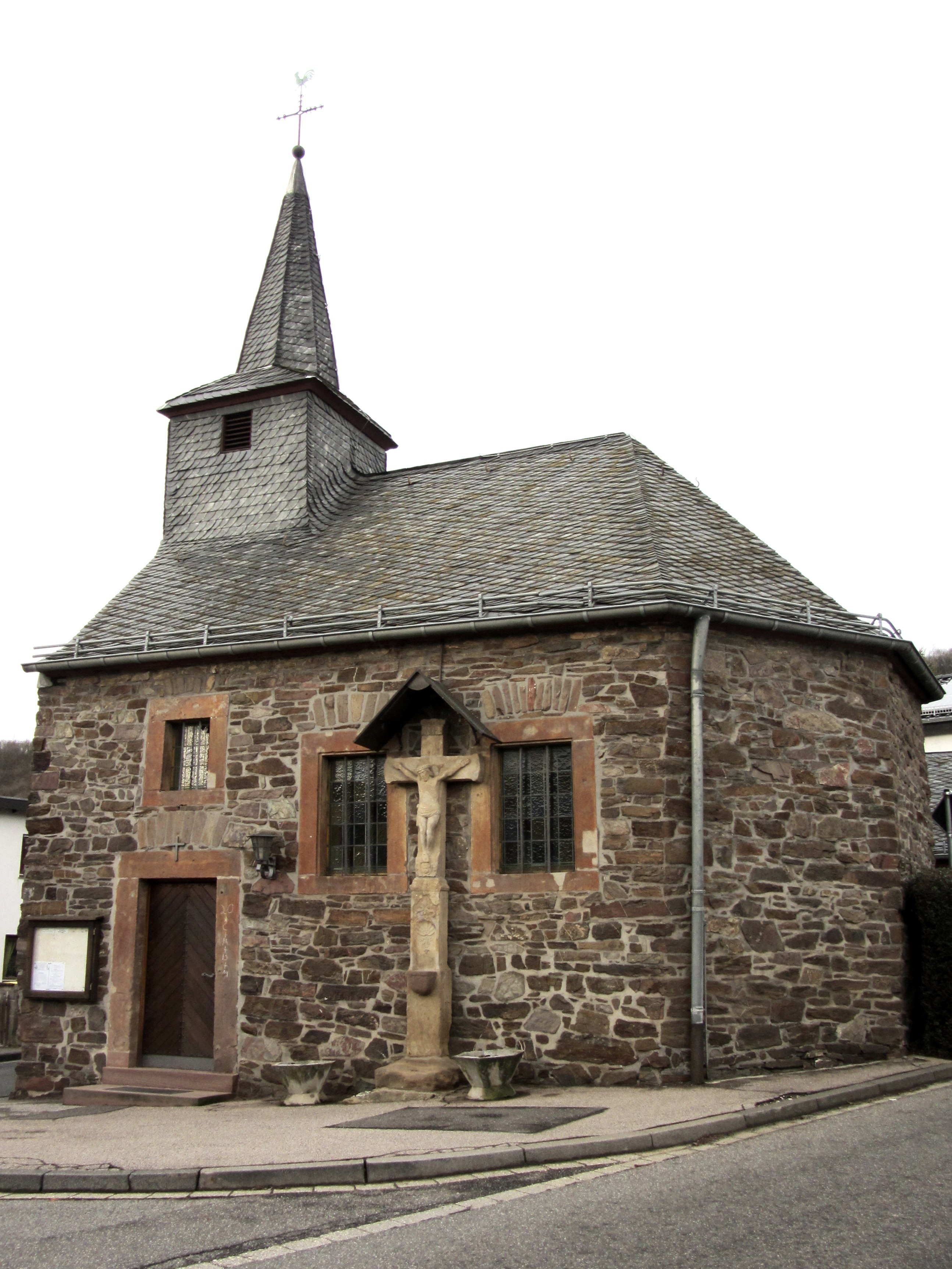 Vorbei an zahlreichen Einkehrmöglichkeiten erreichen Sie nach kurzer Zeit und einem weiteren kleinen Anstieg die Kirche Sankt Johannes Baptist, die Johannes dem Täufer geweiht ist. Danach führt die Strecke Sie zürück zum Marktplatz und von dort aus immer weiter bergab nach Brück, wo Sie die Rur überqueren, bevor es wieder stetig bergauf geht. Schmidt ist Ihr nächstes Ziel. Dazu folgen Sie dem kleinen Schliebach bis hinein ins reizvolle Schliebachtal und dann hinauf nach Schmidt, wo Sie im Dorfzentrum die St. Hubertus Kirche finden. Von den Schmidter Höhen geht es nun wieder bergab Sandsteinkreuz bei Abenden. in Richtung Rursee und dann weiter zur Rurtalsperre in Schwammenauel.