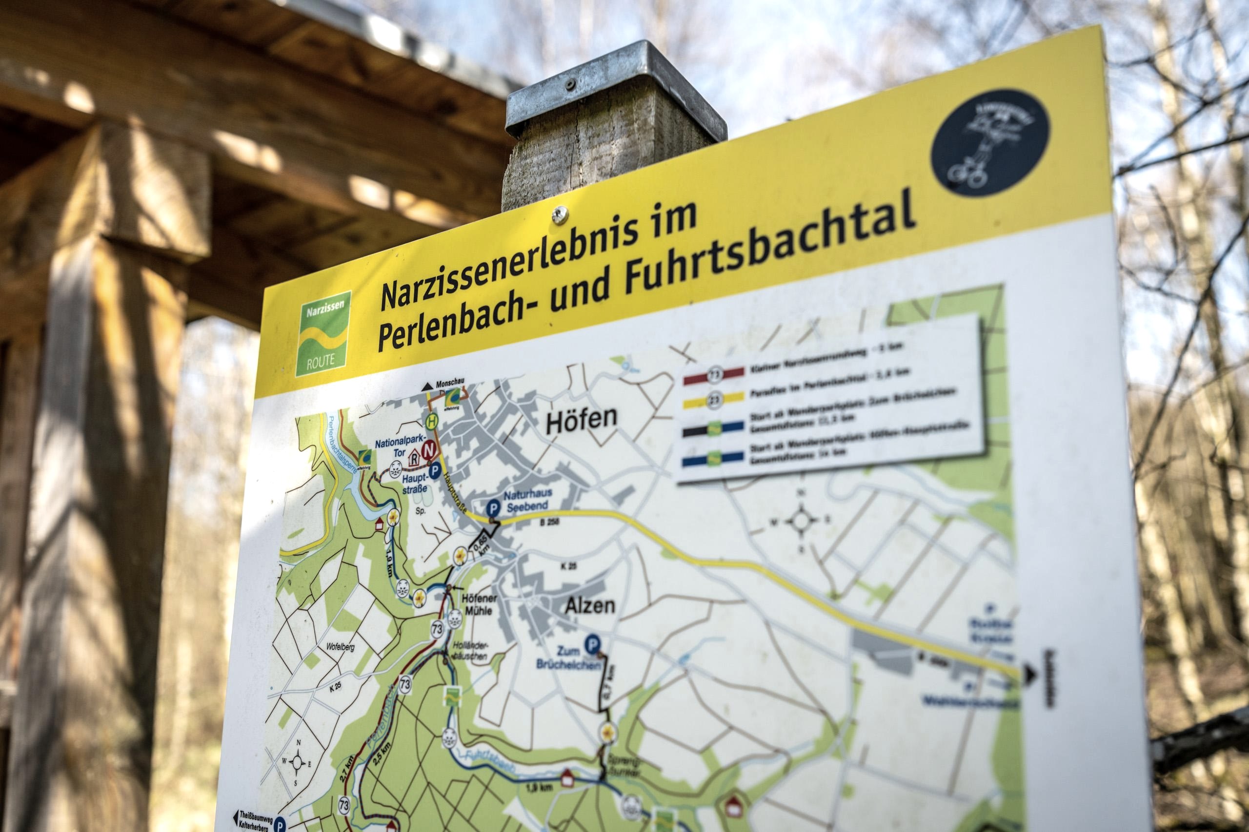 - Der 5 Kilometer lange kleine Narzissenrundweg startet an der Höfener Mühle (Mühlenweg, Monschau-Höfen) und führt ebenfalls durch das Perlenbachtal.