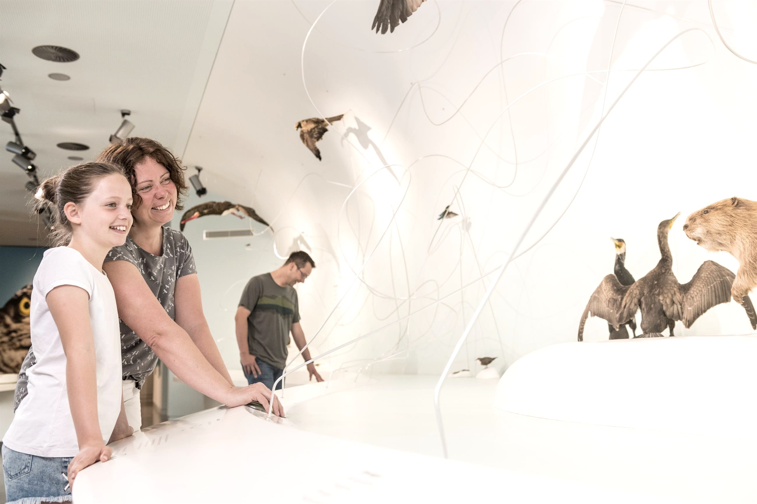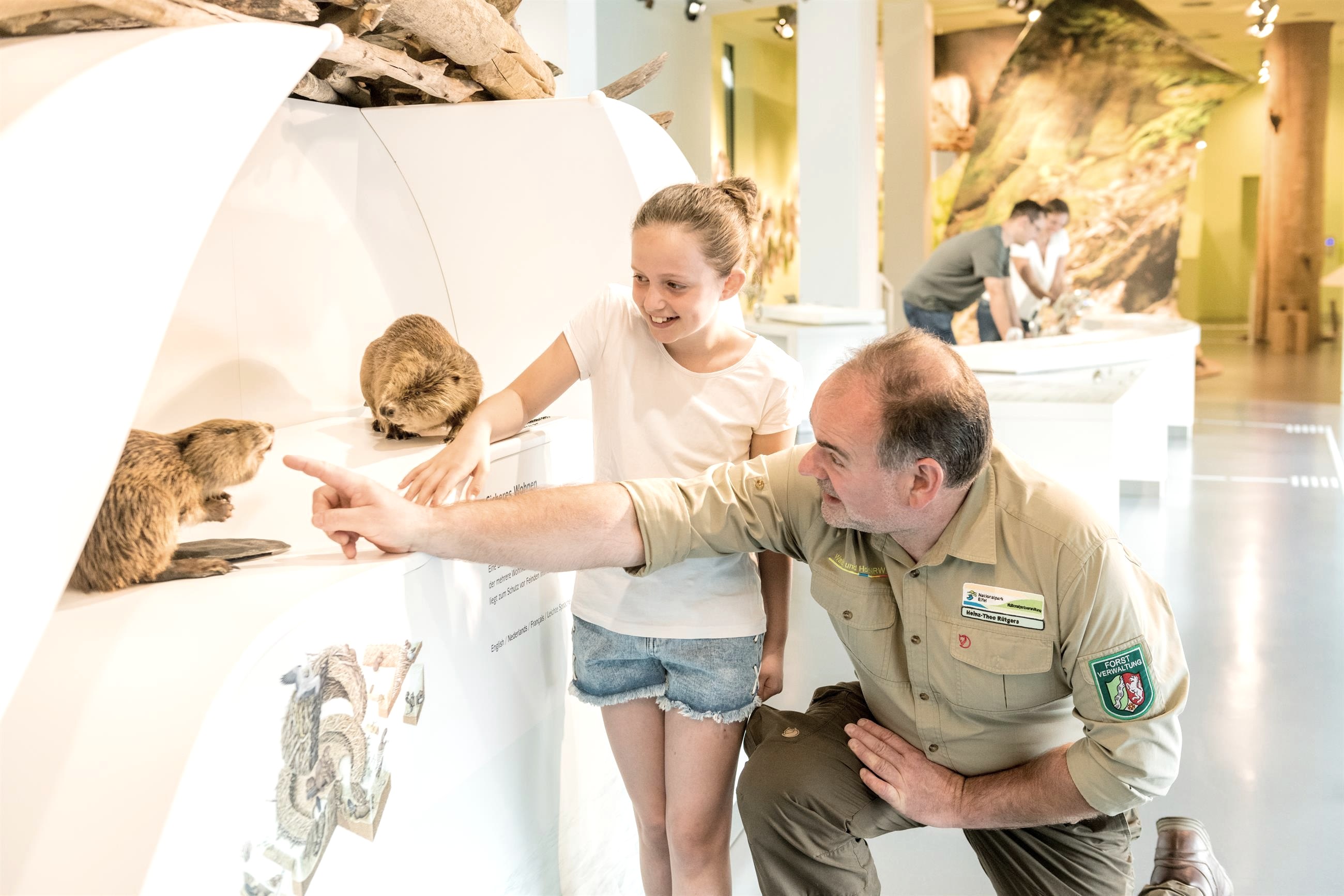 Taktile Modelle von Tieren, der Geruch von Pflanzen und das weiche Fell eines Bibers machen die Ausstellung auch für seh-behinderte Menschen zu einem spannenden Rundgang durch die Wildnis. Ein barrierefreies Leitsystem in erhabener und Braille-Schrift weist den Weg durch die insgesamt sieben Module. Die Inhalte werden in Deutsch, Englisch, Französisch, Niederländisch und Leichter Sprache sowie bei Führungen auch in Gebärdensprache vermittelt. Denn das Nationalpark-Zentrum Eifel versteht sich als Internationale Begegnungsstätte, die für Toleranz, Weltoffenheit und einen respektvollen Umgang mit der Natur steht. Von der Terrasse des Besucherzentrums, das in einer zweiten Dauerausstellung auch die bewegte Geschichte des Geländes Vogelsang thematisiert, genießen die Besucher schließlich beeindruckende Panoramablicke über die steilen Täler, die dicht bewachsenen Wälder und Seen des Nationalparks Eifel.