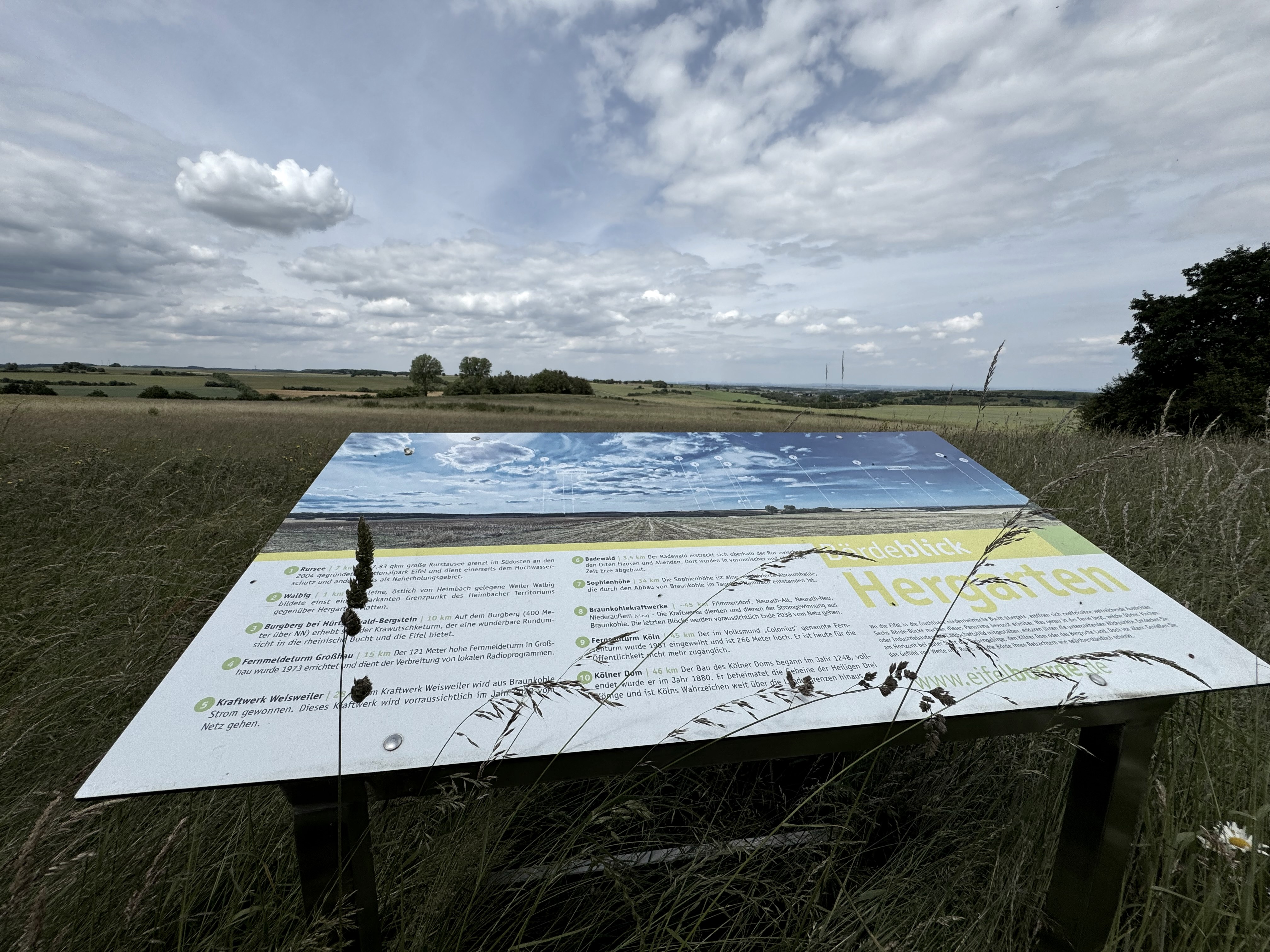 Hergarten, das schöne Dorf zwischen Eifel und Börde ist der Ausgangspunkt für eine kurze Wanderung mit vielen Fernblicken. Die gut 4 km lange Runde startet am Wanderparkplatz „ Zum Hohen Schirm“ südwestlich des Dorfausganges Richtung Düttling. Zunächst geht es leicht bergauf und am Waldrand entlang. Zur Rechten eröffnet sich schon der Blick ins Rheintal. Nach der Querung der Kreisstraße gelangen Sie zum Bördeblick Nievesknipp.