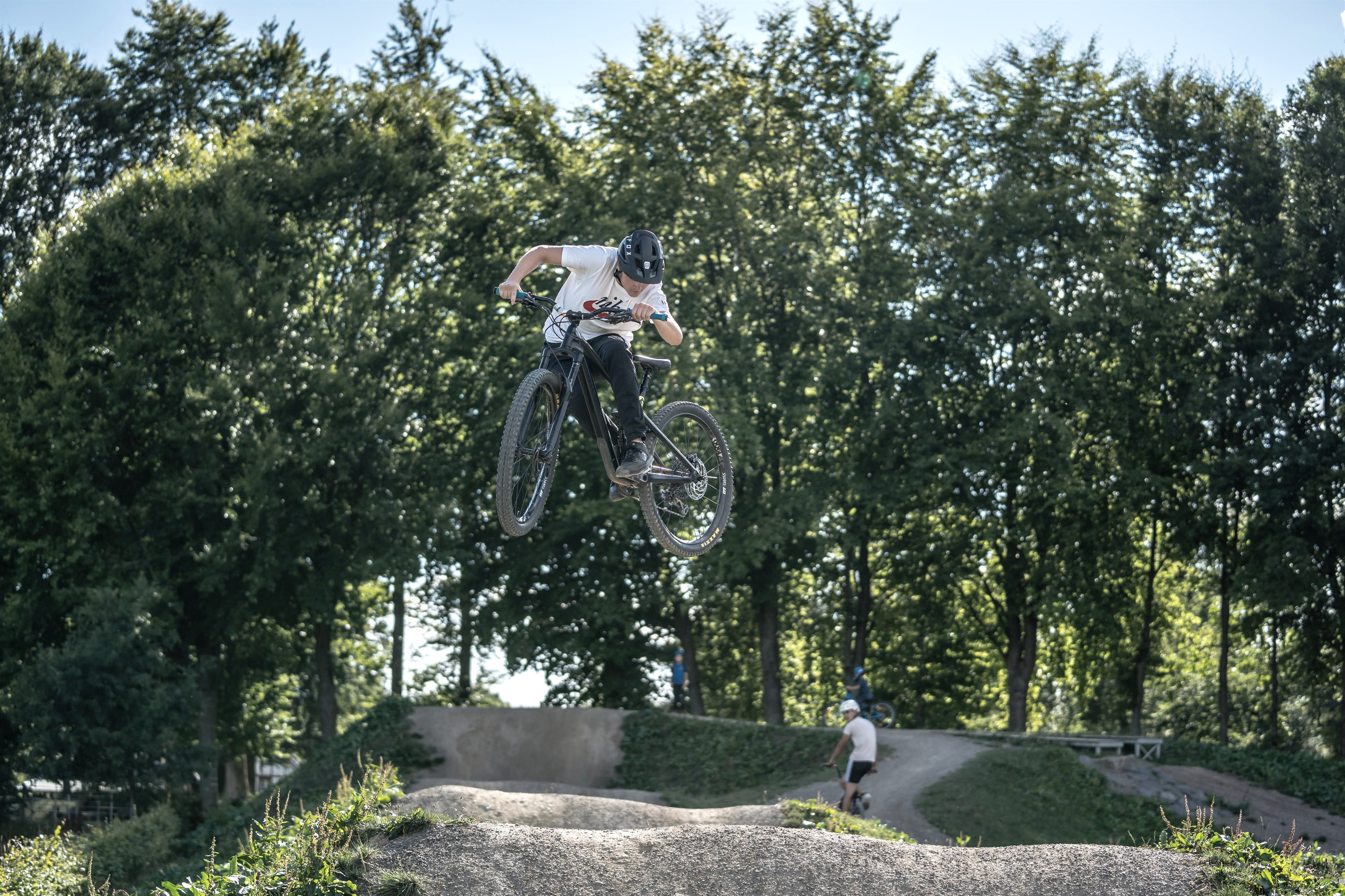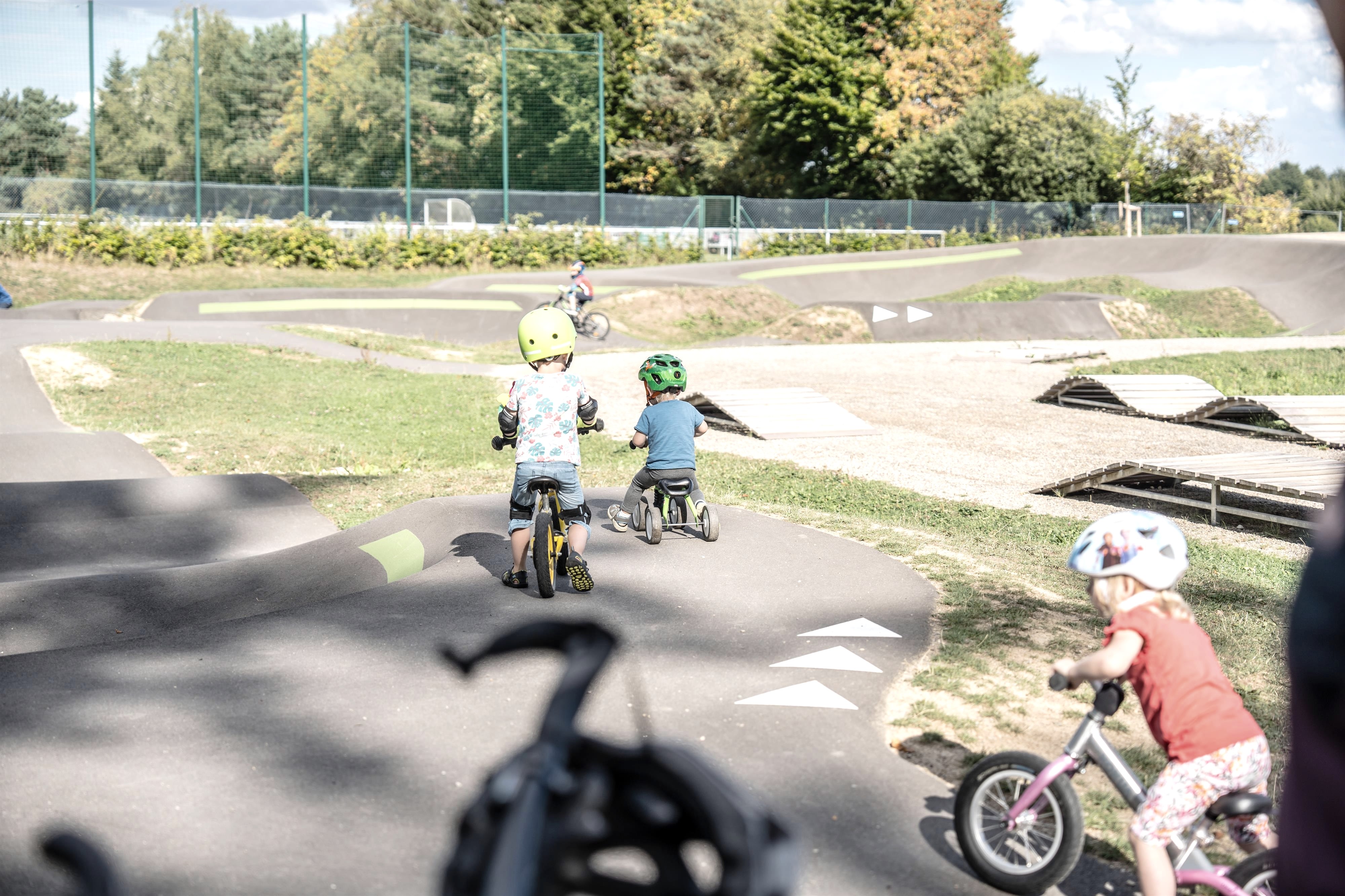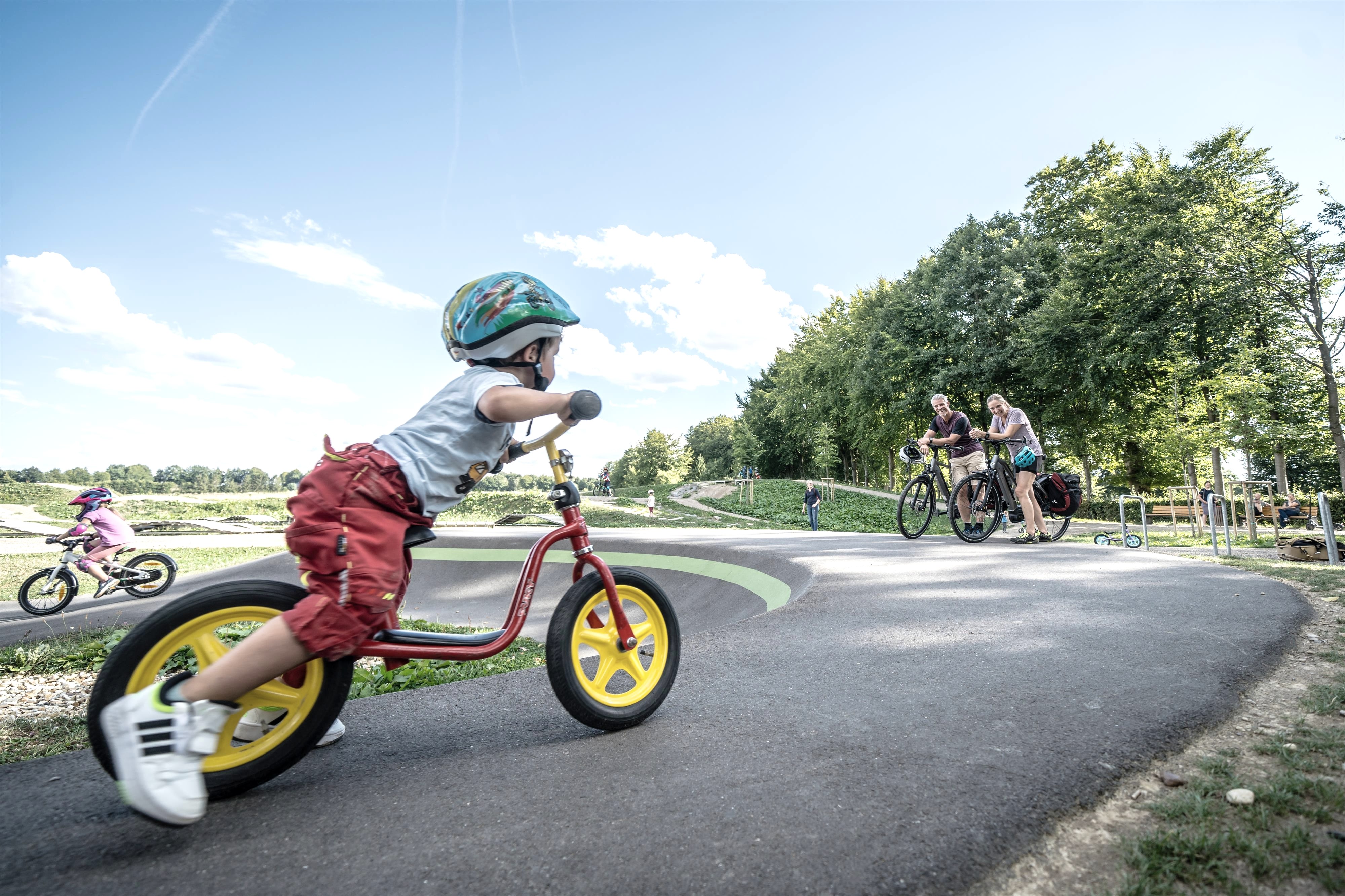 Mehrere Bereiche ergeben zusammen einen großen Abenteuerspielplatz für Radfans. So können bereits die Kleinsten auf dem Kidstrack mit dem Fahrrad oder Laufrädchen ihre ersten Runden ziehen, während Fortgeschrittene auf dem Pumptrack so richtig Tempo aufbauen. Der als Endlosschleife gestaltete Pumpkurs mit eingebauten Wellen, Kurven und Sprüngen eignet sich hervorragend zum aktiven Befahren. Hoch hinaus auf mehreren hintereinander gereihten Sprüngen geht es auf der Jumpline. Technik und Balance stehen wiederum in der Skills-Area im Vordergrund, wo unterschiedliche Herausforderungen mit Holzelementen warten. Wurzelpassagen können zudem auf der Stein- und Wurzelstrecke geübt werden. Für eine Pause zwischendurch gibt es auch einen eigenen kleinen Aufenthaltsbereich mit uriger Hütte, Tischen und Bänken.
