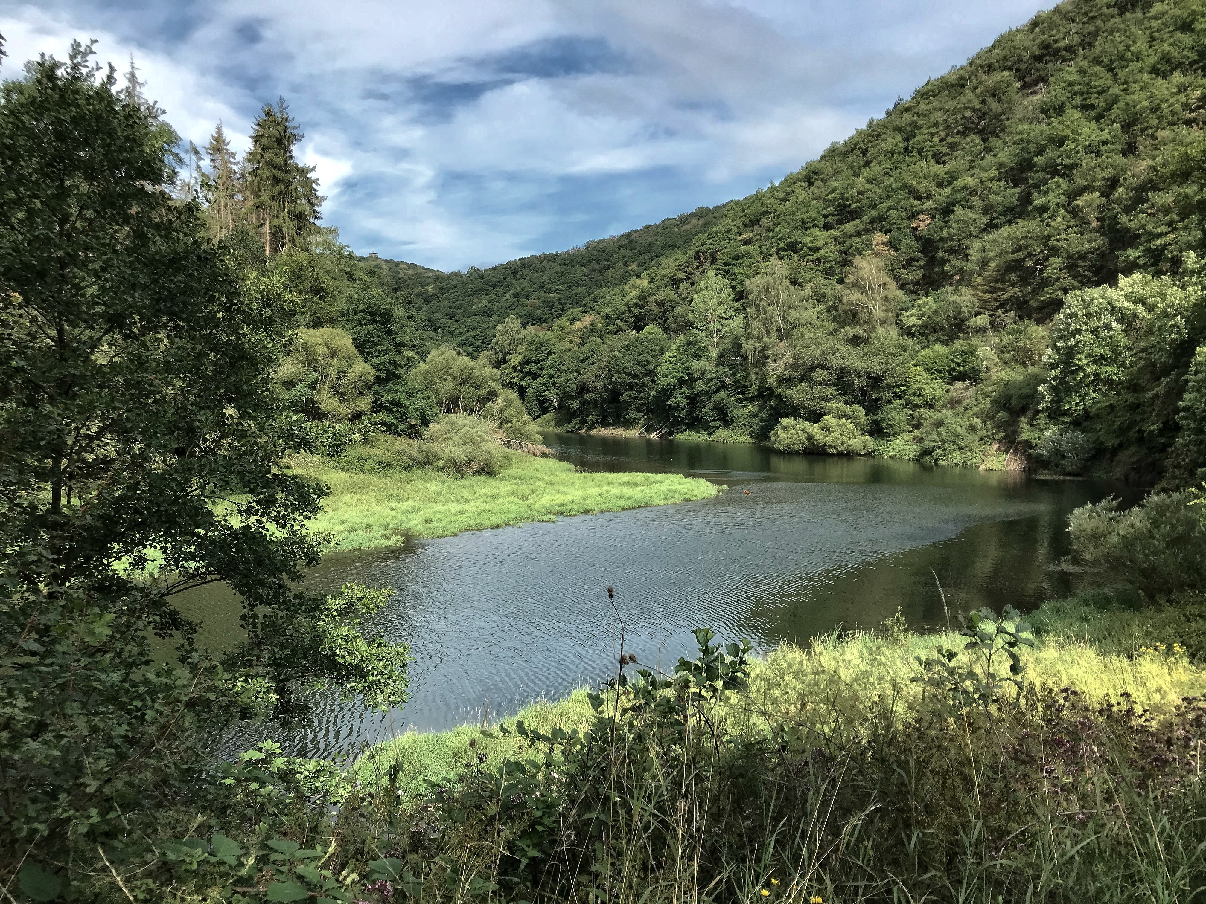 Du gehst immer an der Wasserkante entlang. Hier kannst du dichte Laubwälder bestaunen und hast einen herrlichen Blick auf den hoch aufragenden Kermeter (einen auf über 520 m Höhe gelegenen Teil der Rureifel) und den Meuchelberg.