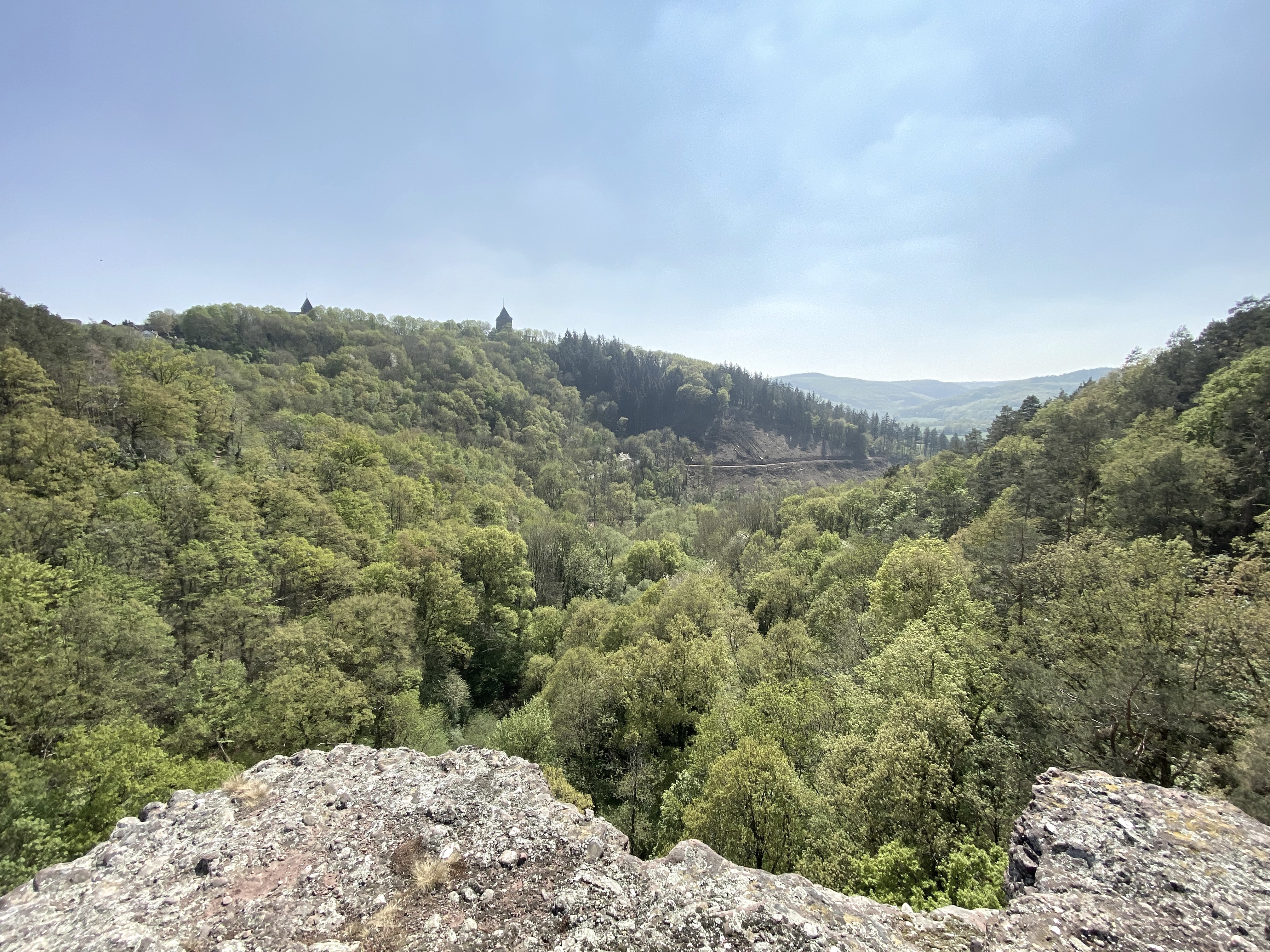 Step 1 – Vom Parkplatz aus folgst du der Bahnhofstraße und überquerst die Landstraße L 11. Weiter geht’s den Weg hinab unterhalb der Felsen von Nideggen Richtung Nideggen-Brück. Du wanderst durch die bunten Eichen- und Buchenwälder über Gut Laach ins sanfte Tal der Rur. Von diesem Abschnitt aus hat man einen Blick auf die berühmte Burg Nideggen: ein schönes Fotomotiv für deine Wandergruppe.