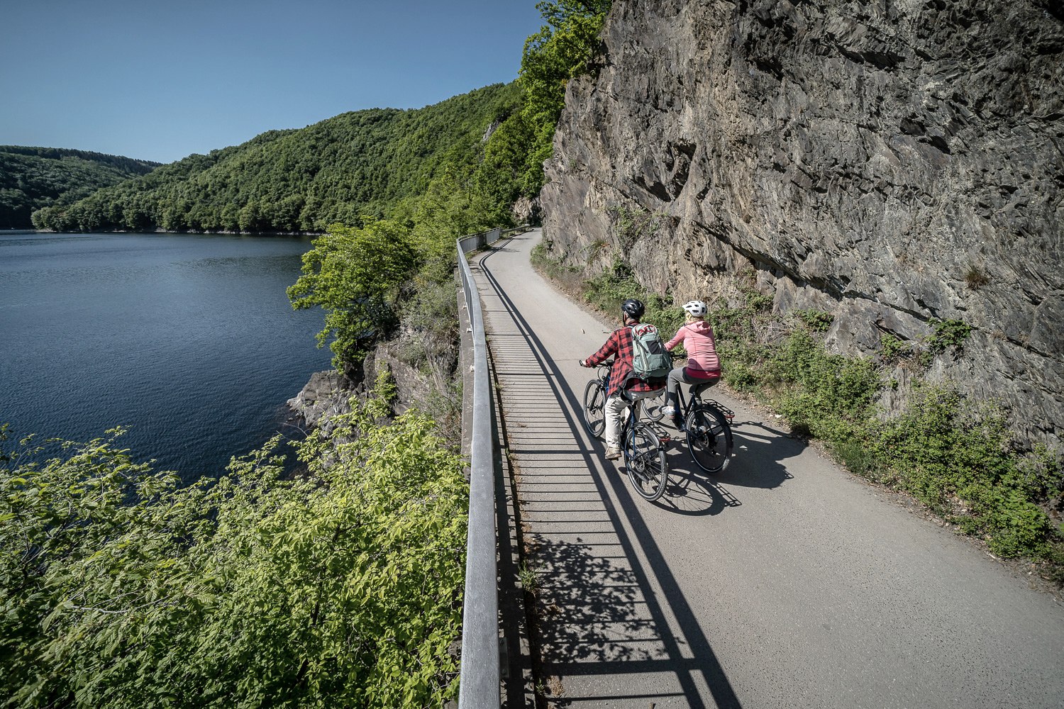 Schon radeln Sie entlang des dritten Sees, dem sogenannten Obersee. Die alte K 7 ist seit vielen Jahrzenten die Verbindung zwischen Rurberg und Gemünd. Der flache Teil der Stecke endet, wenn es hoch zur Urftseemauer geht. Auf dem Bauwerk gibt es Rast- und Ruhemöglichkeiten.