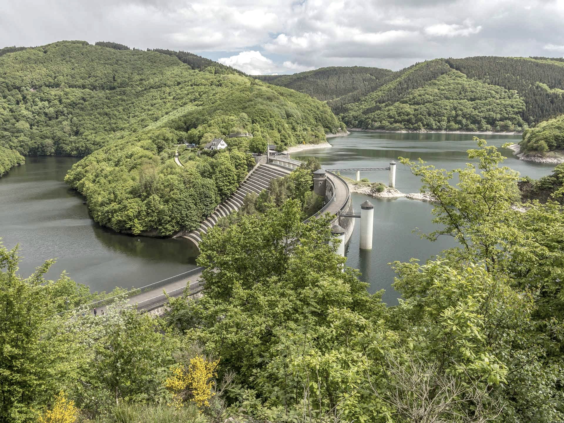 Unter Ihnen liegt der Obersee, weiter geht es entlang des nächsten Sees, dem Urftsee. Weiter folgen Sie der Routebis vor Ihnen eine moderne Brücke über die Urft auftaucht, die Victor von Neels-Brücke..