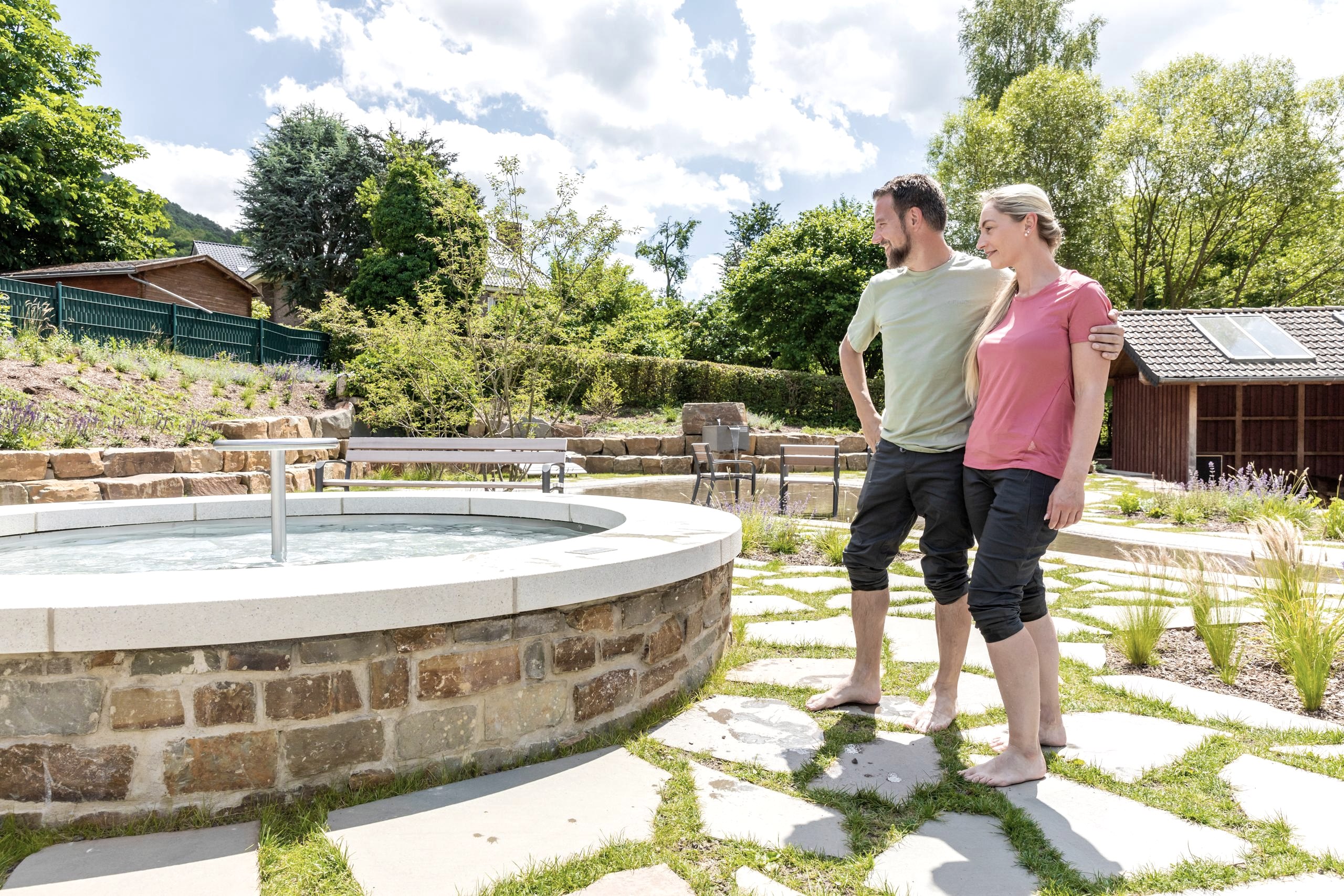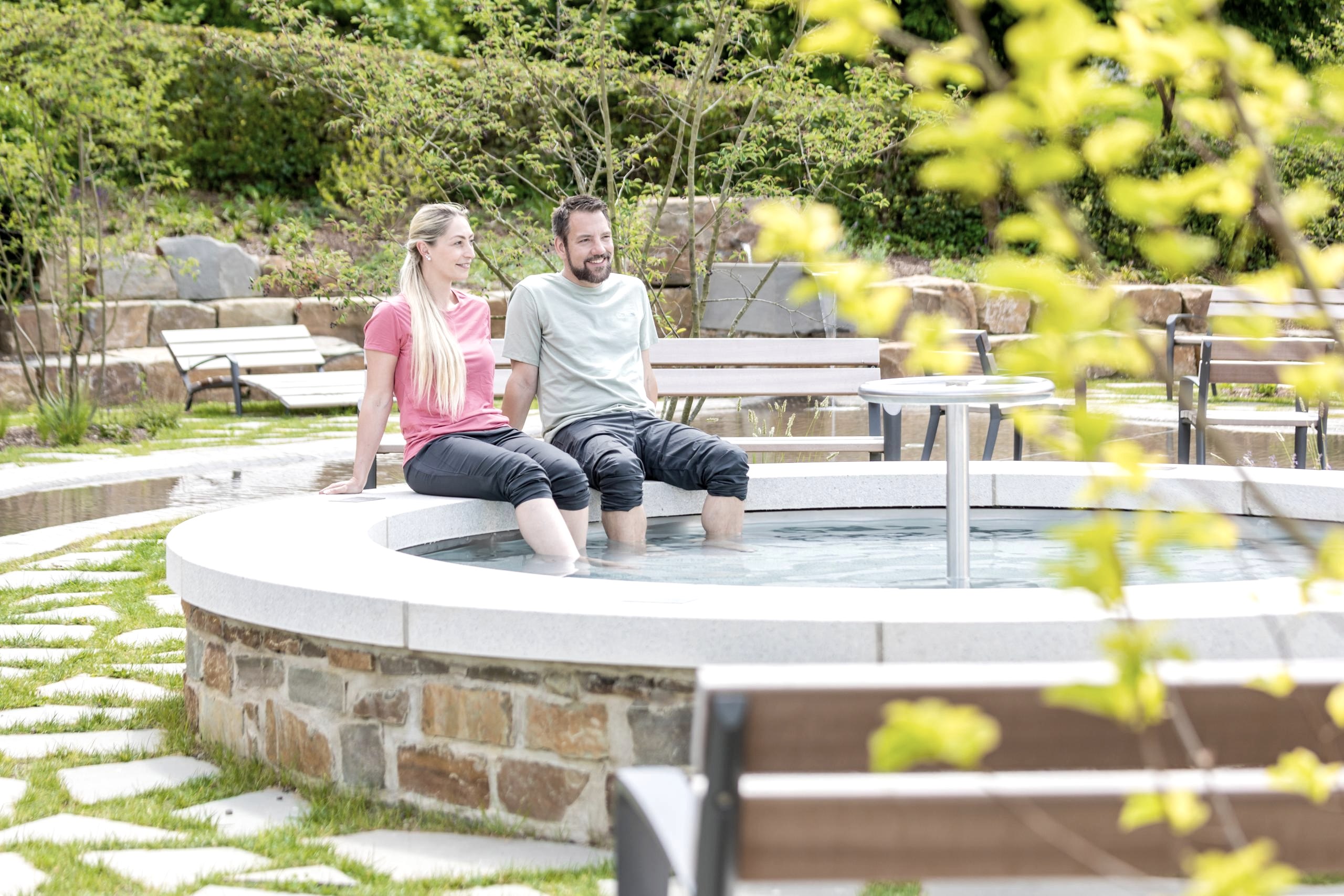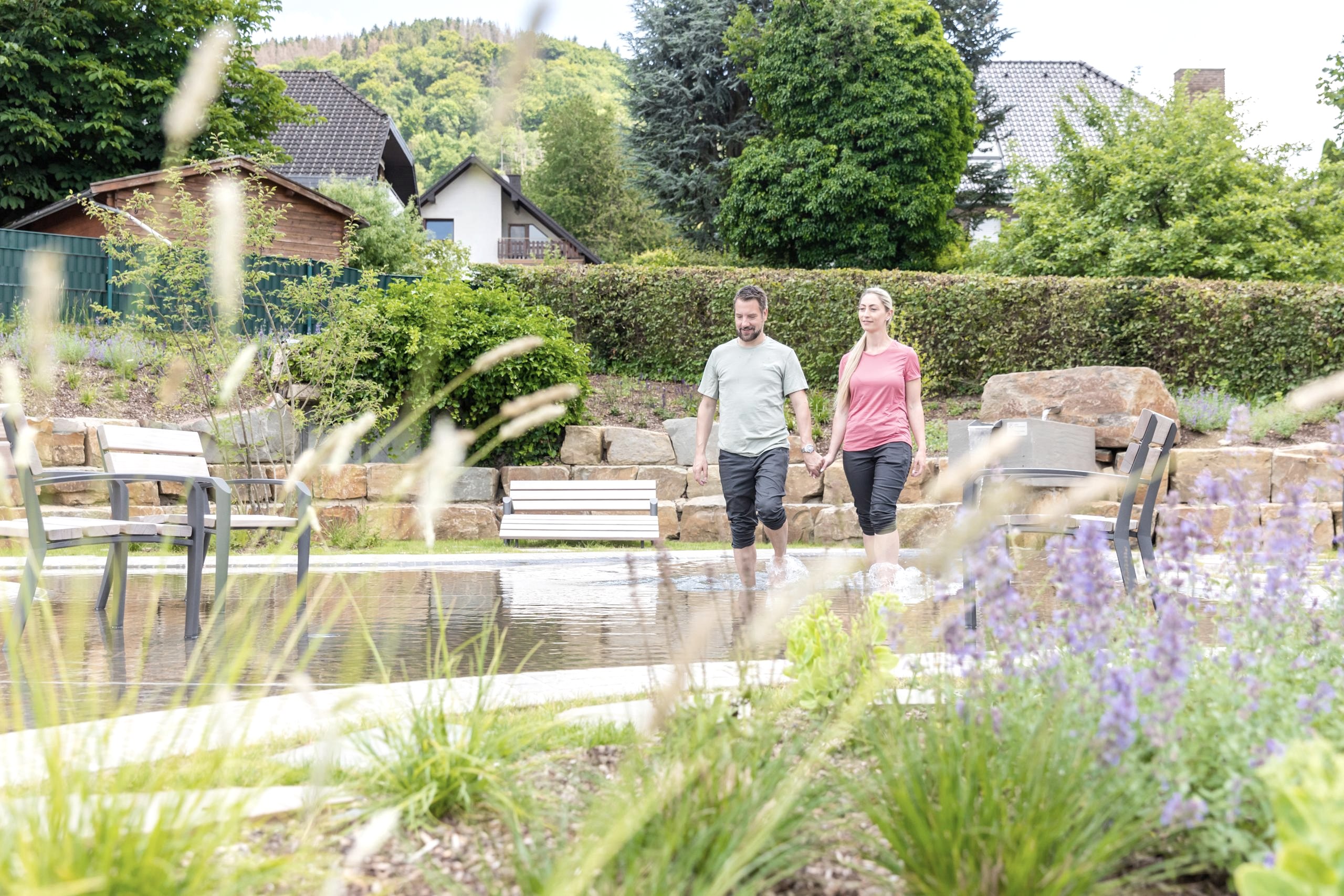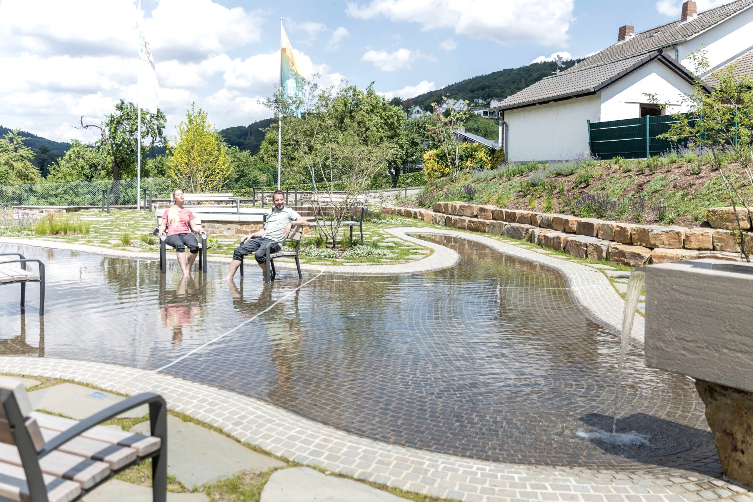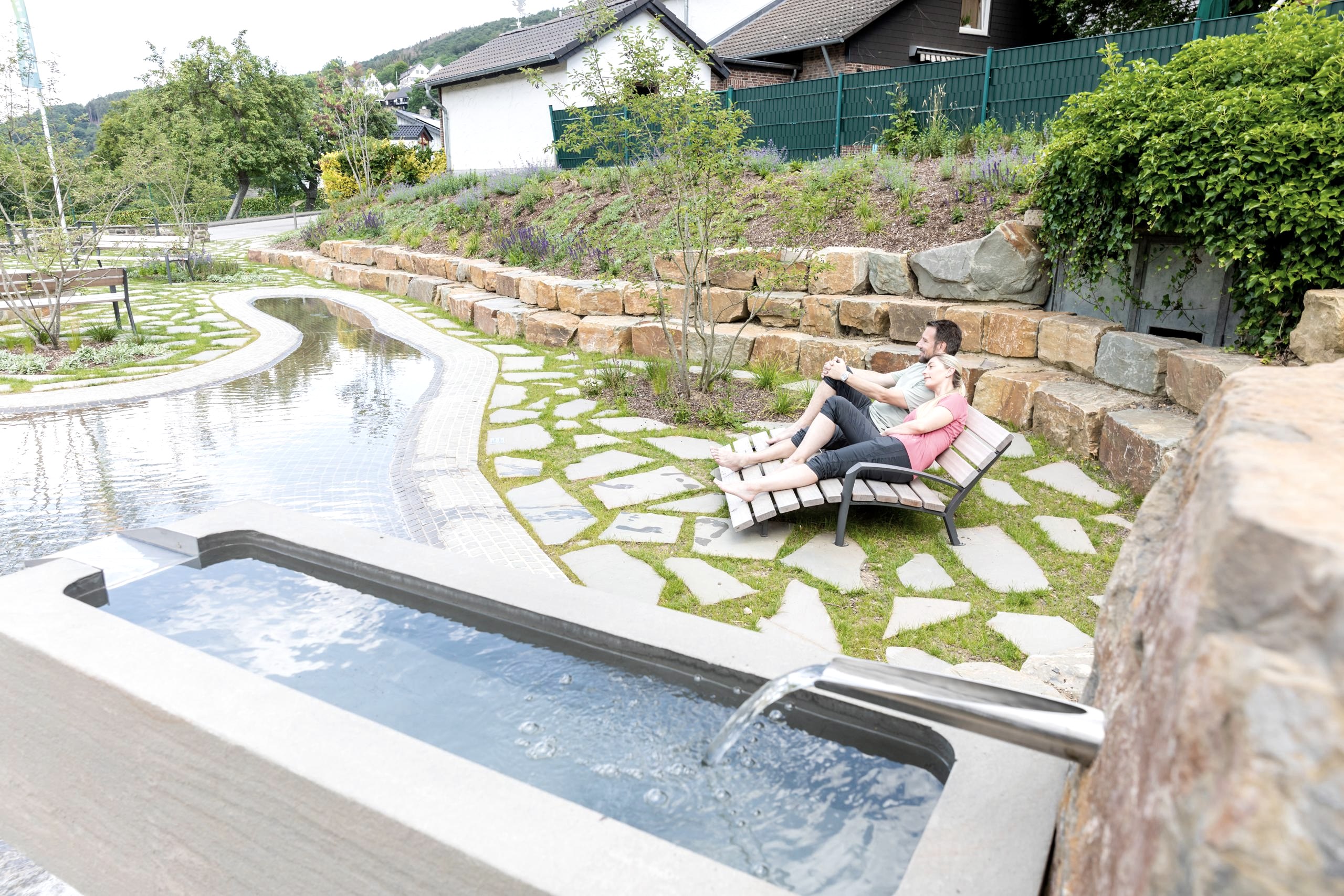 Verschiedene wasserbezogene Elemente laden nach einer langen Radtour aber auch Wanderung oder einfach an einem heißen Tag zum Erfrischen, Entspannen und Erholen ein. In der großen begehbaren Wasserfläche sowie einem kleineren Becken mit Sitzkante, lassen sich prima müde Füße erfrischen und ein extra Steinbecken ermöglicht eine ausgiebige entspannte Kühlung der Arme. Neben diesen Elementen stehen in der charmanten neu angelegten Grünanlage ausreichend Sitzgelegenheiten zum Ausruhen und gemütlichen Verweilen bereit.