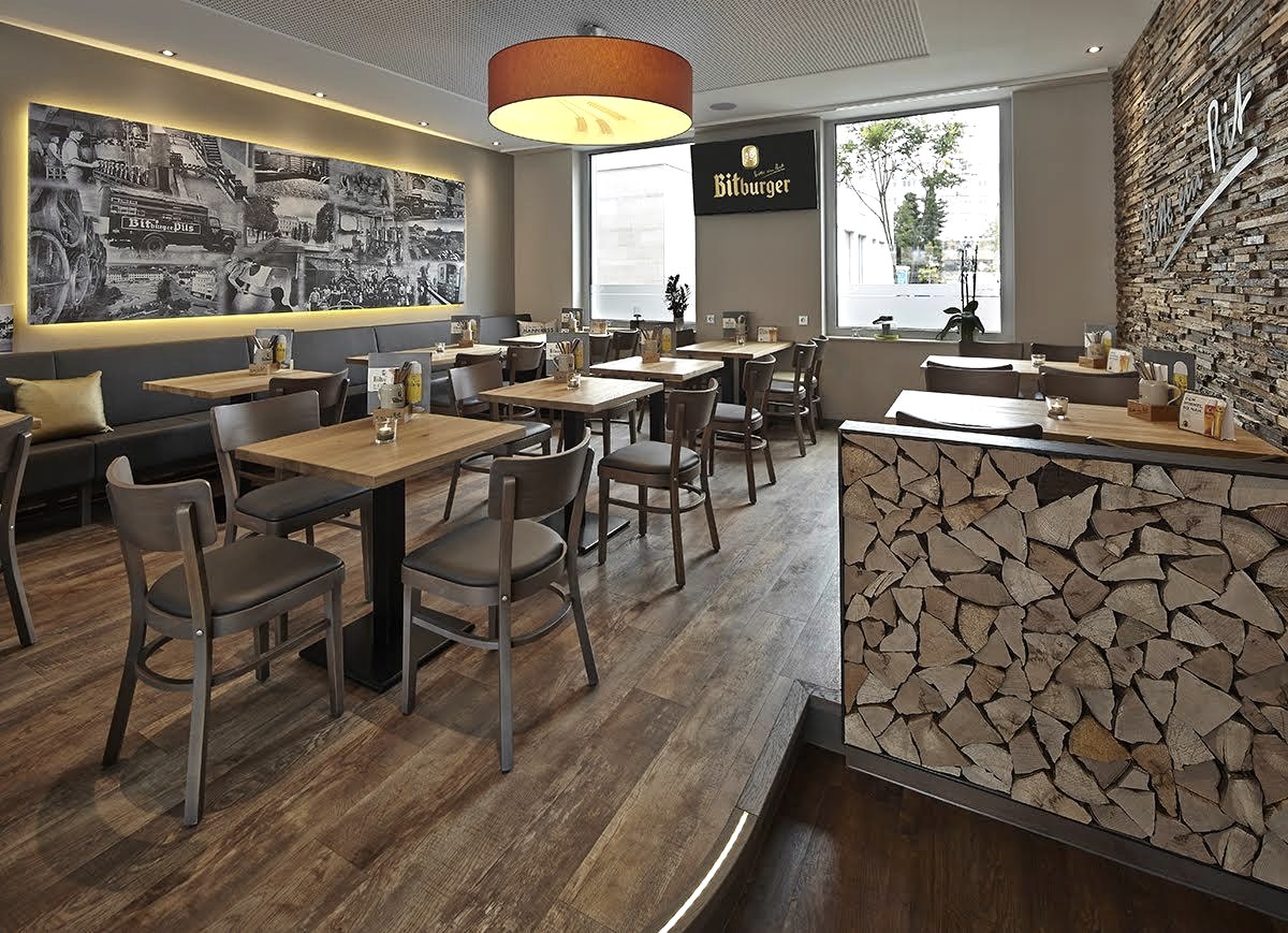 Enjoy a perfect tapped Bitburger Premium Pils, typical german food and snacks at the bar or in a cosy lounge area