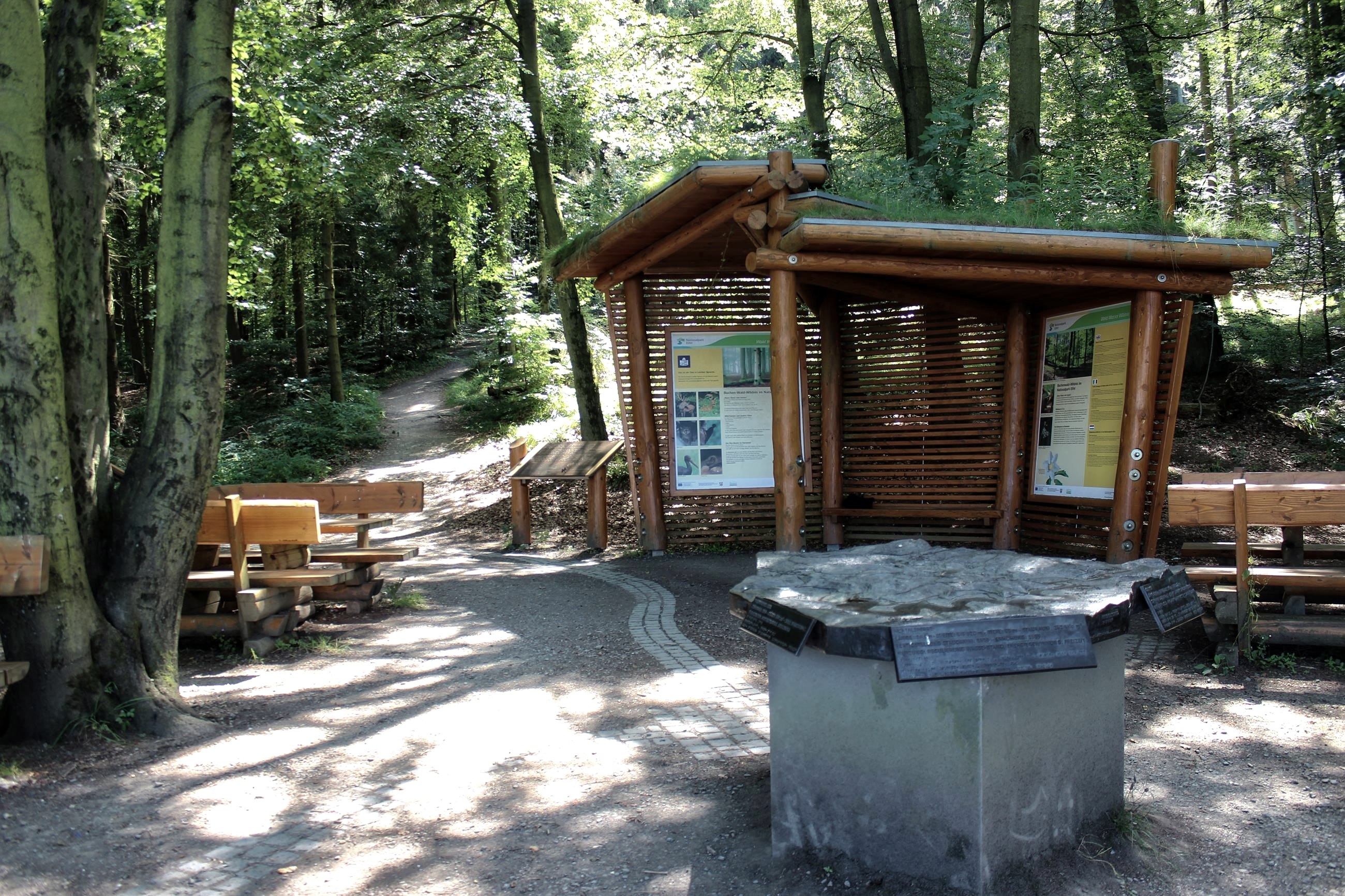 You will find the Eifel View "Hirschley" in the barrier-free nature experience area Wilder Kermeter, which is located in the middle of the Eifel National Park on the Kermeter mountain ridge. There, old and young visitors with and without disabilities can experience the "ecological heart" of the National Park. Native red beech mixed forests grow over a large area on the ridge between Lake Rursee and Lake Urftsee. Situated in the middle of it all, the Wild Kermeter comprises a barrier-free network of paths.
