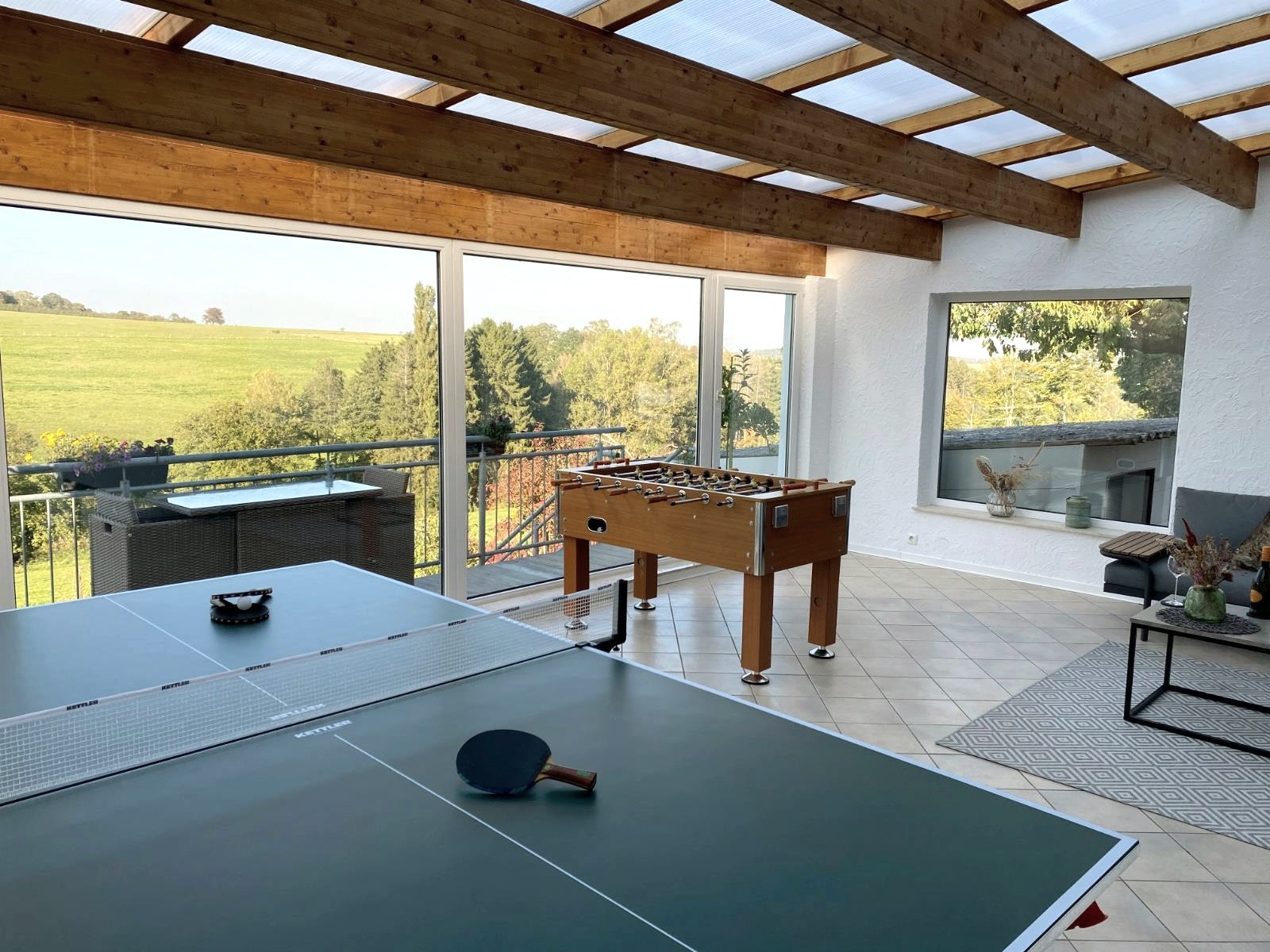 Tastefully and comfortably furnished vacation home on the outskirts of the village. With 120 m² of living space plus a 33 m² conservatory (unheated) with lounge corner, table football, dartboard and table tennis table, every guest will quickly find their favorite spot.