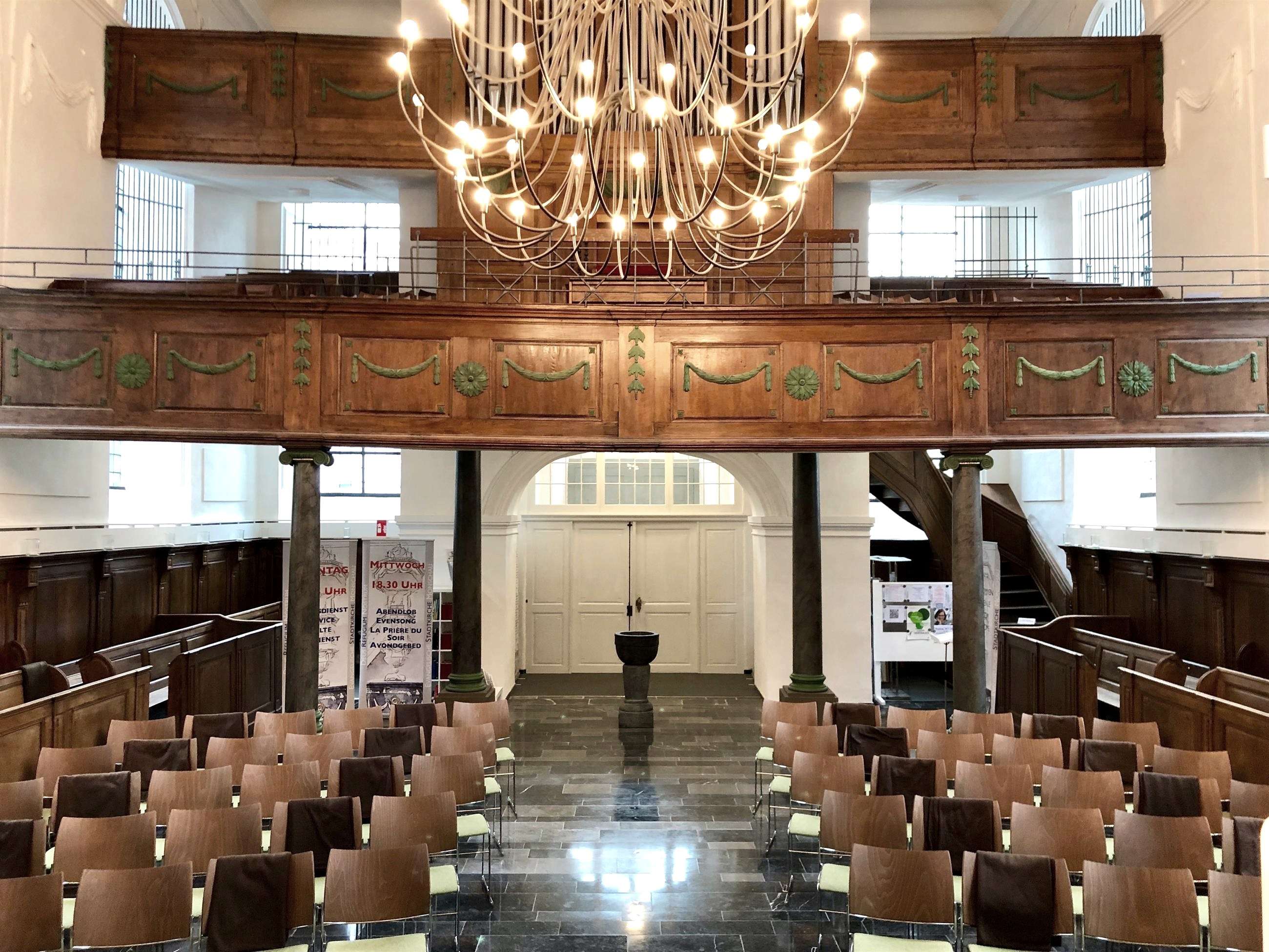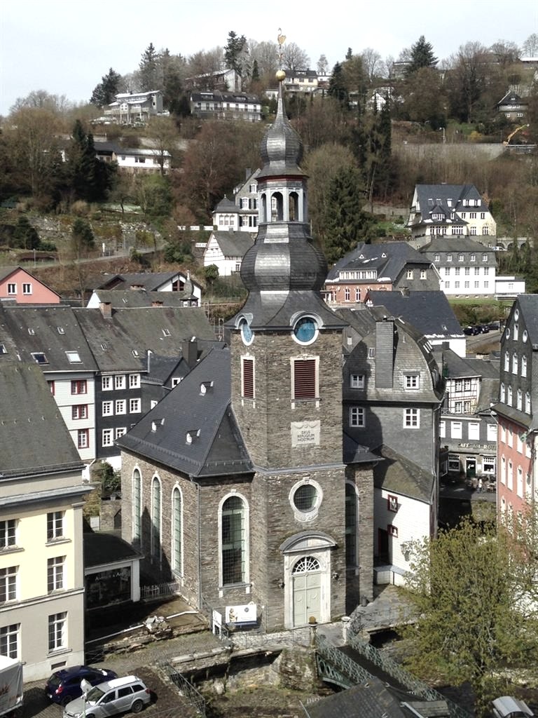 The listed Evangelical City Church is located in the heart of Monschau directly on the Rur. Its construction began in 1787 by the then extraordinarily wealthy Lutheran cloth makers. In 1789 the church was opened with a solemn service and was finally completed in 1810 after the installation of two galleries and an organ. The richly executed interior forms a clear contrast to the rather simple exterior. The festively designed hall is aligned with the choir, which is raised by two flat steps and which is given a very special character by the two unusual box cabinets on both sides of the artfully carved pulpit. It is equipped with precious stucco work in the style of "Louis-seize" on the mirrored ceiling and on the walls. Its very rare design and furnishings in the "Louis-seize" style and its relevance as a testimony to the cultural, social and economic history of the city had resulted in the church being named a "building of national importance" by the German Bundestag . It was named "City Church of the Year 2012" by the "Foundation for the Preservation of Church Monuments in Germany (KiBa)". It is one of the cultural churches in the EKD area. The town church is usually open from "Easter to October" from 11 a.m. to 5 p.m. and for church services.