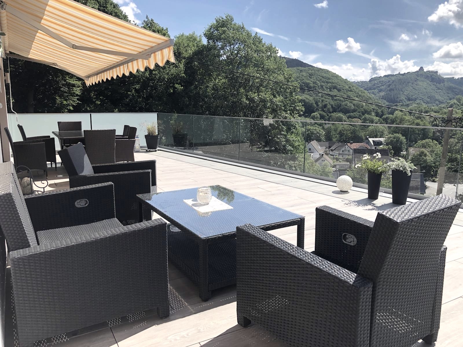 The detached vacation home was completely renovated in 2019 and furnished with a lot of love and high standards. It has a new, fully equipped modern kitchen with dishwasher, coffee machine, large fridge, stove and oven. In the large living room is the dining area with a large dining table. The living room is furnished with a very nice modern, extendable couch, a flat screen TV, a music system and a fireplace. Furthermore, there are 2 bedrooms. Both with a double bed and 1 bedroom has an additional full bed. There is a bathroom with shower, WC and basin and a guest WC. In front of the house there is a lounge area and the absolute best thing is the 100 square meter roof terrace with a wonderful view of Nideggen Castle. Bed linen and towels are provided by us. Parking is available in front of the house.