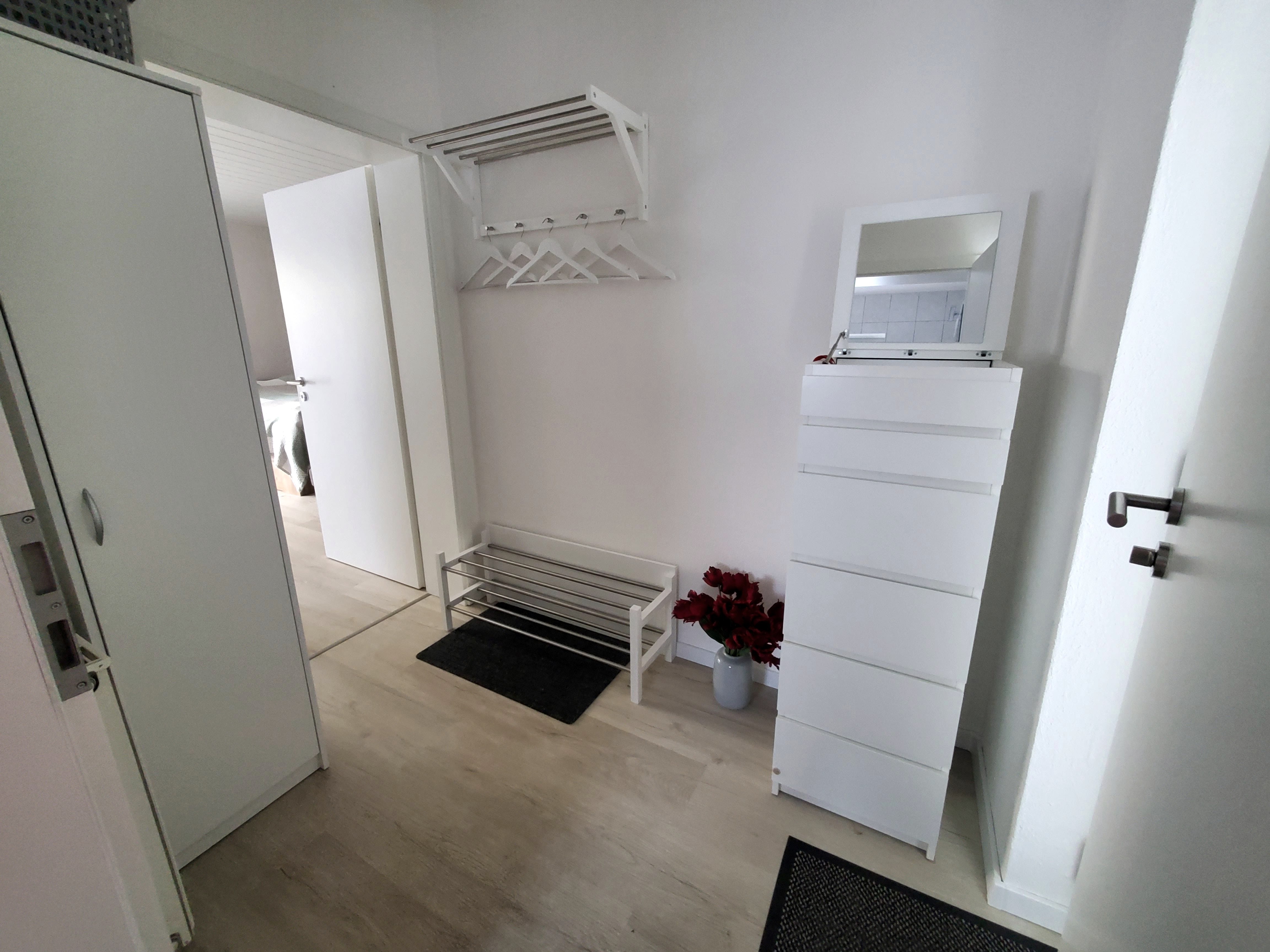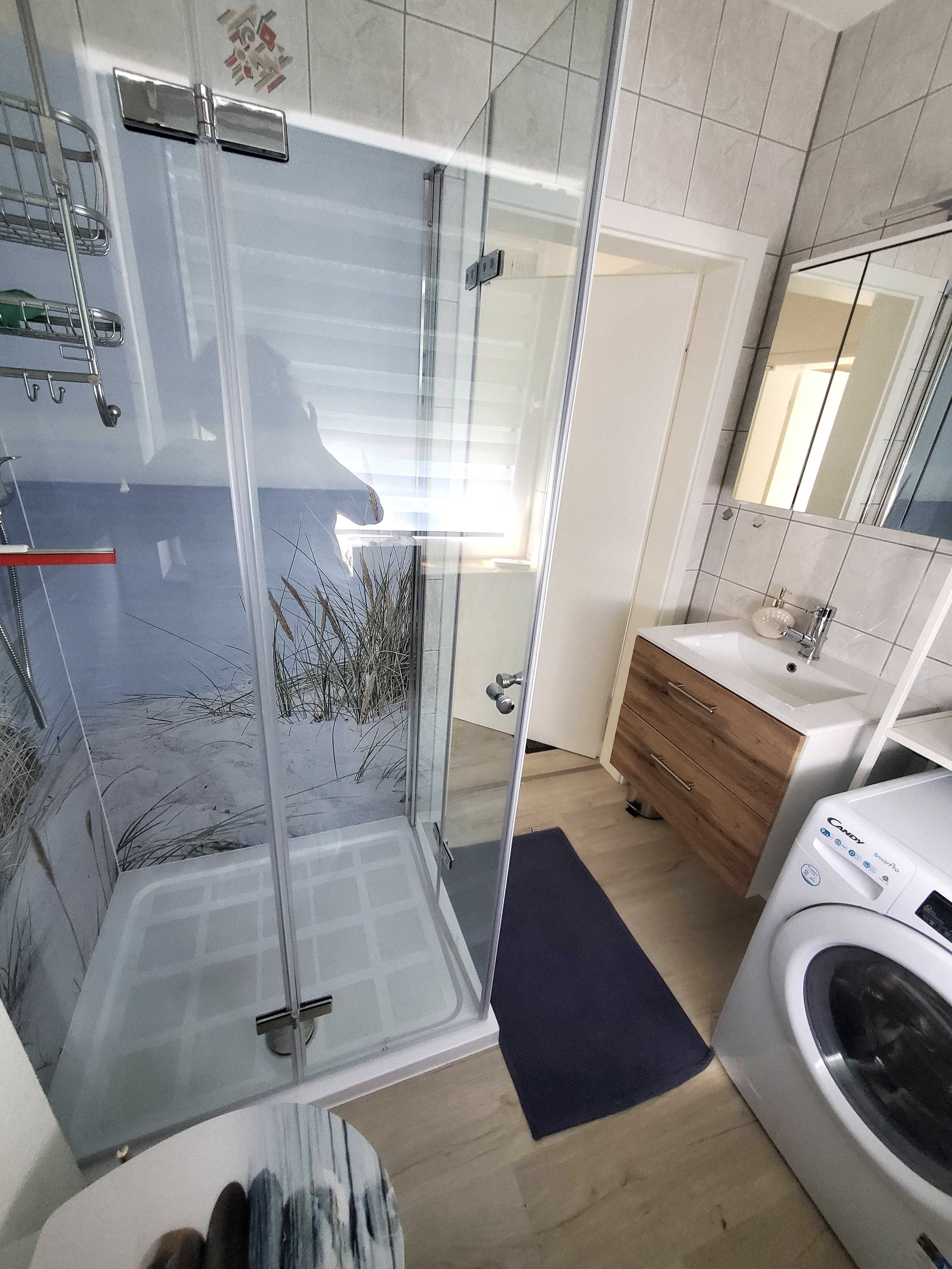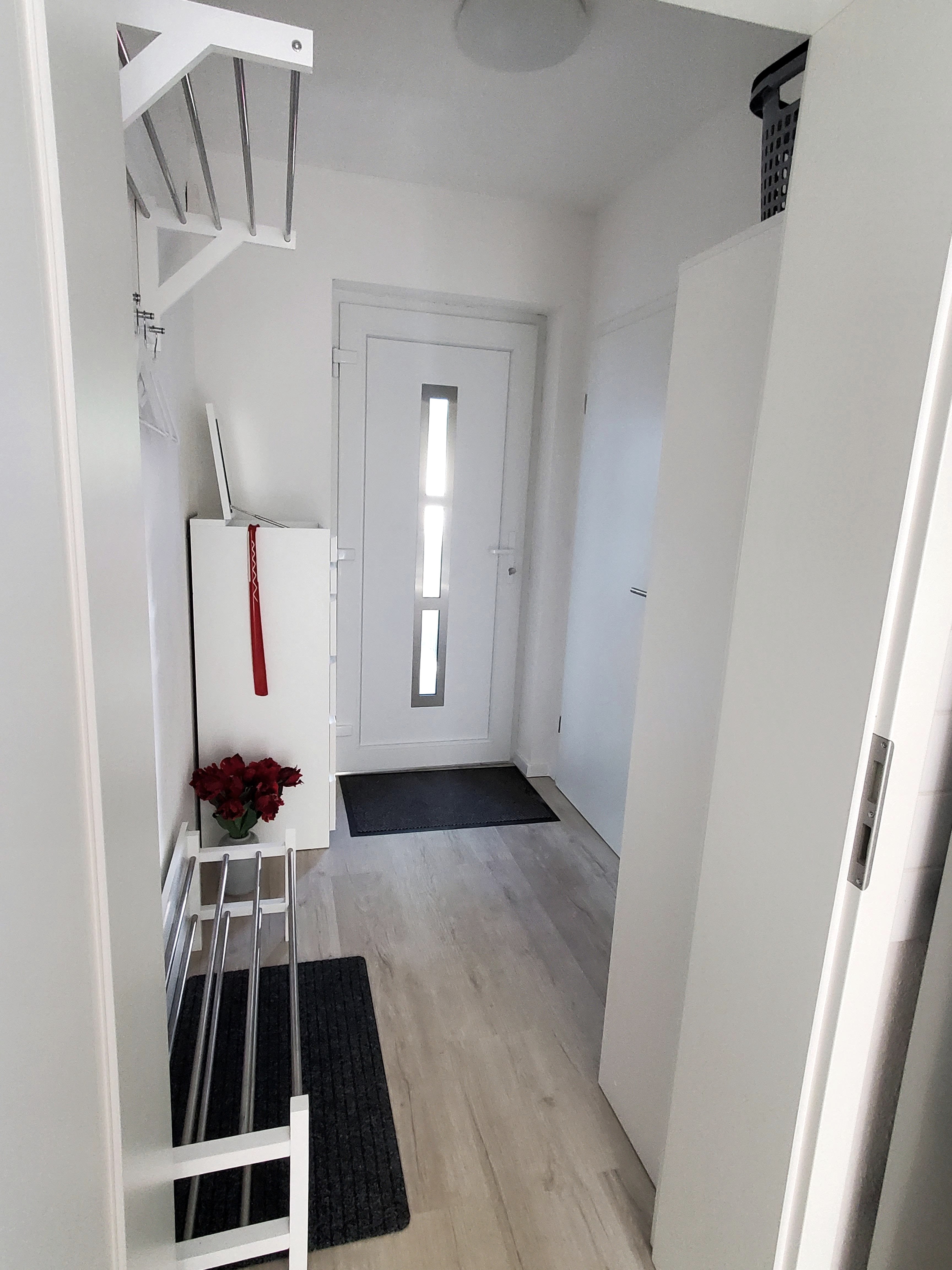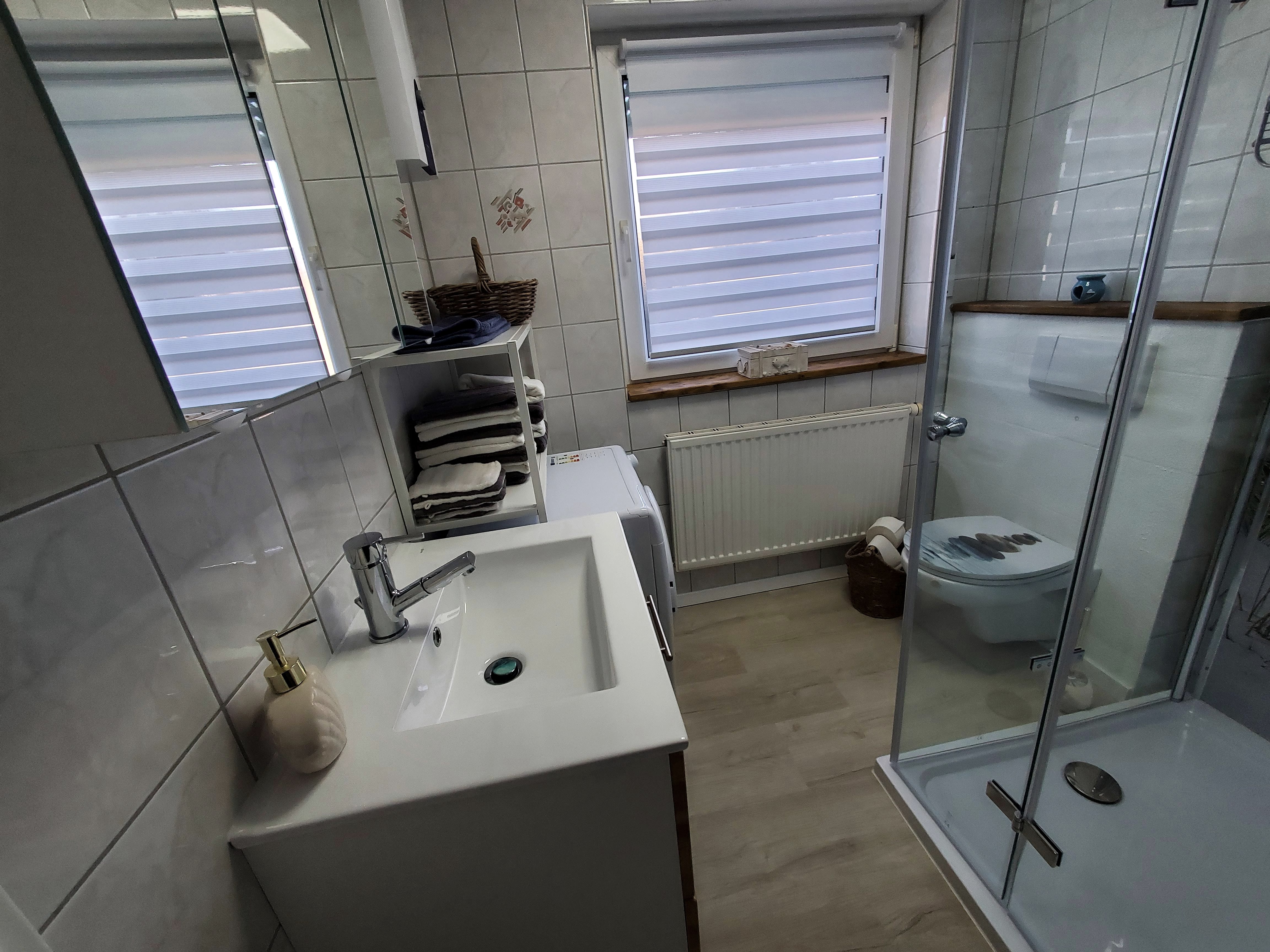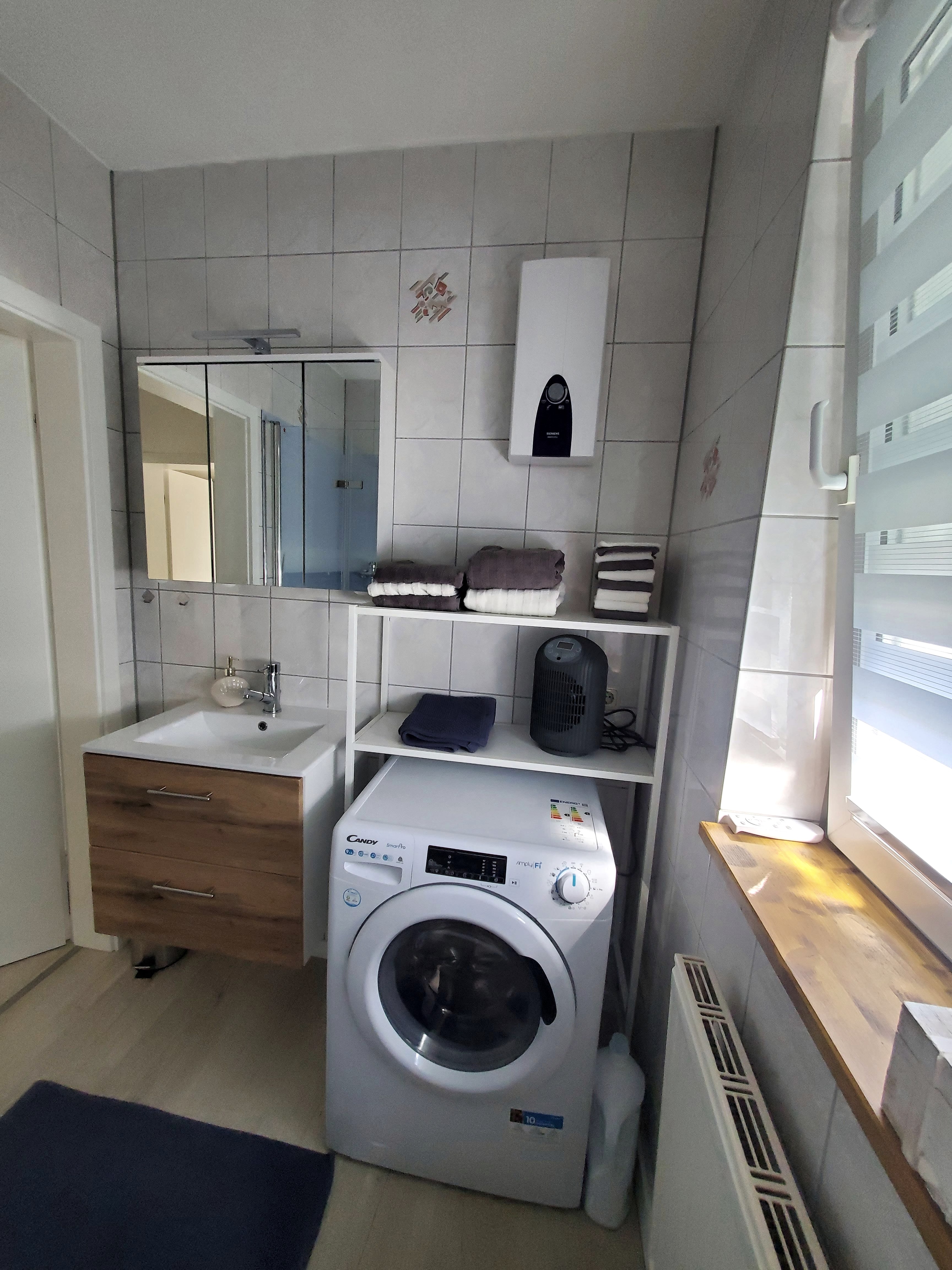 - Hallway, bathroom with WC, shower, washbasin, hairdryer, washer-dryer
