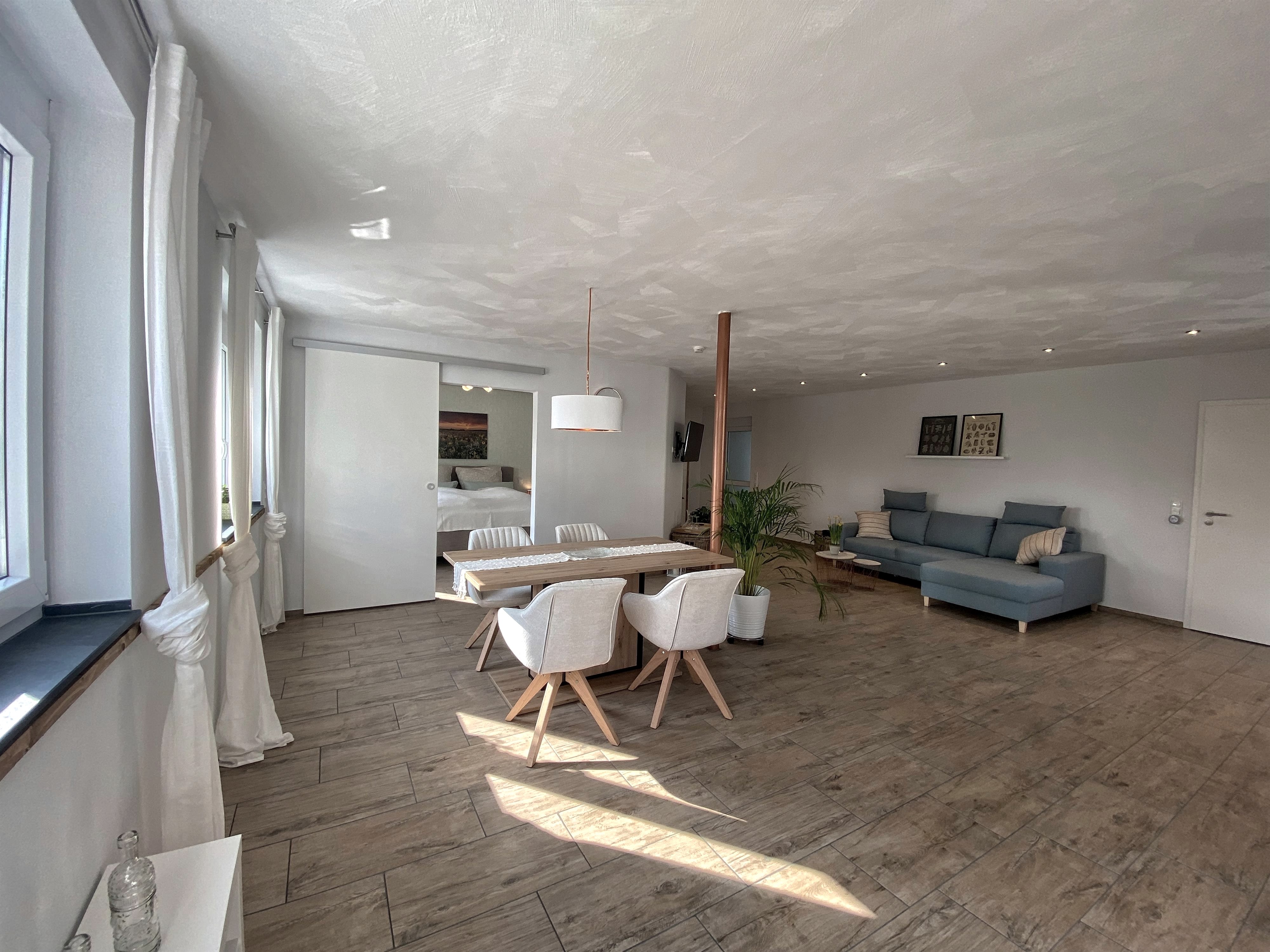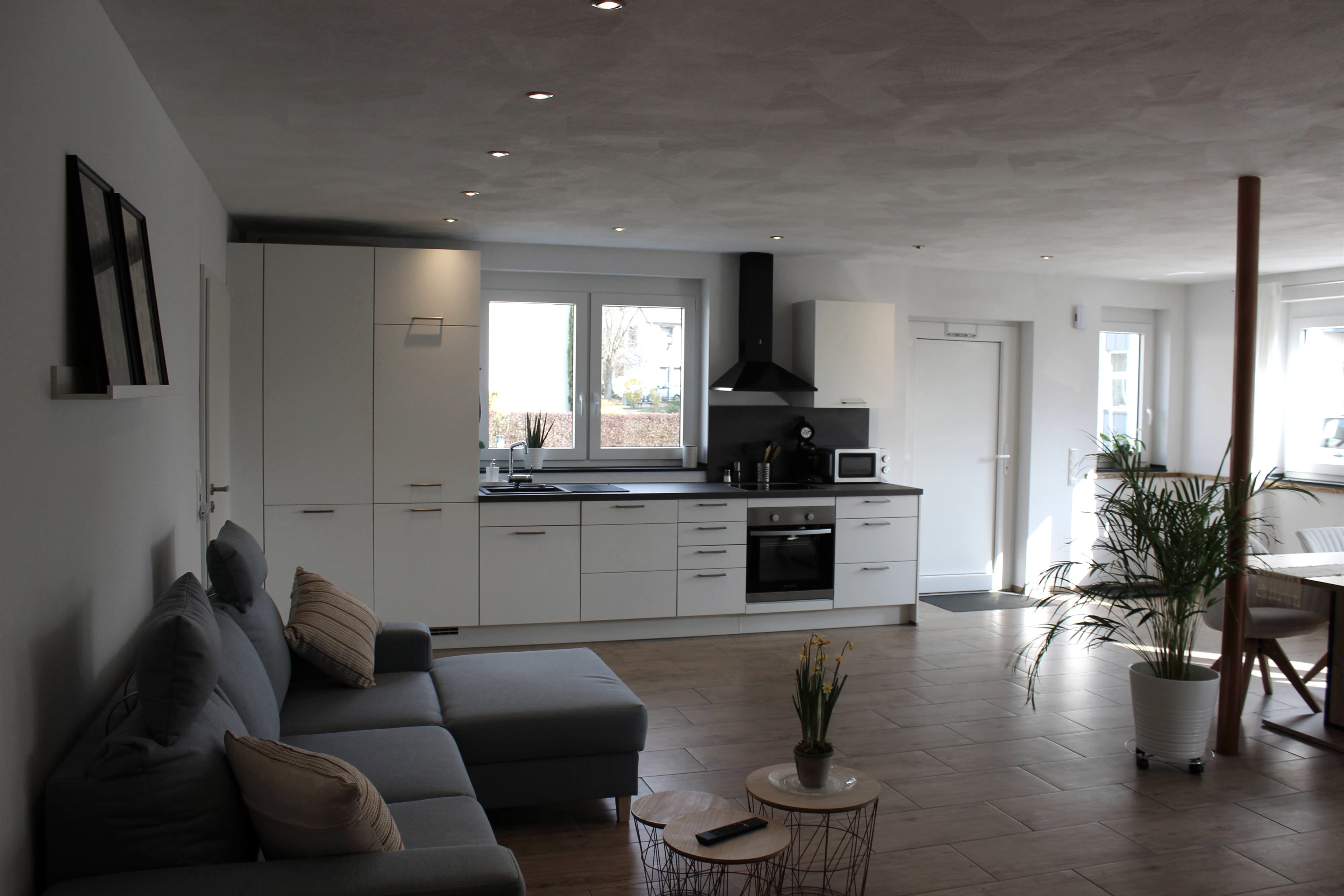 Newly built in 2021, the 75 m² apartment offers an open-plan kitchen/living/dining area, a bedroom with a large box-spring bed and a modern bathroom.