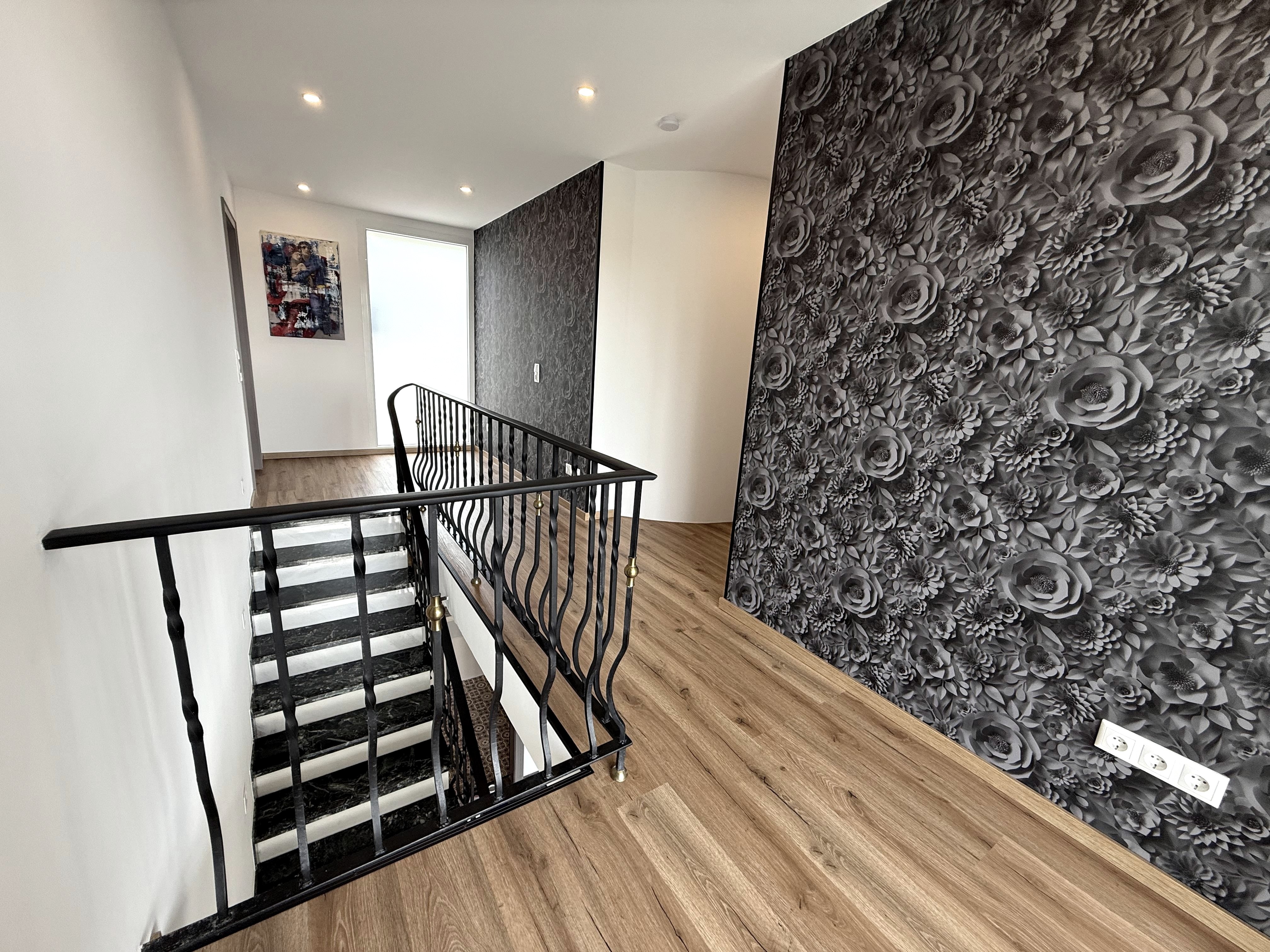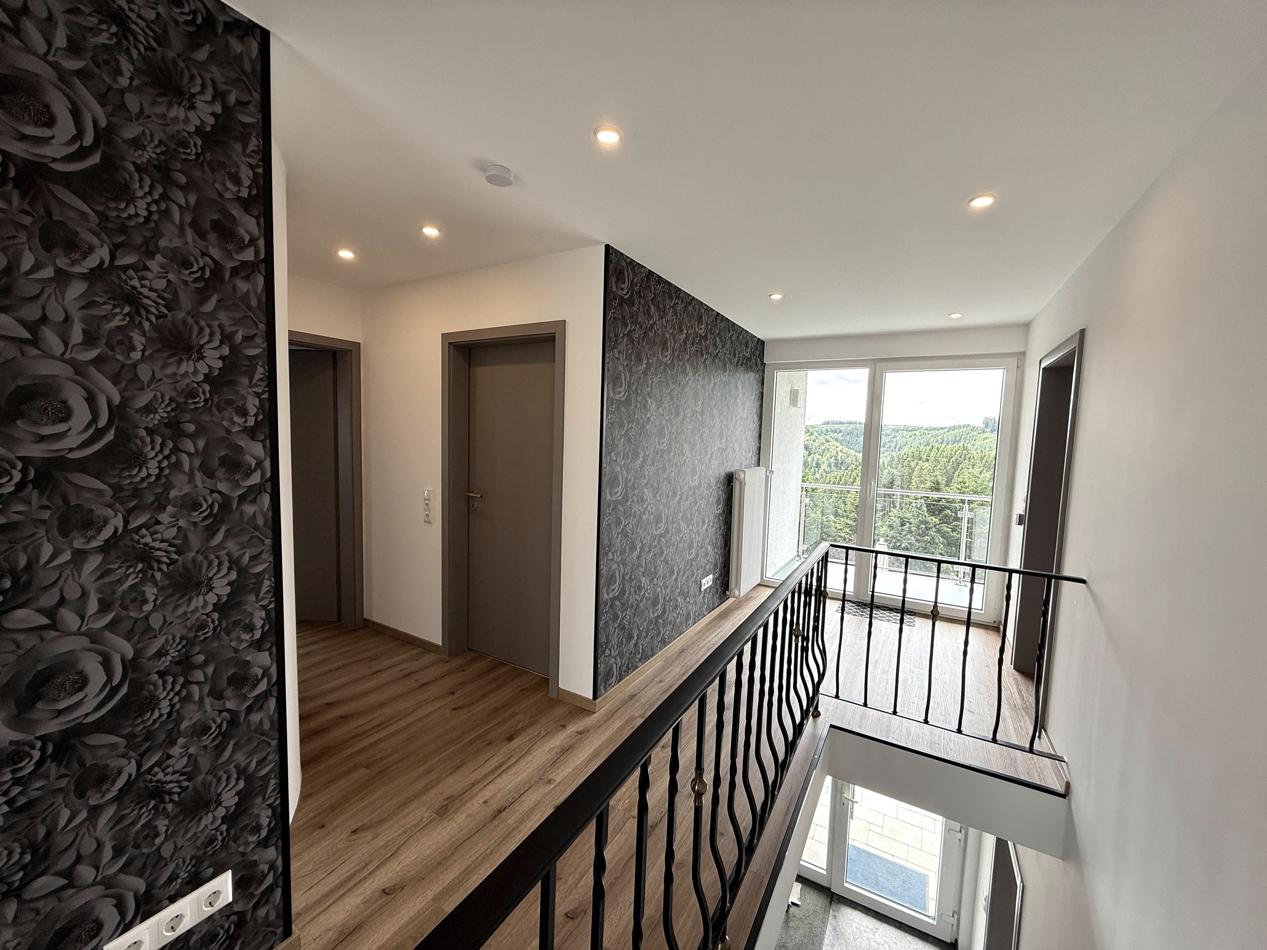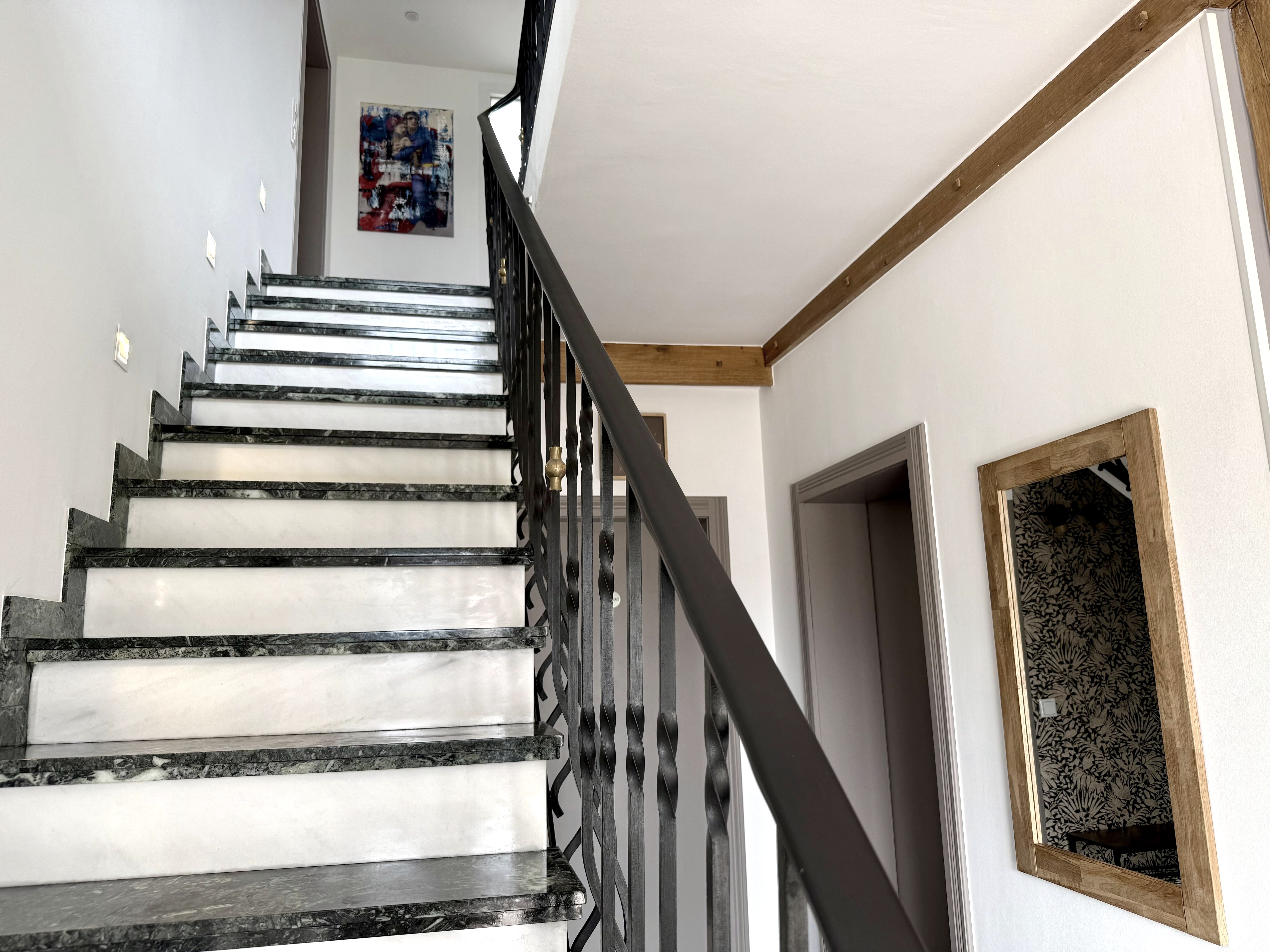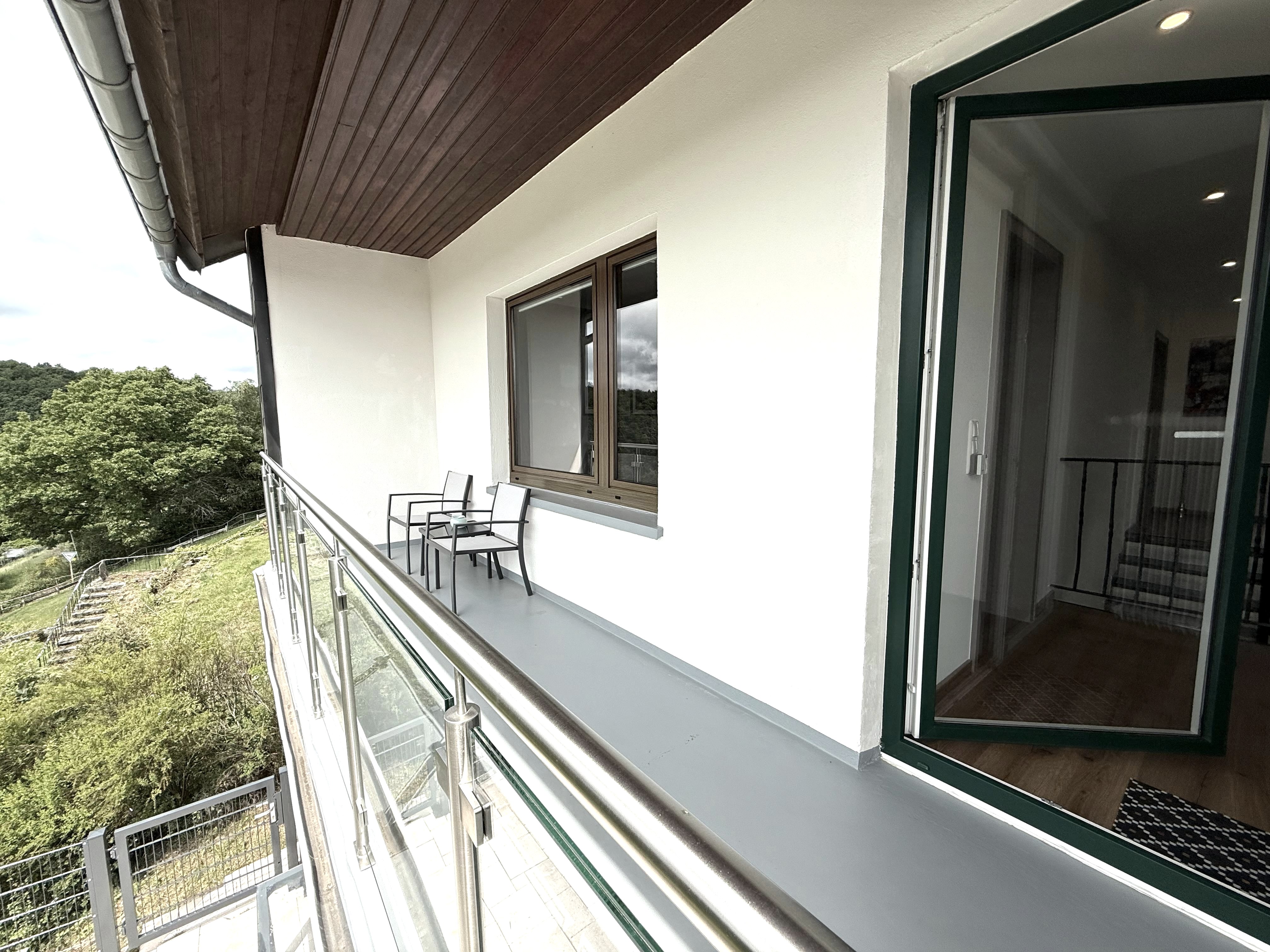 From the upper hallway, you can access the spacious balcony, which is furnished with a small table and two seats. Here you can enjoy the fresh air and the view.