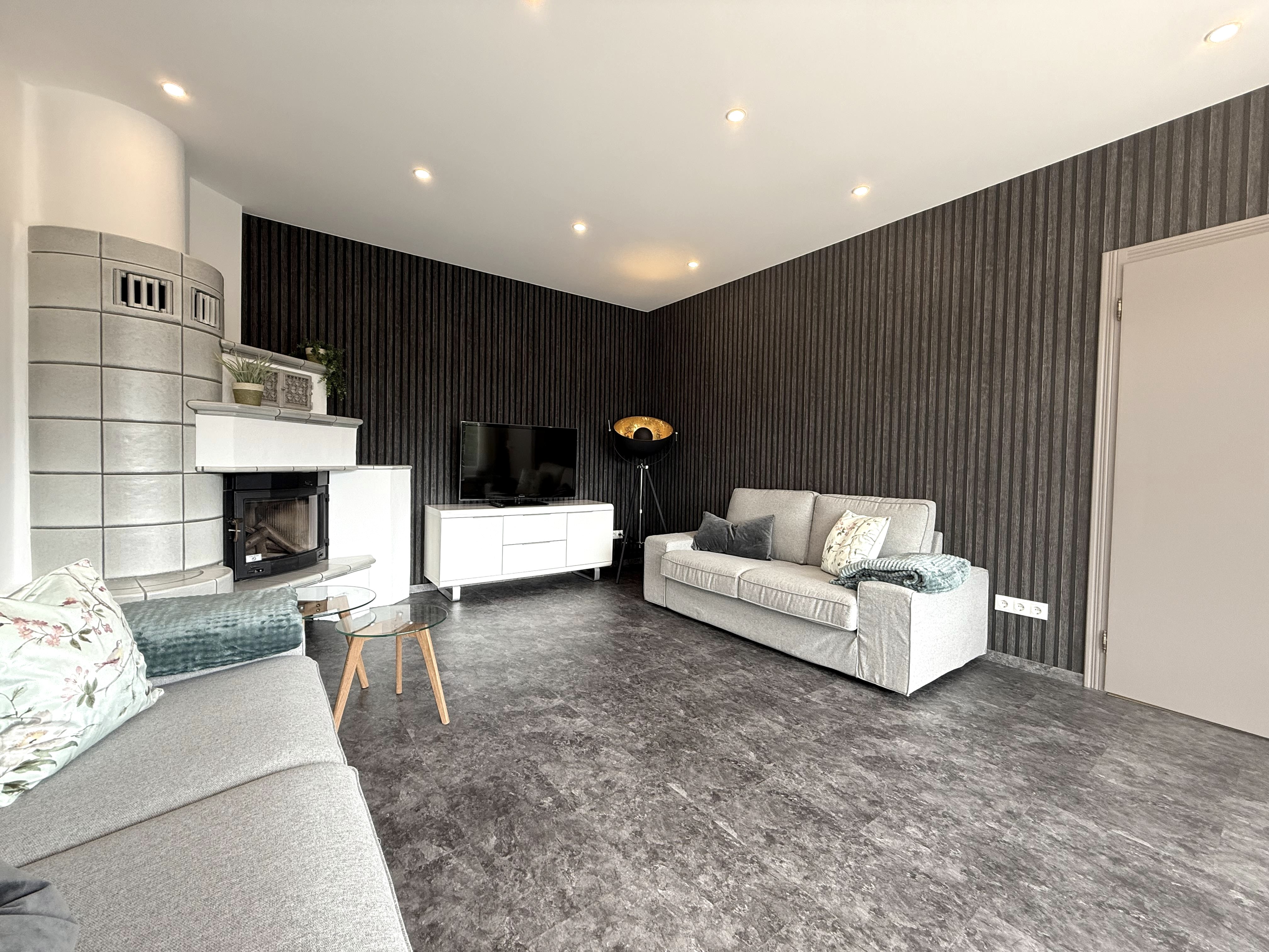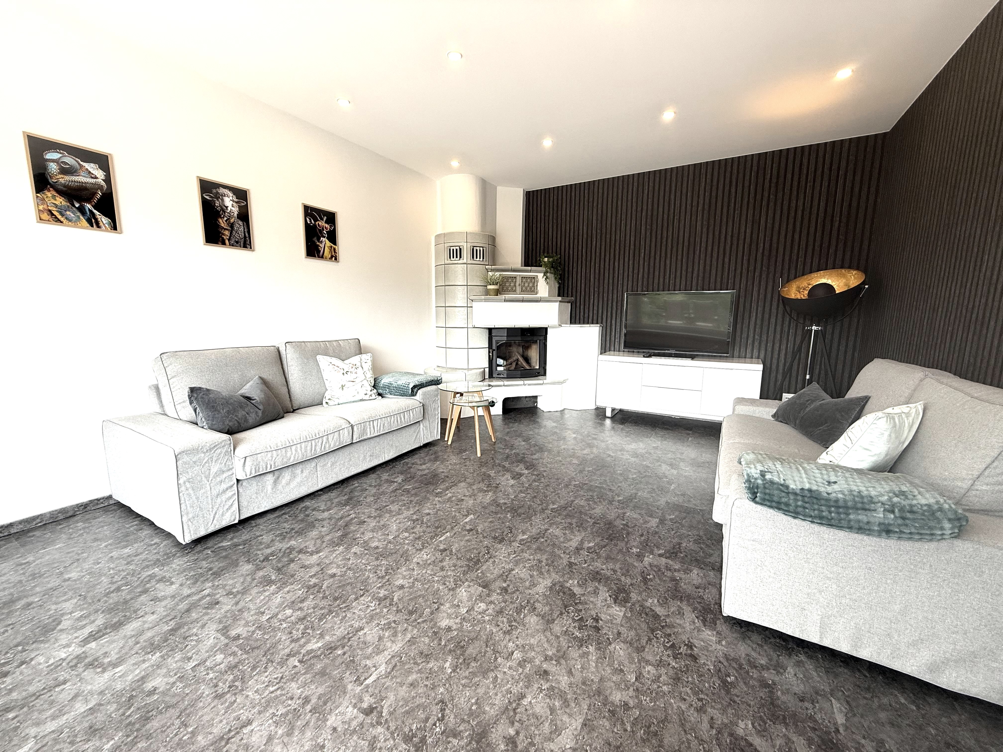 The cozy living room is furnished with two sofas, a flat-screen TV and a decorative tiled stove. Here you can spend relaxing evenings and enjoy the view of the greenery.