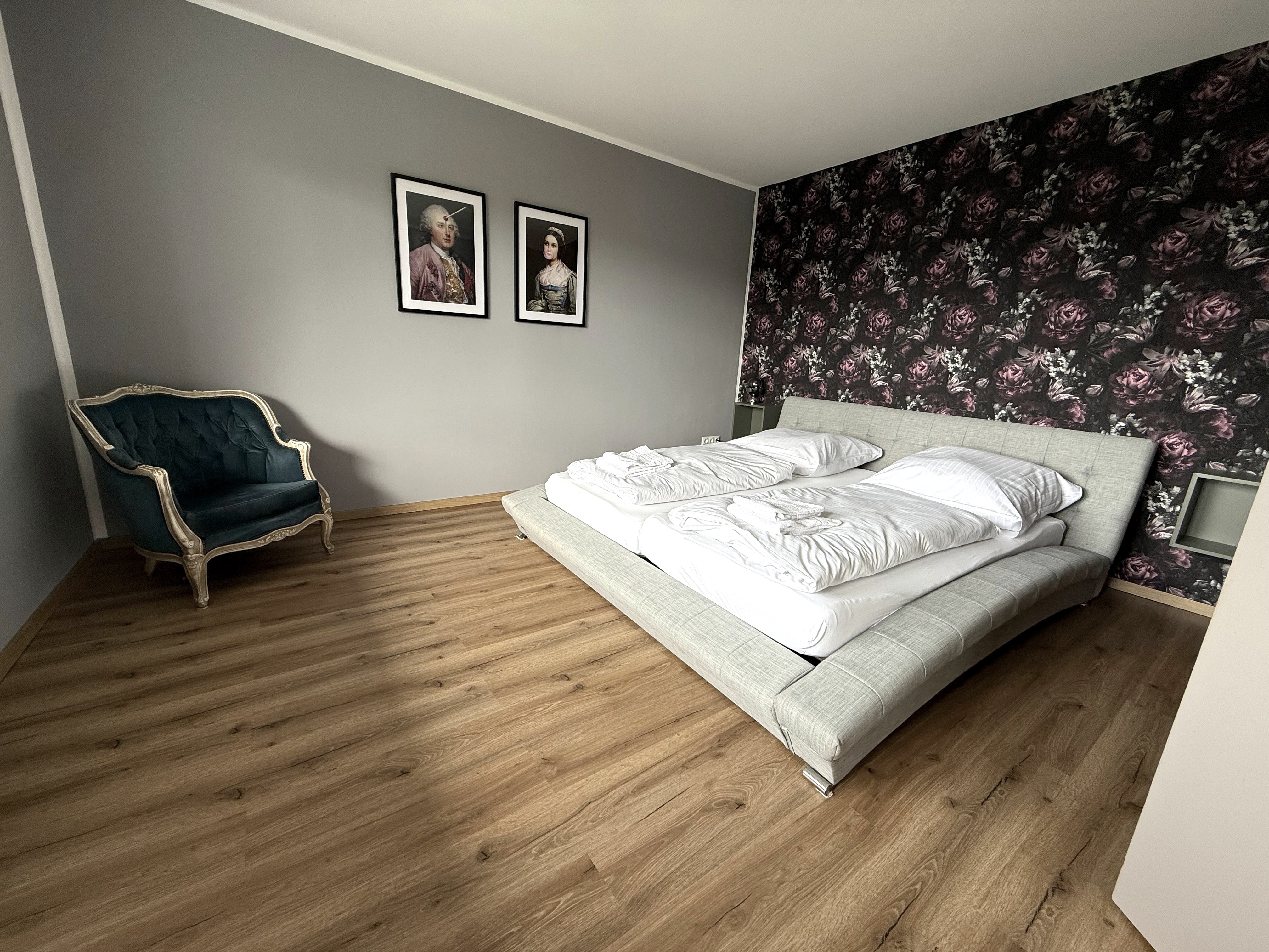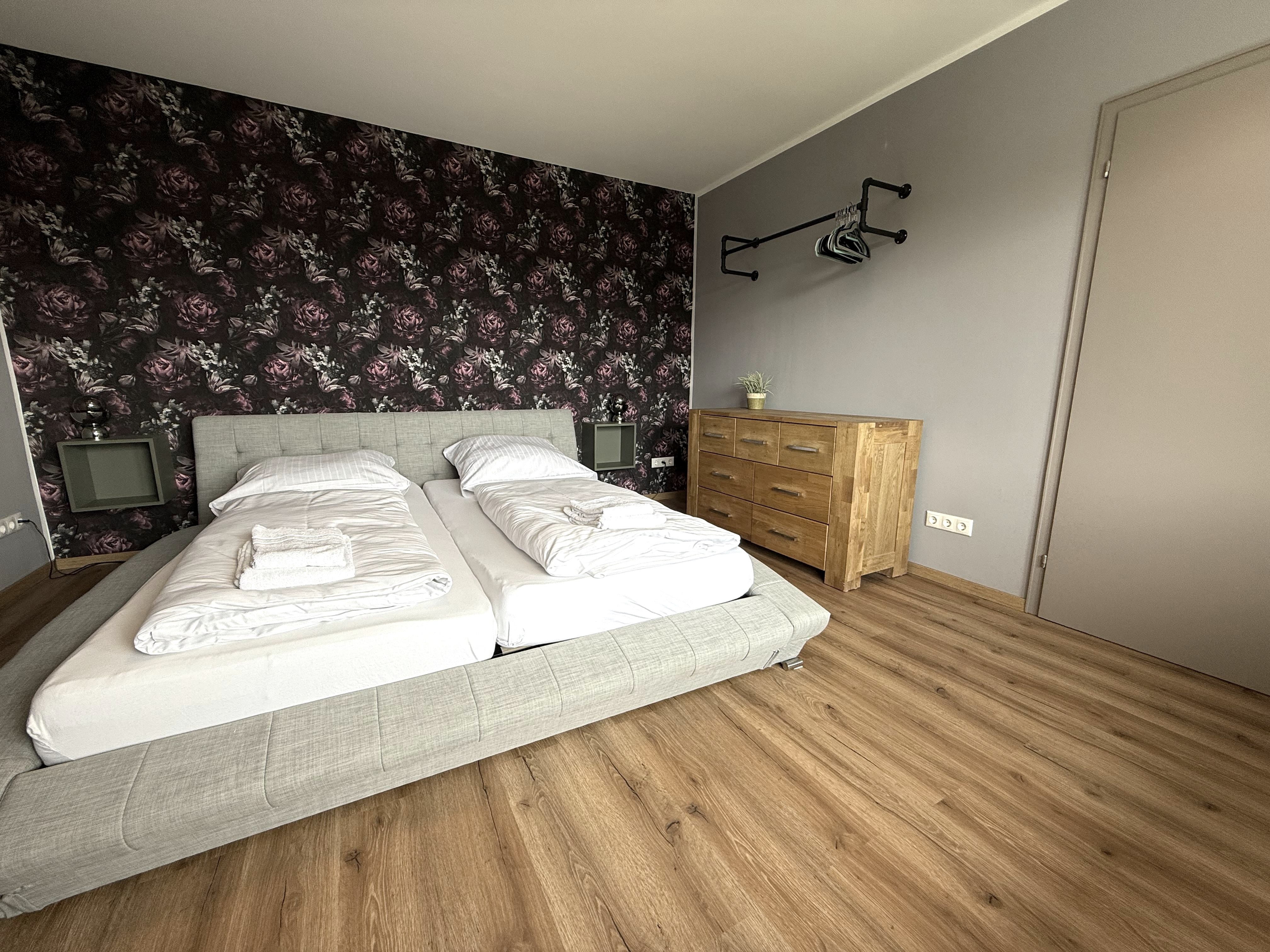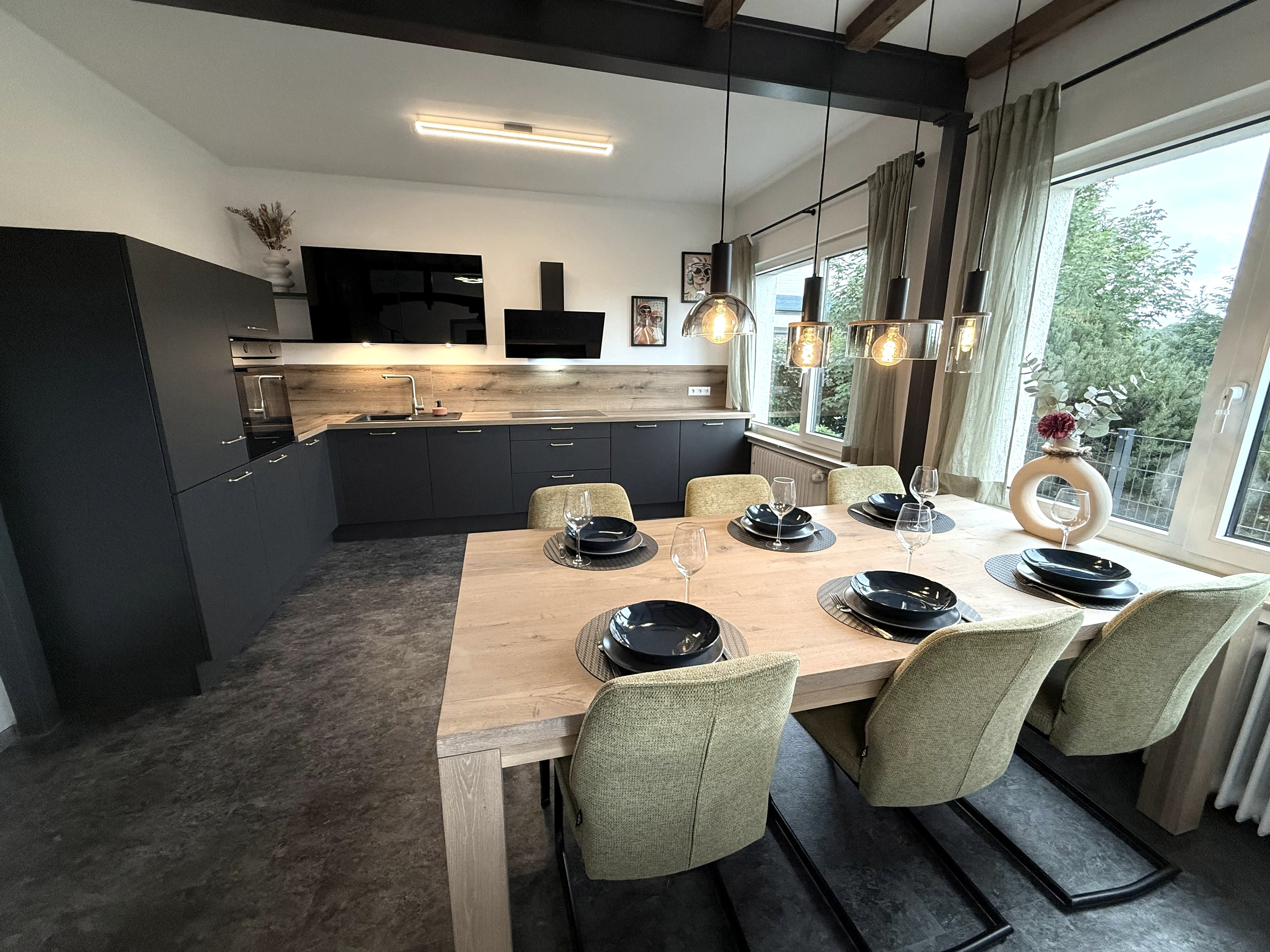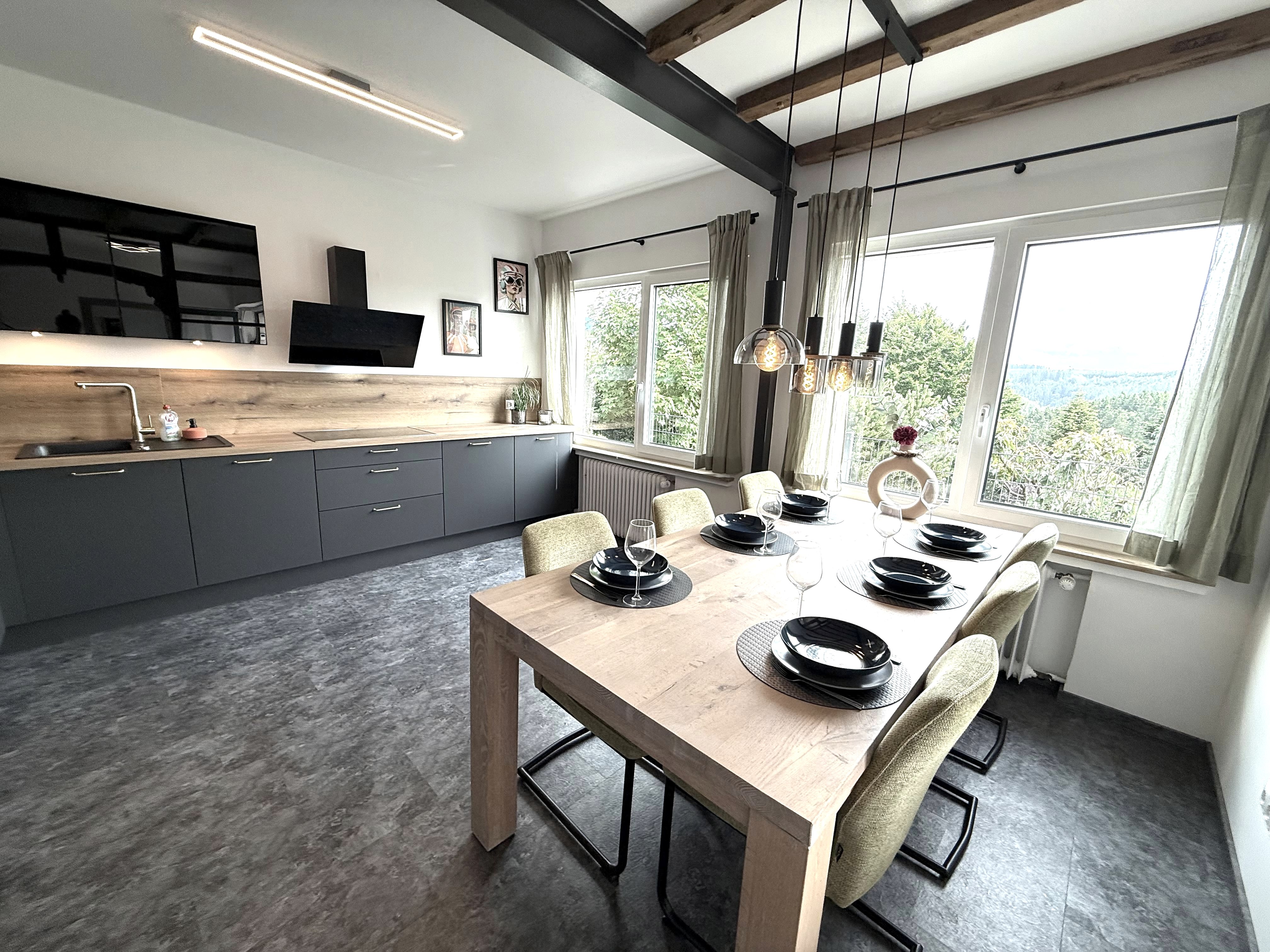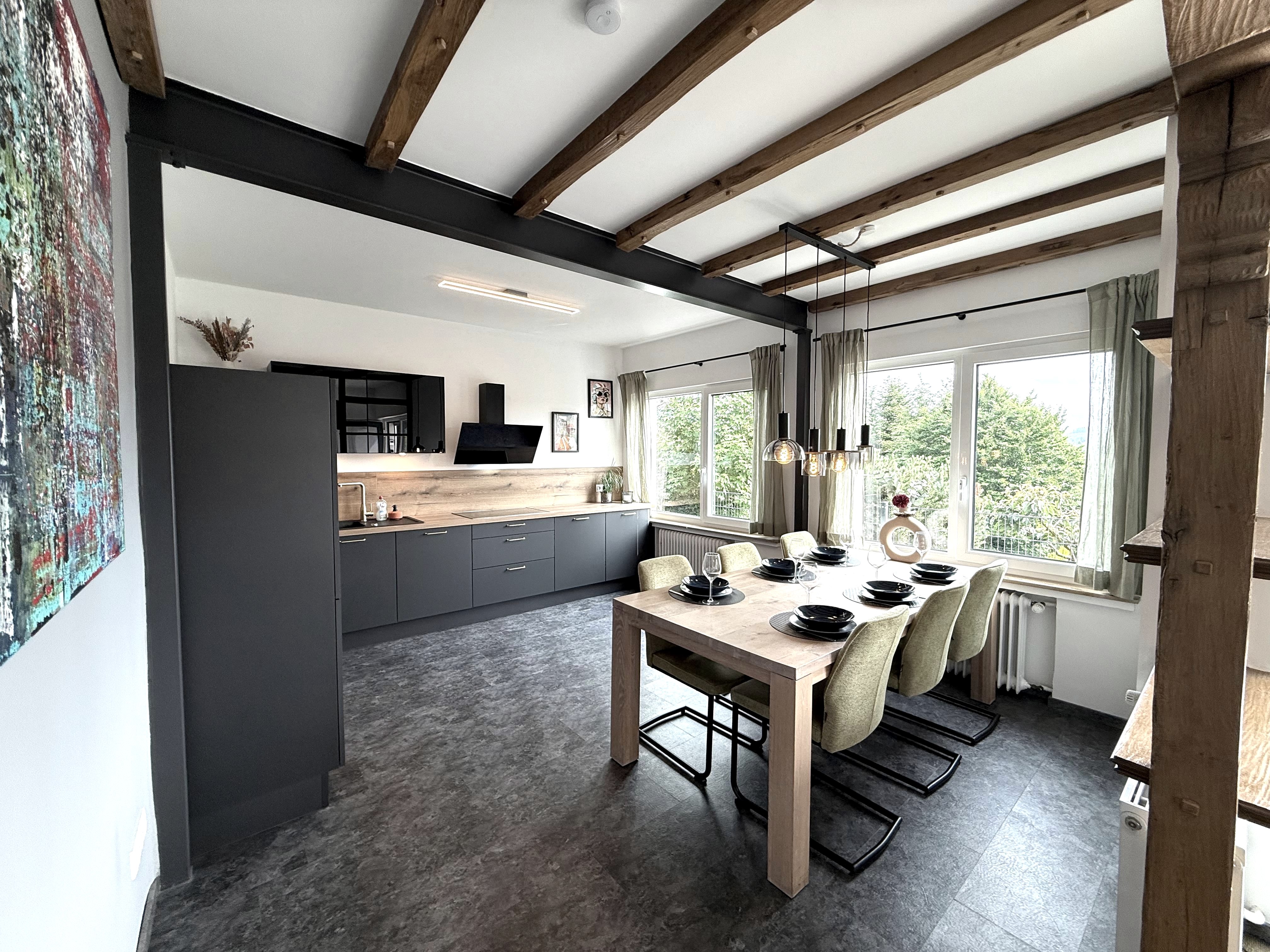 On entering the apartment, you enter the hallway (incl. checkroom), which leads directly into the spacious kitchen with dining area. The dining table seats 6 people and, if required, a child in a high chair (available on request). The fully equipped kitchen has a fridge, a freezer, a dishwasher, a 4-ring induction hob, an oven and a filter coffee machine.