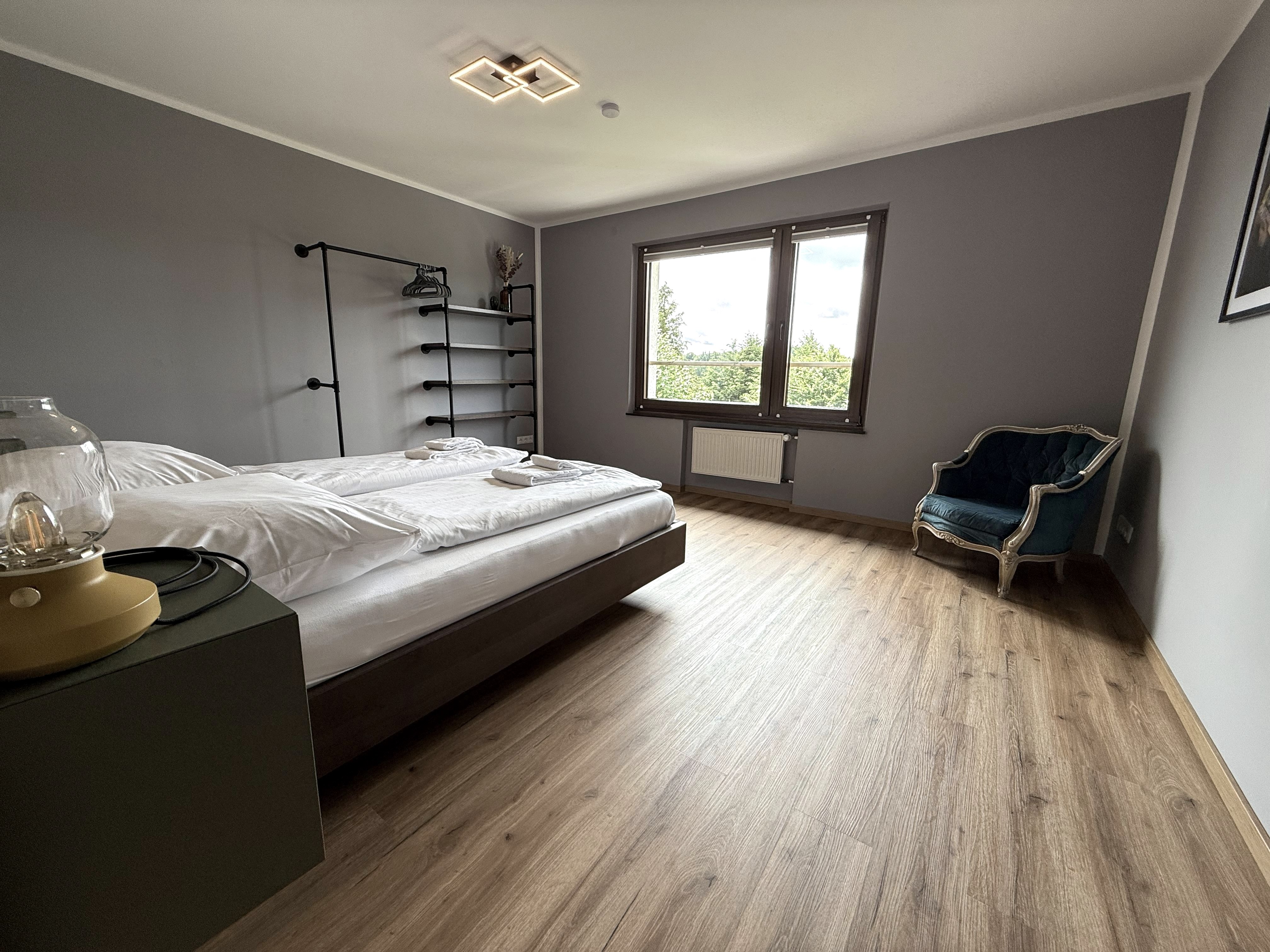 There are three comfortable bedrooms on the upper floor. Two rooms are furnished with double beds and offer a wonderful view of the countryside. The third bedroom has a pull-out bed. All bedrooms are fitted with blackout blinds.