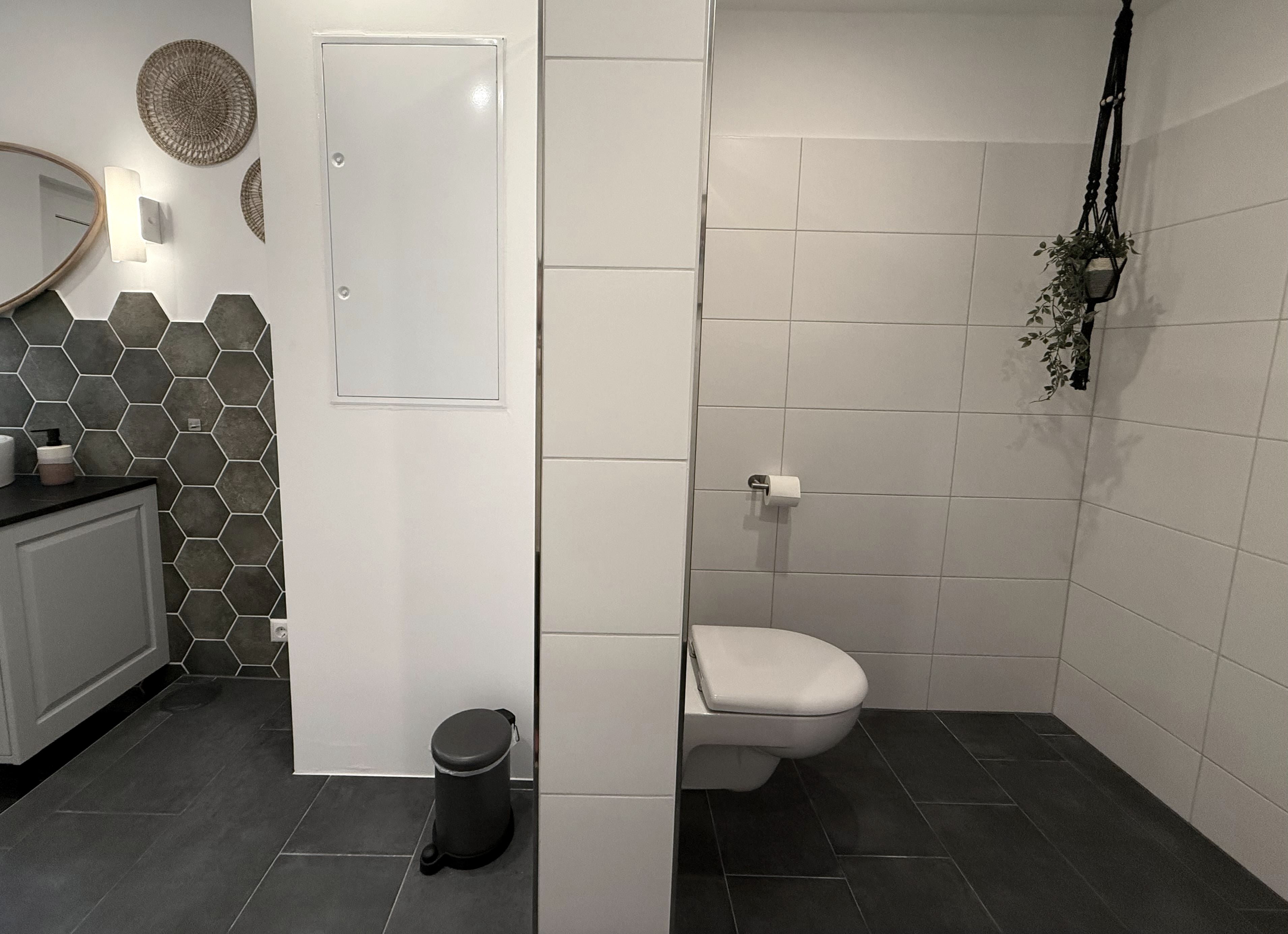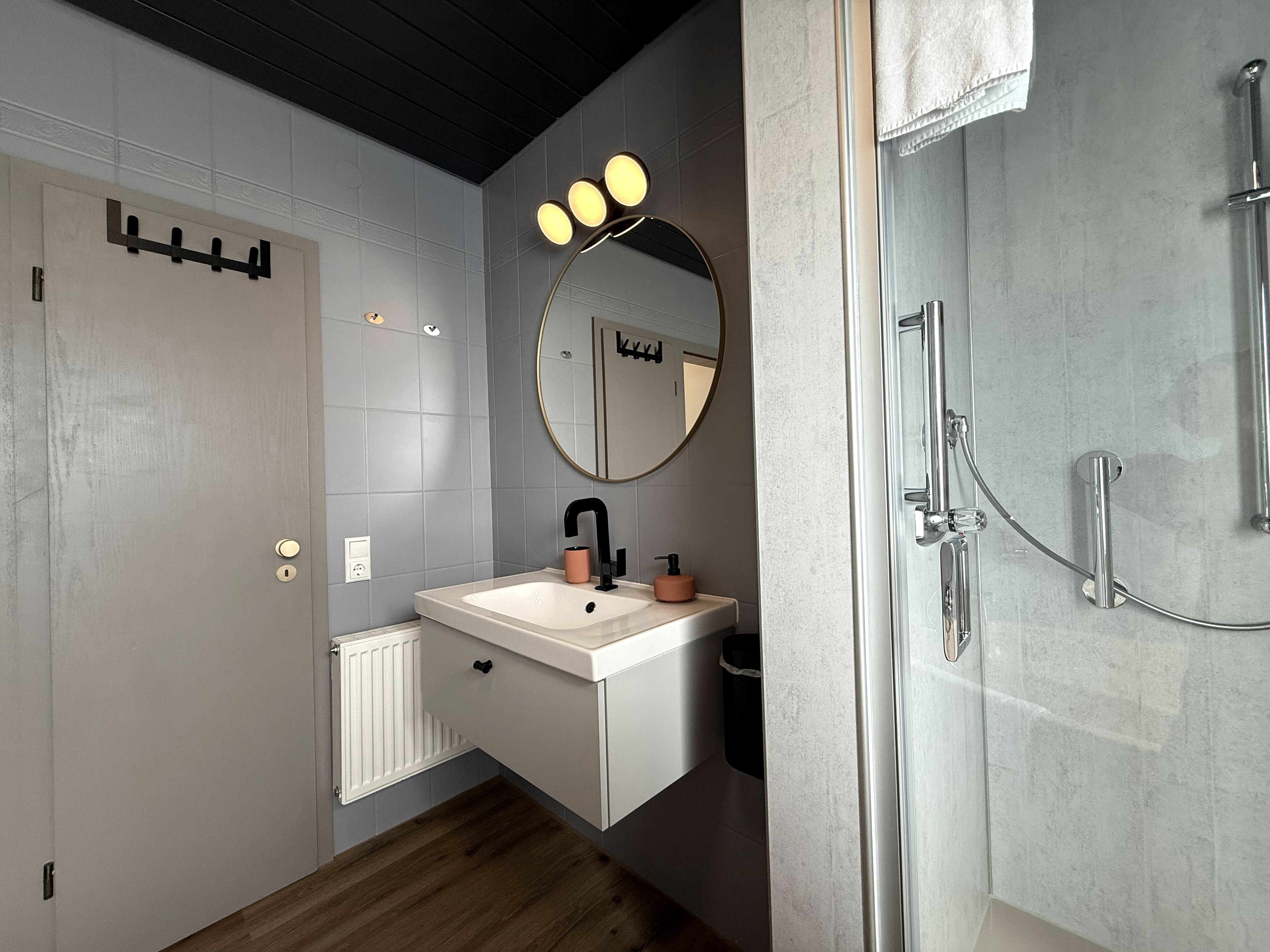 The bathroom on the upper floor has a spacious shower, a bathtub and a built-in wardrobe. A hairdryer is also available. There is also a laundry room on the first floor with a spacious washbasin and toilet.