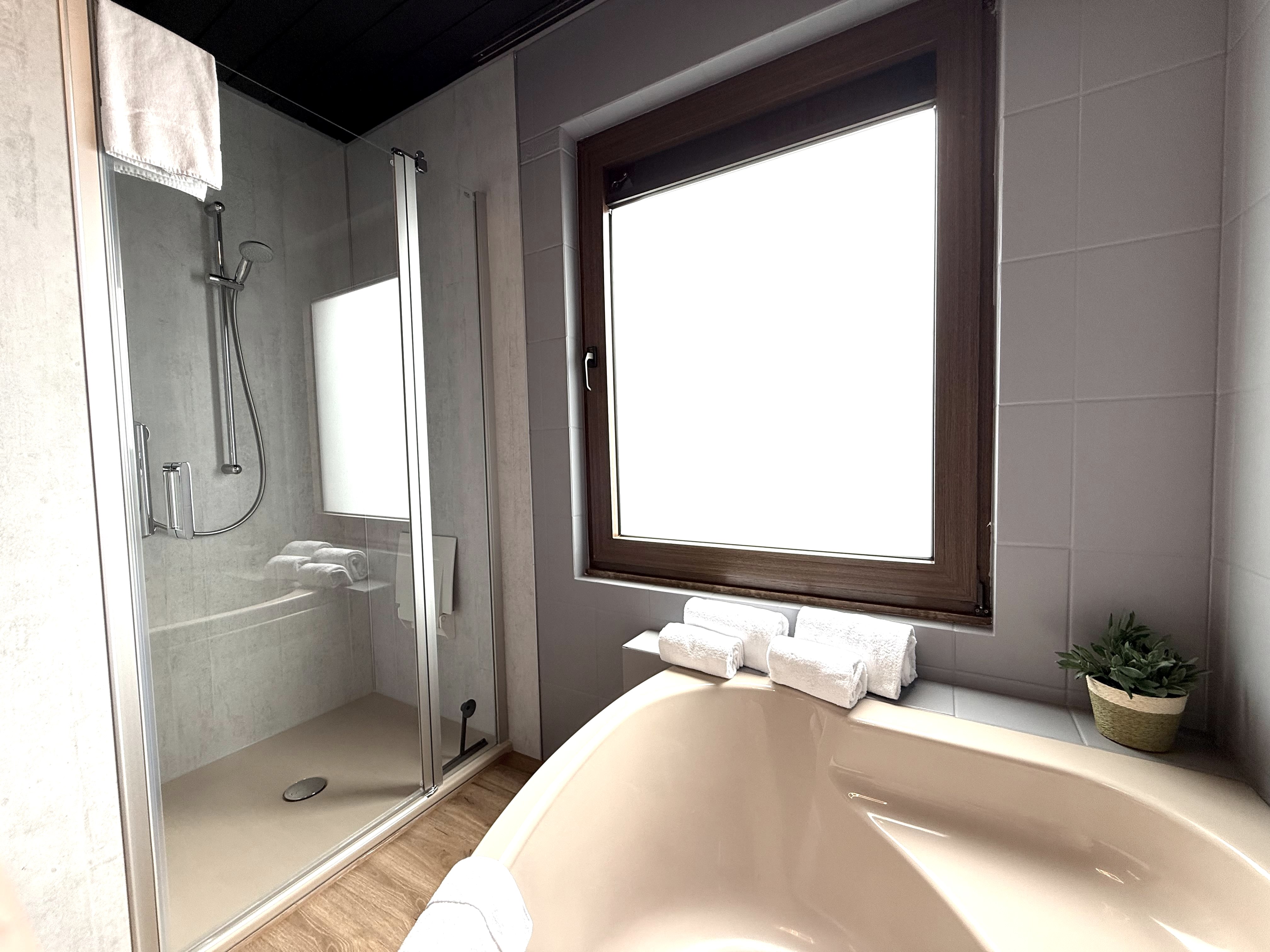 - Bathroom with shower, bathtub and washbasin (upper floor)