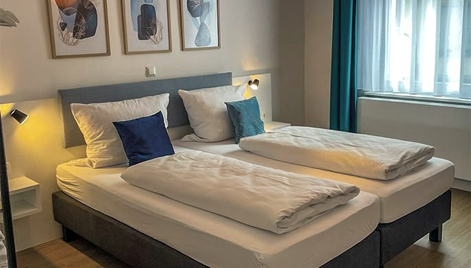 We offer 6 freshly renovated rooms for up to 17 people. The rooms can be flexibly used as 2- to 4-bed rooms and are perfect for groups, pilgrims, hikers, cyclists, or clubs. Our accommodation is located at the gateway to the national park in the city center of Heimbach.