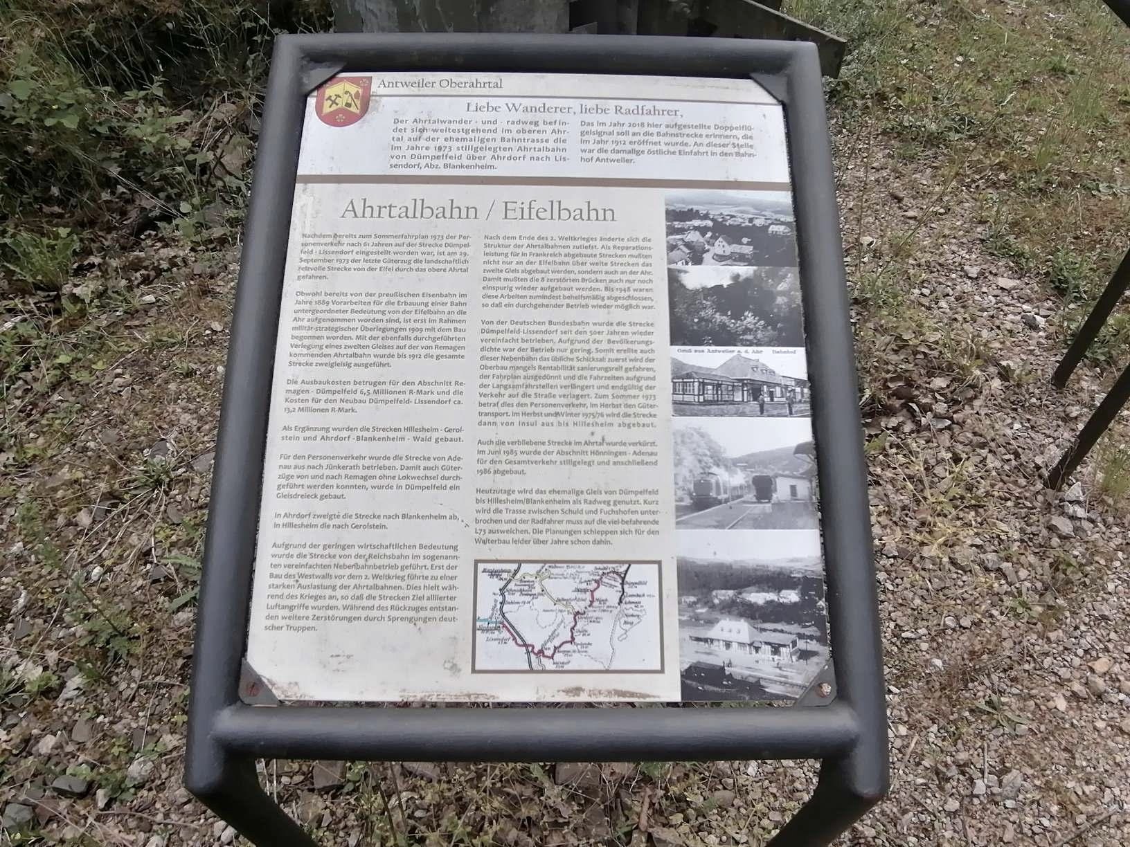Interesting insights into the history of the Ahr Valley Railway, which connected Dümpelfeld and Lissendorf on this route just a few decades ago, can be found on the information boards at the foot of the double-wing signal, which is clearly reminiscent of the railway line.