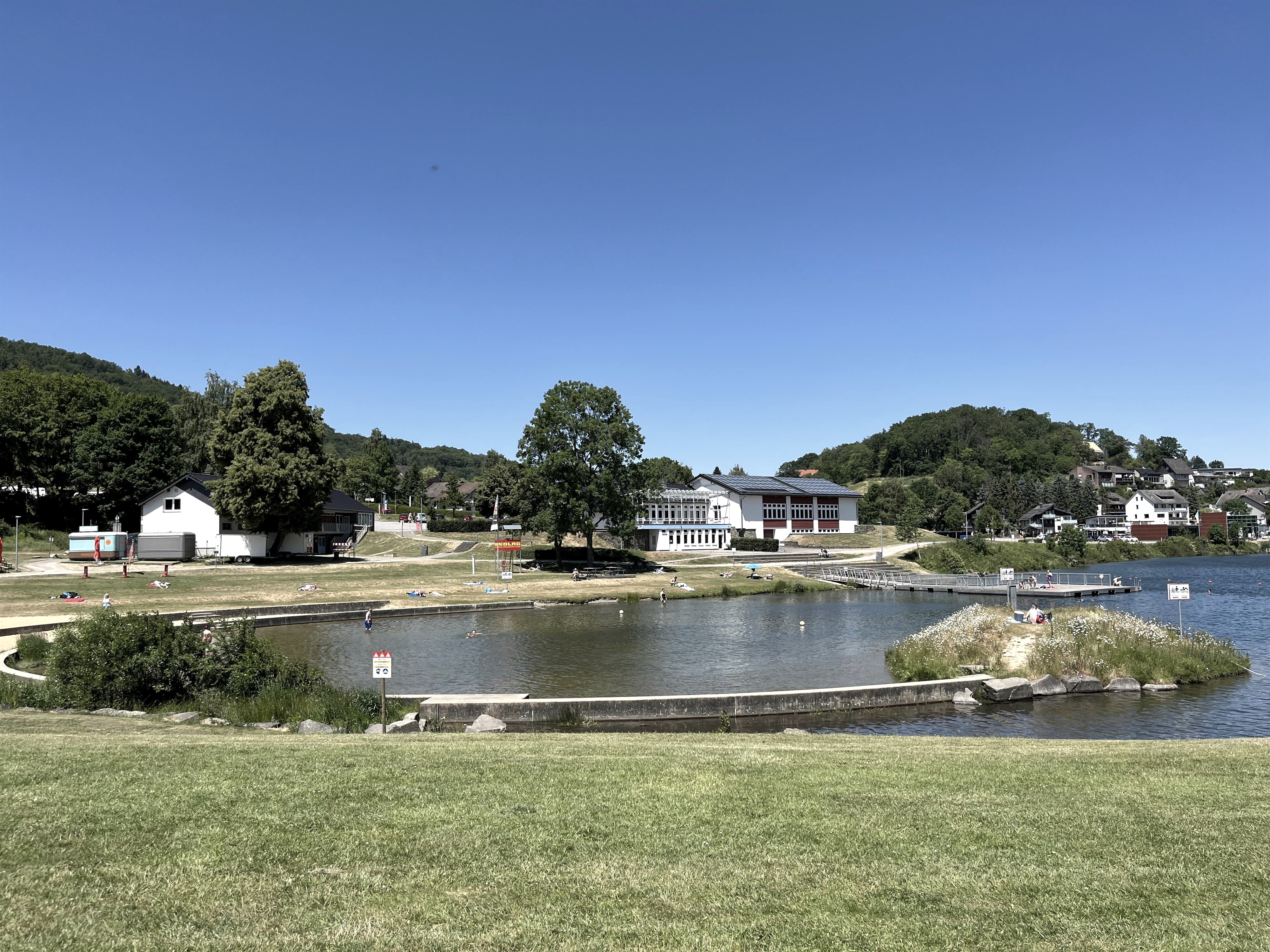 There is the popular natural swimming pool, whose clear water is appreciated by all visitors. The laid-out sandy beach with a shallow water zone for children and a playground leaves nothing to be desired for exuberant water fun for young and old. Everyone will find a place on the spacious bathing area, whether in the sun or under one of the numerous beautiful trees. In the summer months, the DLRG (German Lifeguard Association) is on site and watches over the bathing operations (in the summer holidays in North Rhine-Westphalia and on the weekends from May to August.
