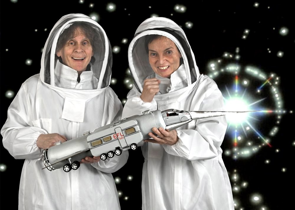 The piece by Christiane Remmert and Jojo Ludwig is called "Manure, Kneipp, and the Universe," because it deals with manure, with Kneipp, and with the universe. But it is also about much more; it is a mixture of acting, puppet theater, satire, and revue with many world-moving songs. For example, one can hear the long-lost "Ode to the Fair Lady Hildegard" by the medieval bard Walther von der Vogelweide, presented live by him personally and exclusively in this production. The theatrical piece originated from an impressive work by the Eiserfeyer artist Peter Ratz. Ratz constructed a nearly 17-meter-long rocket from a silo tank, a small car, a caravan trailer, and various other ingredients, which he calls the "Manure Rocket." This art object has been built for the stage at "theater 1" to a scale of 1:24, and it spins a quirky story around it: With the hitherto unused rocket fuel manure, a rocket can travel at faster-than-light speed and thus overtake the light beams sent from Earth. This makes it possible to observe events that have since passed on Earth. The two astronauts Zilli Eschbach and Hauke Lütjensteen use this fuel in their self-built rocket and can not only see what happened on Earth long ago during their journey into space, but also photograph these visions with the help of Jules Verne's old wooden camera, retrieve them from the device, and even bring them to life. Unfortunately only in two dimensions, but still. Among other things, episodes from the life of Hildegard of Bingen and Sebastian Kneipp become visible. Astonishing facts emerge, such as Hildegard's near-career as a shot putter or Kneipp's passion for creating extensive earthen caves. Over-the-counter, this production administers a panacea that helps against all sorts of ailments, viruses, ticks, bacteria, mites, lethargy, hair loss, cavities, and other unwanted life circumstances: laughter.