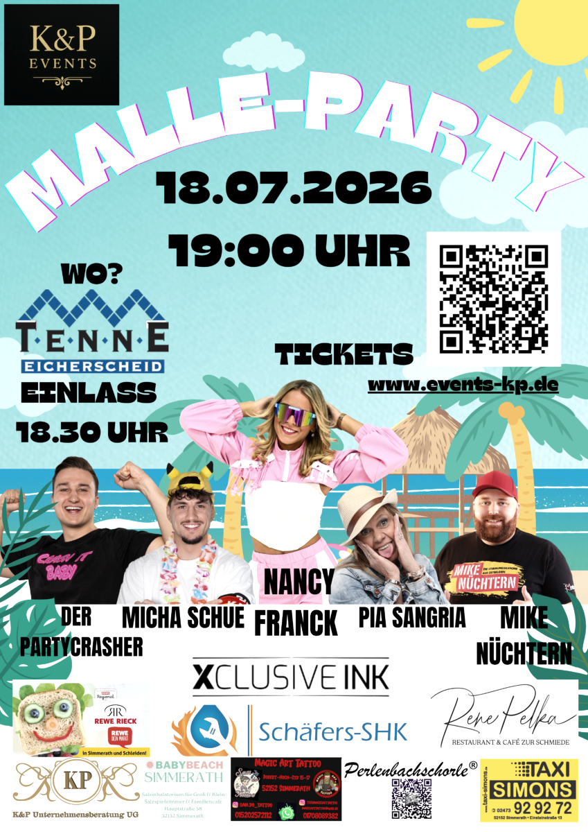 Ballermann meets Tenne! Five live acts and a DJ bring real Mallorca vibes to the barn. The event is organized by K&P-Events, and you can get tickets via the QR code on the poster. The bar team of the barn, a cocktail bar, and food trucks ensure plenty of solid and liquid nourishment. See you there!