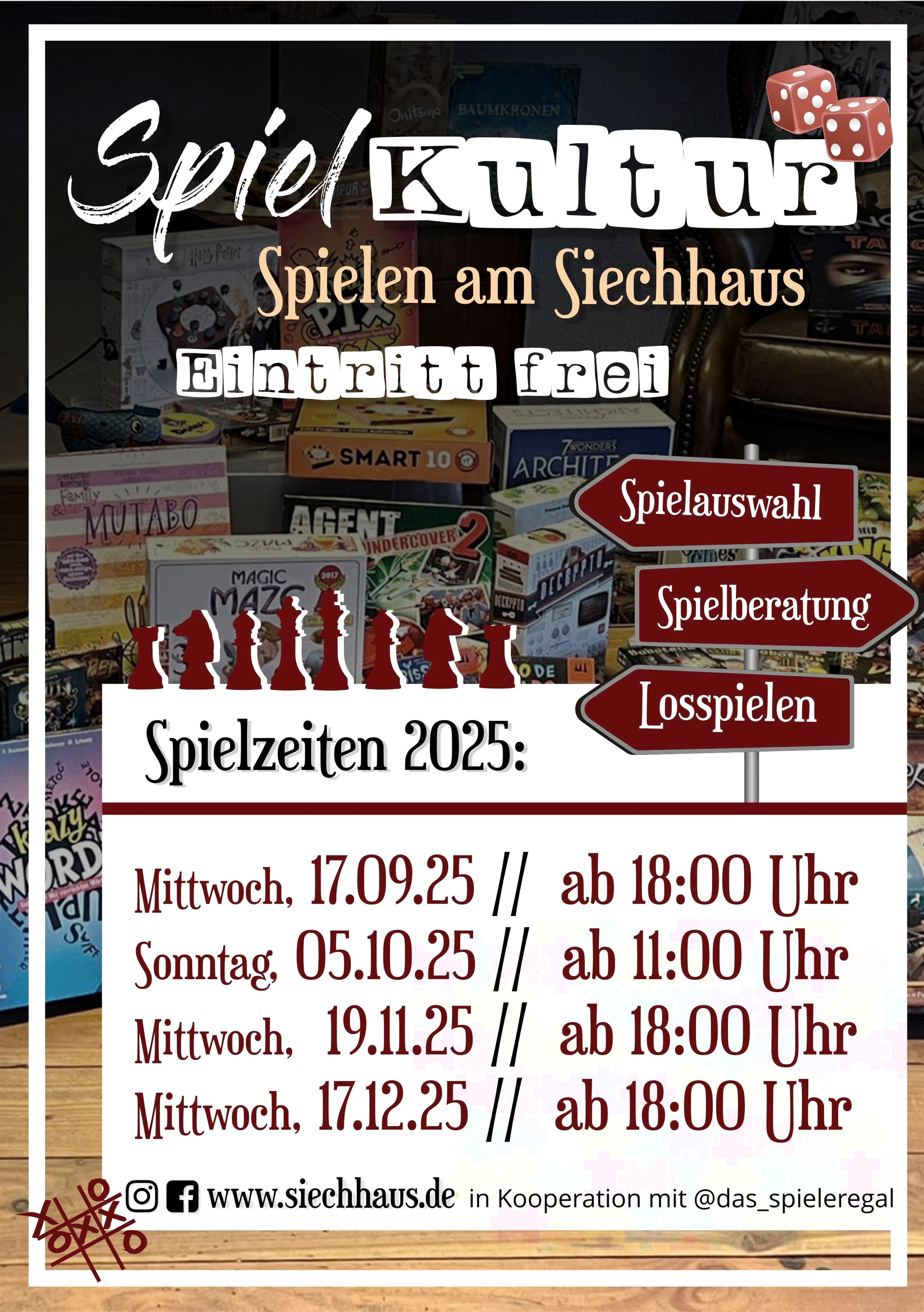 A varied games day awaits you at the Siechhaus! Whether you are a board game pro or a novice, you will always find a suitable game here - under expert guidance and in cooperation with Das Spieleregal. Immerse yourself in new worlds of games, get to know nice people and enjoy a relaxed day full of challenges and entertainment.
