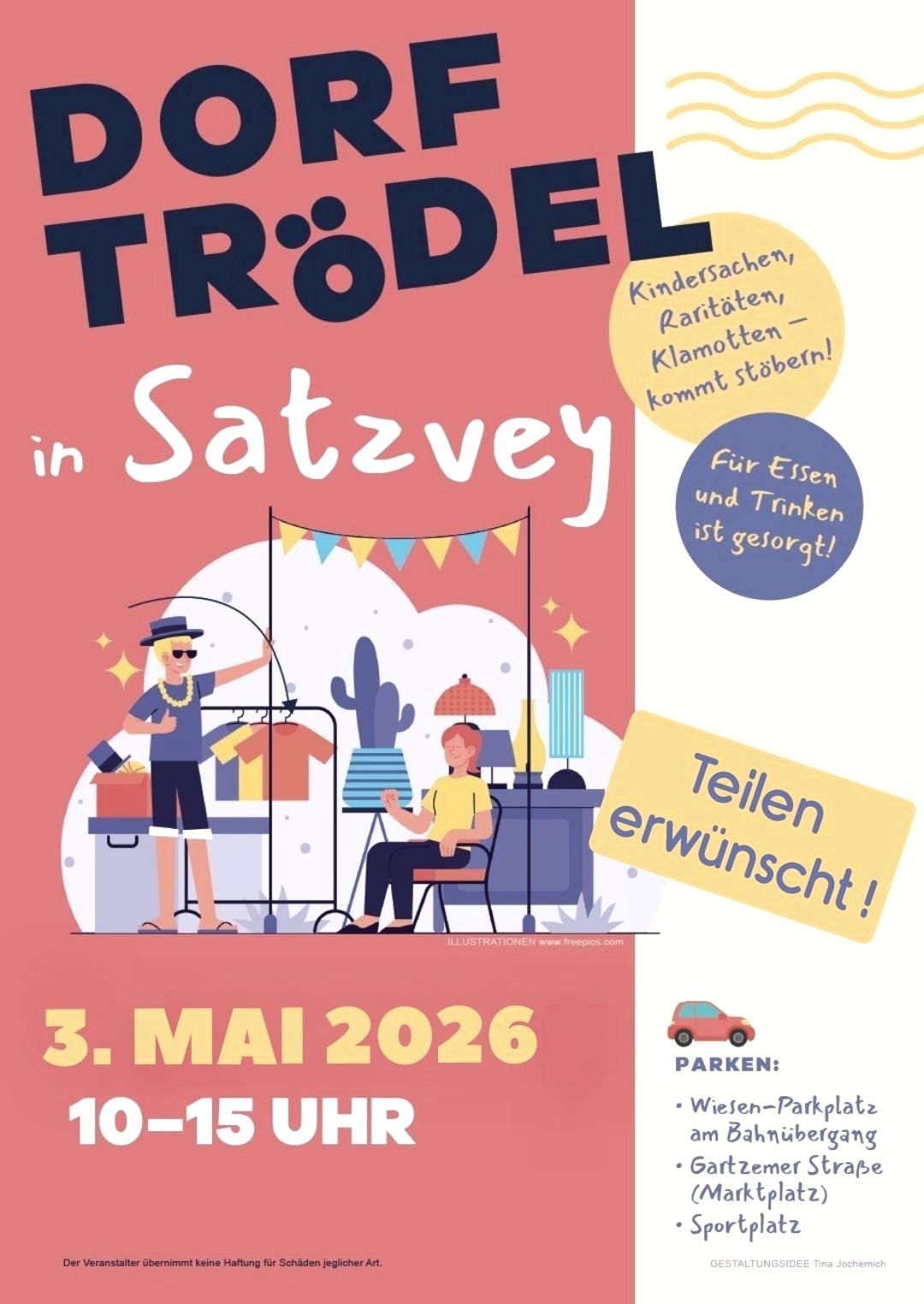 Viele Satzveyer öffnen wieder Ihre Tore, denn der beliebte Dorftrödel findet wieder statt. Die Stände sind über den Ort verteilt und auf dem Dorfplatz wird für das leibliche Wohl gesorgt. Mit ausgehängten Karten und Luftballons machen die Stände auf sich aufmerksam, so dass Sie ganz entspannt durch die Straßen schlendern können.