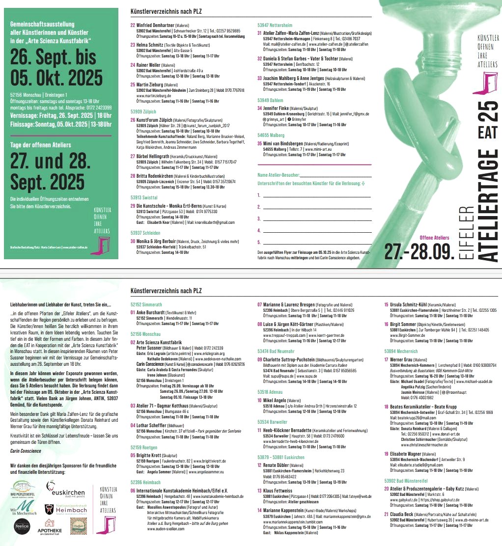 ...in die offenen Pforten der „Eifeler Ateliers“, um die Kunstschaffenden der Region persönlich zu erleben und zu befragen. Die Künstler/innen heißen Sie herzlich willkommen in ihrem kreativen Raum, in dem Ideen lebendig werden. Tauchen Sie tief ein in die Welt der Formen und Farben. In diesem Jahr finden die EAT in Kooperation mit der „Arte Scienza Kunstfabrik“ in Monschau statt. In diesen inspirierenden Räumen von Peter Sussner beginnen wir mit der Vernissage zur Gemeinschaftsausstellung am 26. September um 18 Uhr. In diesem Jahr können wieder Exponate gewonnen werden, wenn die Atelierbesucher per Unterschrift belegen können, dass Sie 5 Ateliers besucht haben. Die Verlosung findet dann bei der Finissage am 05. Oktober in der „Arte Scienza Kunstfabrik“ statt. Vielen Dank an Jürgen Johnen, ANTIK, 53937 Gemünd, für die Kunstspende. Mein besonderer Dank gilt Maria Zalfen-Lenz für die grafische Gestaltung sowie den Künstlerkollegen Donata Reinhard und Werner Grau für ihre mannigfaltige Unterstützung. Kreativität ist ein Schlüssel zur Lebensfreude – lassen Sie uns gemeinsam die Türen öffnen.