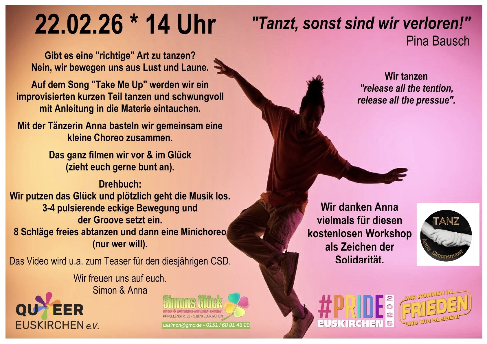 Mit der Tänzerin Anna Neue Simonsmeier wird gemeinsam eine kleine Choreographie erstellt. Aus dem Song „take Me Up“ werden wir einen improvisierten kurzen Teil tanzen und schwungvoll mit Anleitung in die Materie eintauchen. Eine Filmfirma wird diesen Mini-Tanzworkshop filmen und dieser Kurzfilm wird u.a. auf verschiedenen Social-Media Kanälen u.a. als Teaser für den diesjährigen CSD in Euskirchen präsentiert.