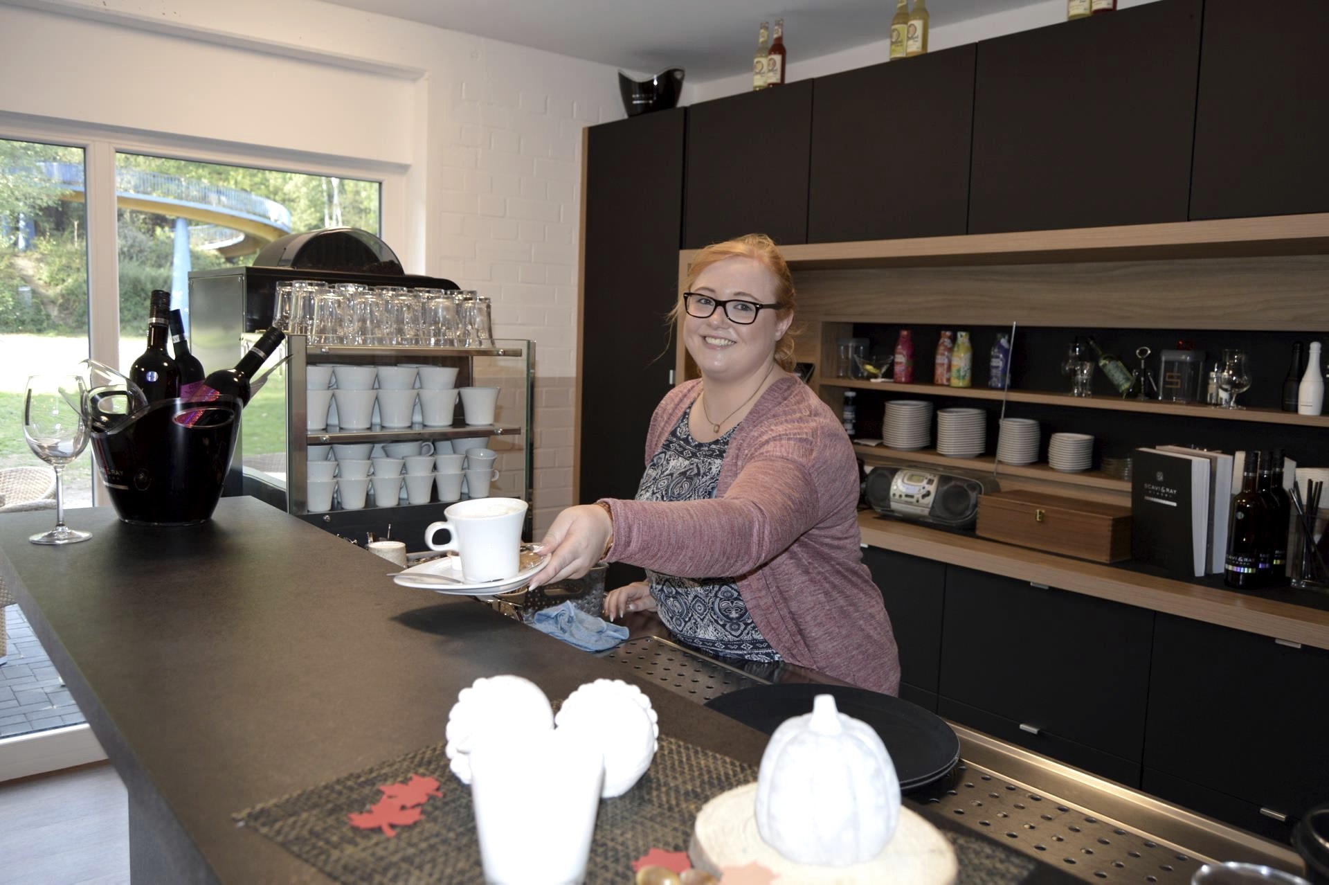 Auf der Karte stehen neben warmen und kalten Getränken auch kleine, saisonal wechselnde Speisen. Serviert werden etwa Flammkuchen, Salate und Baguettes. Heiß begehrt ist bei den Kindern die Gefriertruhe, die Eis am Stiel bereit hält. Außerdem wird frischer Kuchen in der Auslage angeboten- in Kooperation mit einer örtlichen Bäkerei.