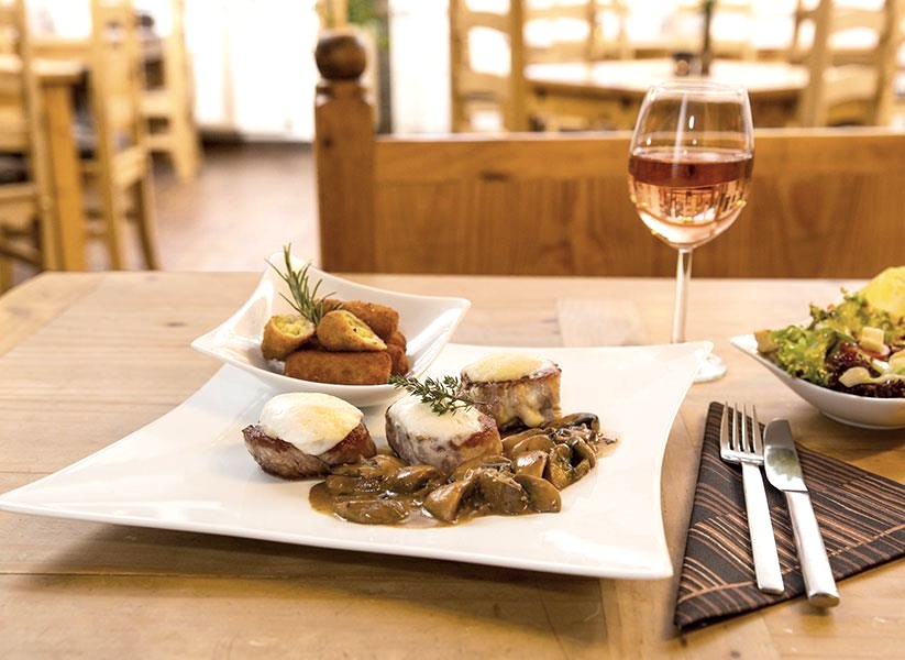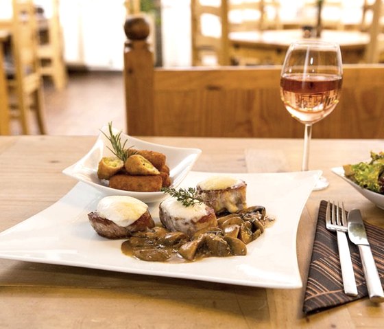 Zur frischen, modernen und vielseitigen Spreiseauswahl werden erlesene Weine oder ein frisch gezapftes Bier angeboten.
