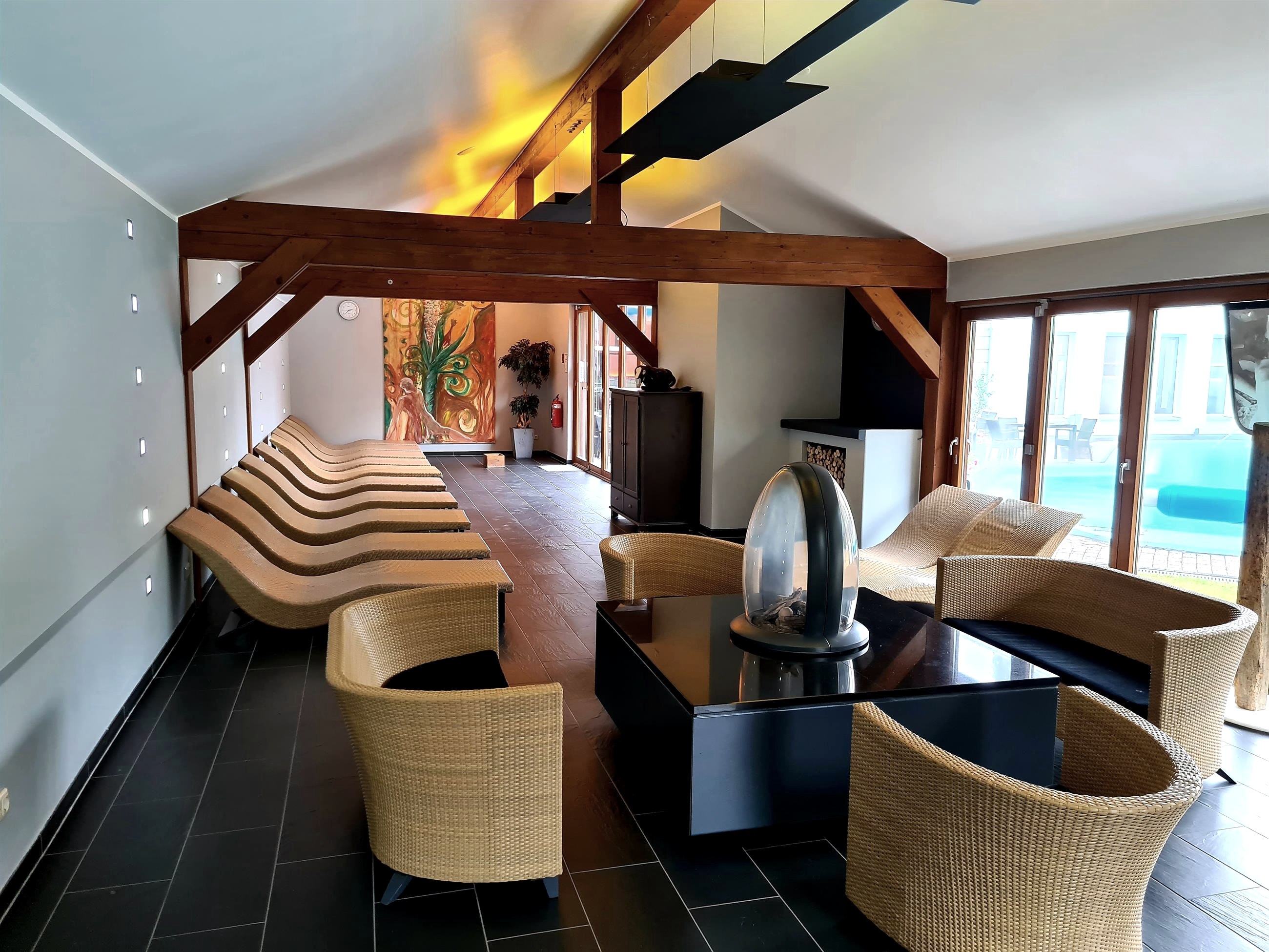 Vom Hotel aus ist die Wellnessoase „Roetgen Therme“ mit 7 Saunen (darunter die Eifeler Schwitzhütte, die Himalaya Kirstallsalz Sauna, das Aromabad und das Blütenbad u.a.) und 5 Pools direkt zugänglich. Highlight ist der große Open-AirMeerwasserpool (ganzjährig beheizt) im 5000 m² großen Thermenpark.