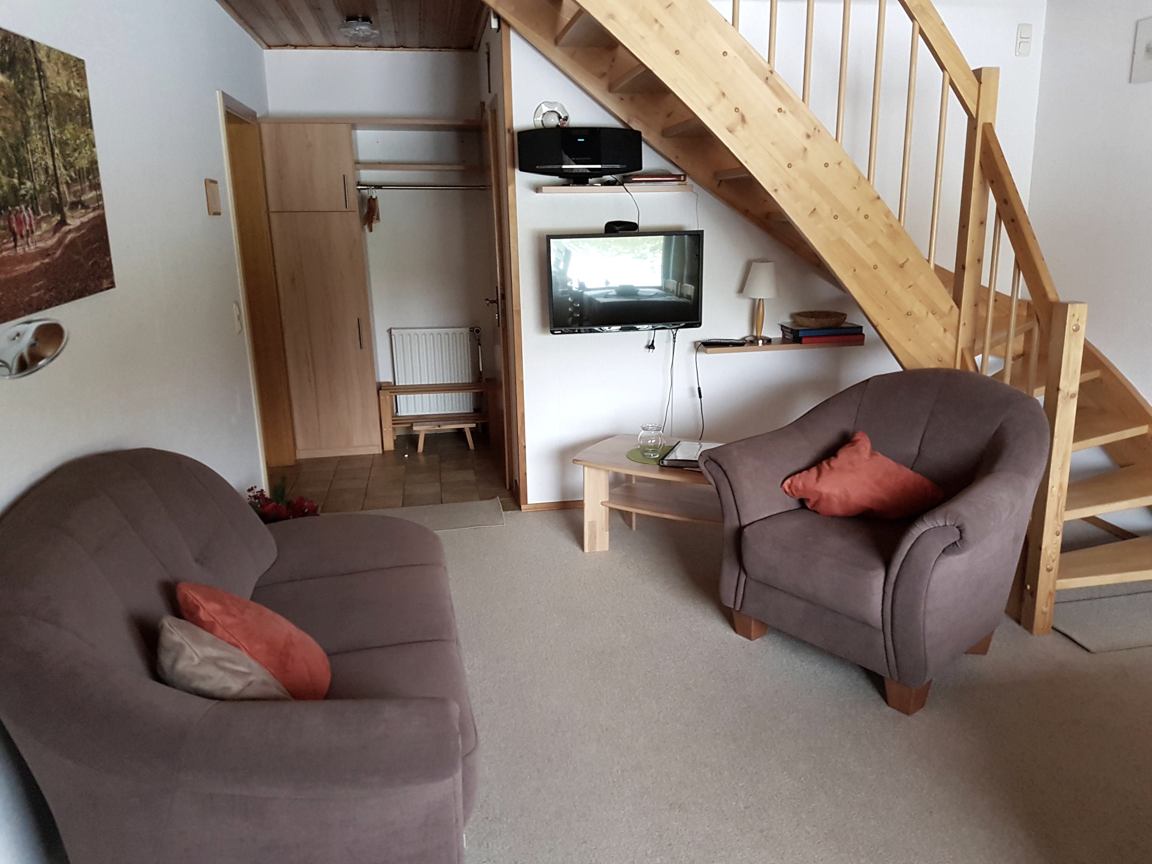In ruhiger Lage am Orts- und Waldrand gelegen, befinden sich unsere drei ca. 70qm großen Ferienwohnungen. Hier können Sie sich mit jeweils bis zu 4 Personen wohlfühlen und einen angenehmen Urlaub verbringen. Über zwei Ebenen verteilt finden Sie Küchenzeile, Essbereich, Wohnbereich, 2 Schlafzimmer mit eigenem Bad (Dusche/WC). Zusätzlich finden Sie in Wohnung 1+2 Entspannung auf der offenen Empore.