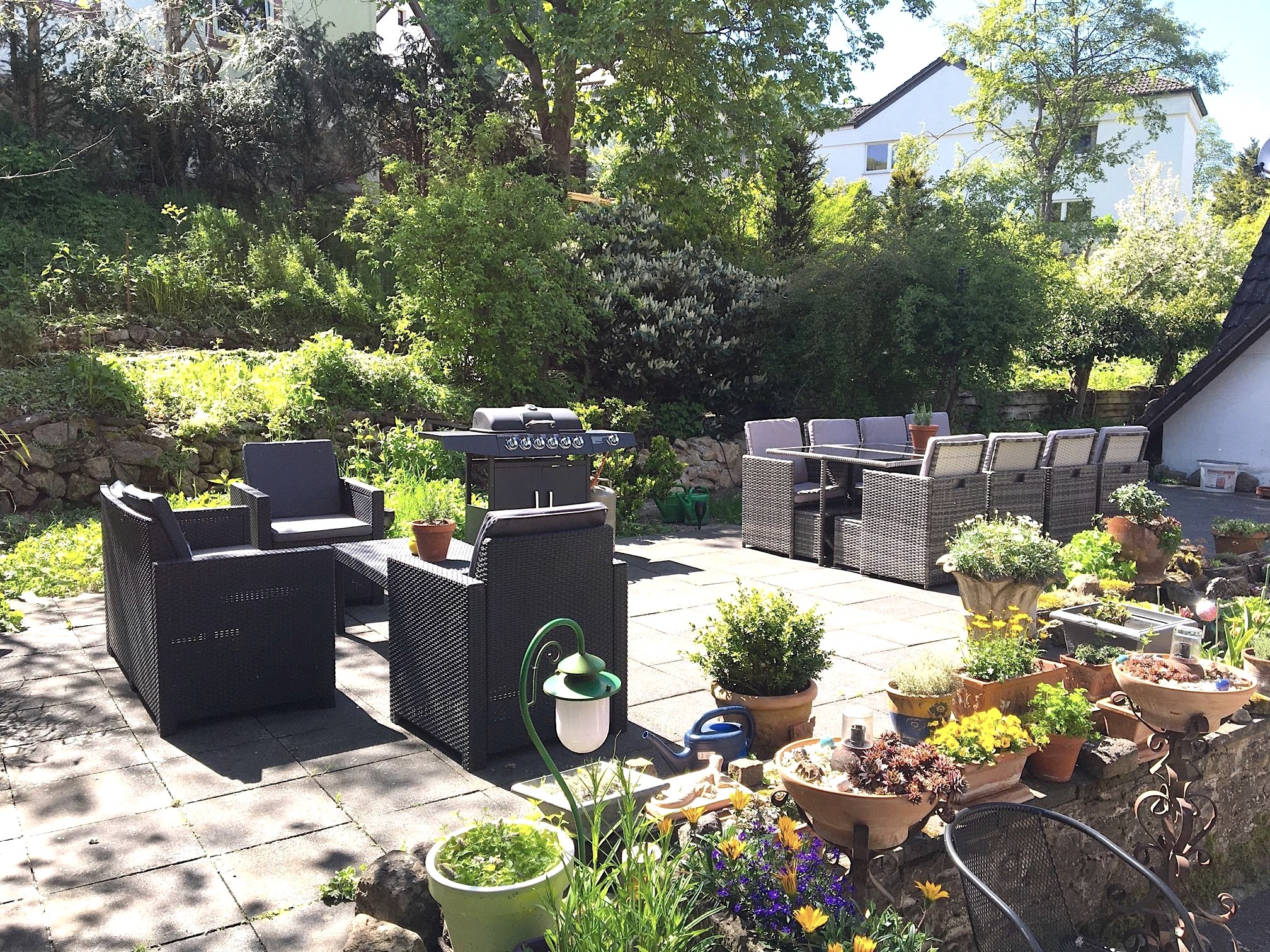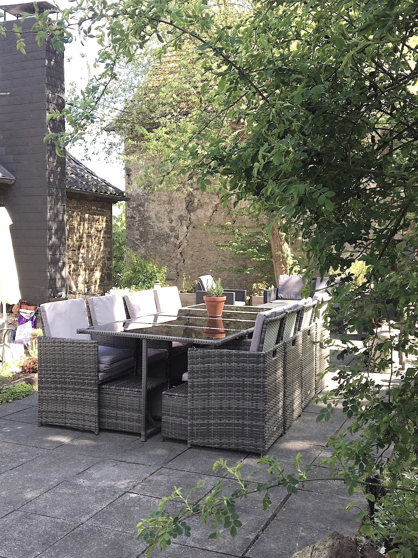 Gäste des Erdgeschoßes verfügen über eine eigene Terrasse mit großem Tisch und Grill. Für Gäste des Dachgeschoßes steht der im ersten Stock gelegene Garten mit Terrasse und ein großer Tisch mit Grill zur Verfügung. Wer im Apartment Ahrquelle oder Georgstor zu Gast ist, kann ebenfalls die im Garten gelegene Terrasse mit Esstischen und Grill nutzen.