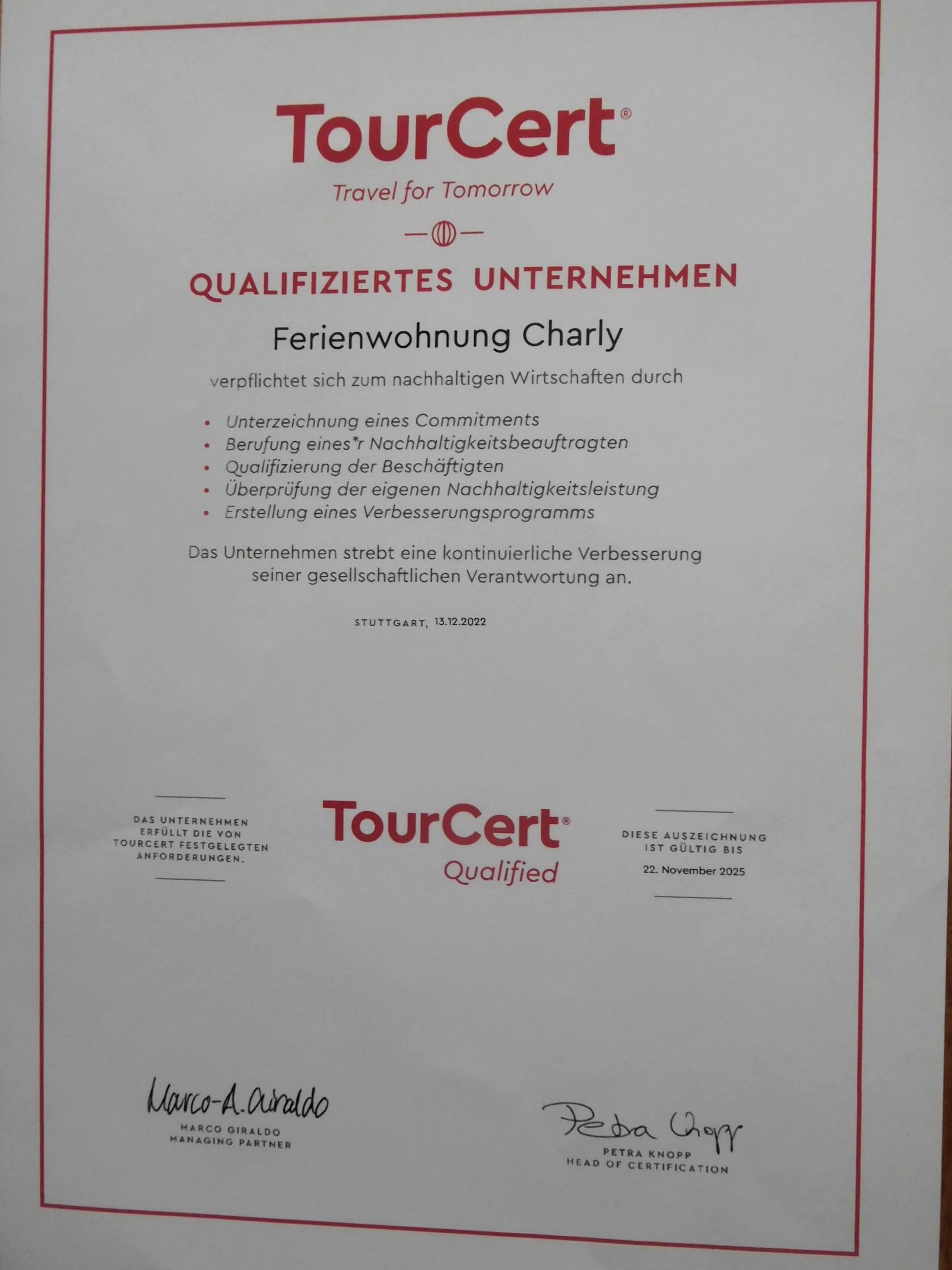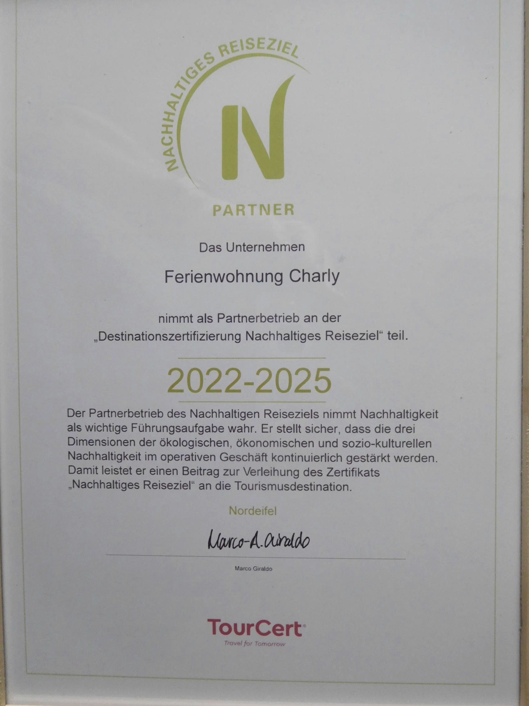 Im Mai 2024 wurde die Ferienwohnung erneut vom Deutschen Touristen Verband e.V. in die 4 Sternekategorie eingestuft und erhält auf Booking.com beste Bewertungen mit 9,5 von 10 Punkten. Zudem hat die Ferienwohnung Charly die Destinationszertifizierung Nachhaltiges Reisen erhalten und wurde 2022 von TourCert zertifiziert.