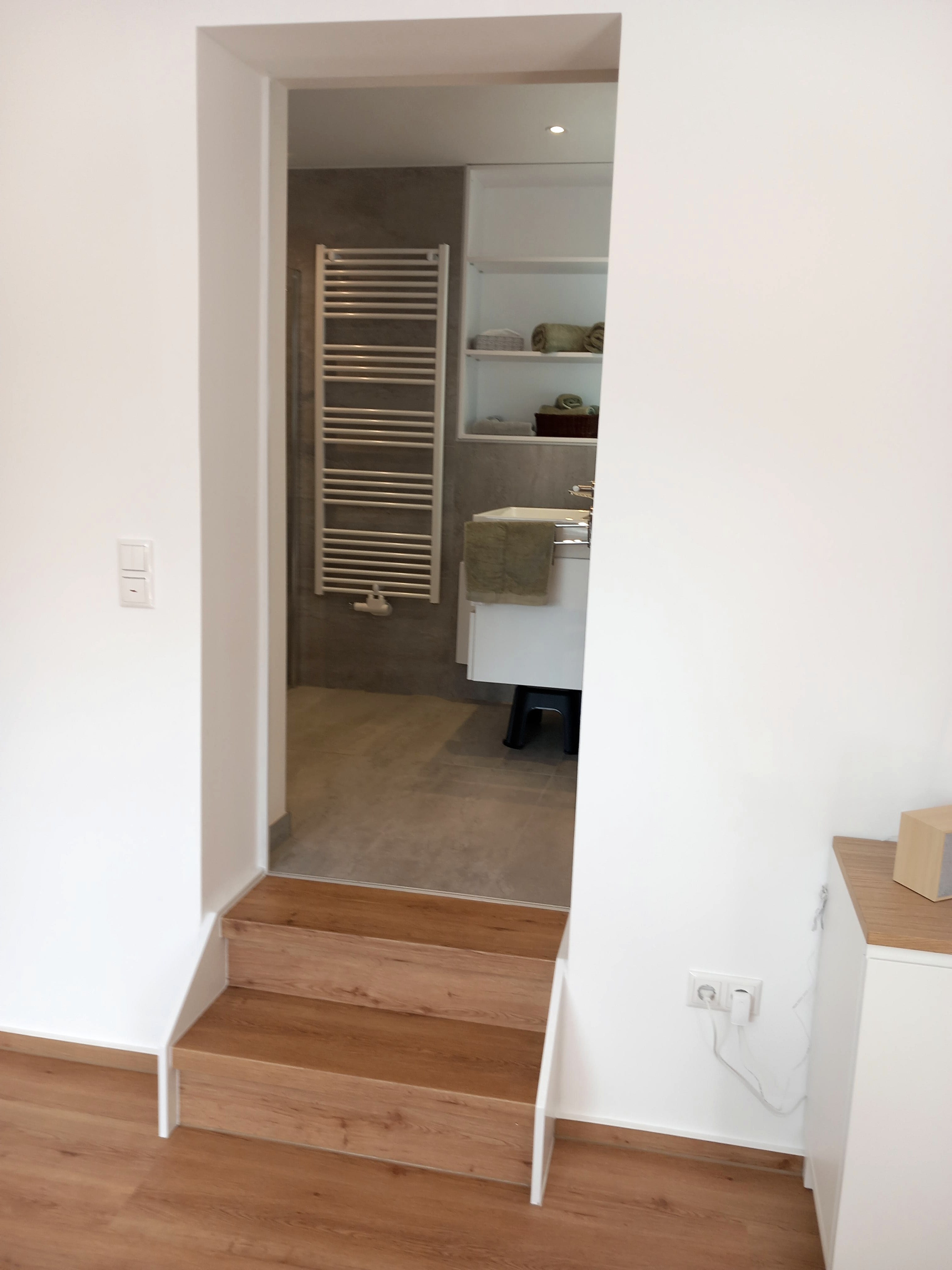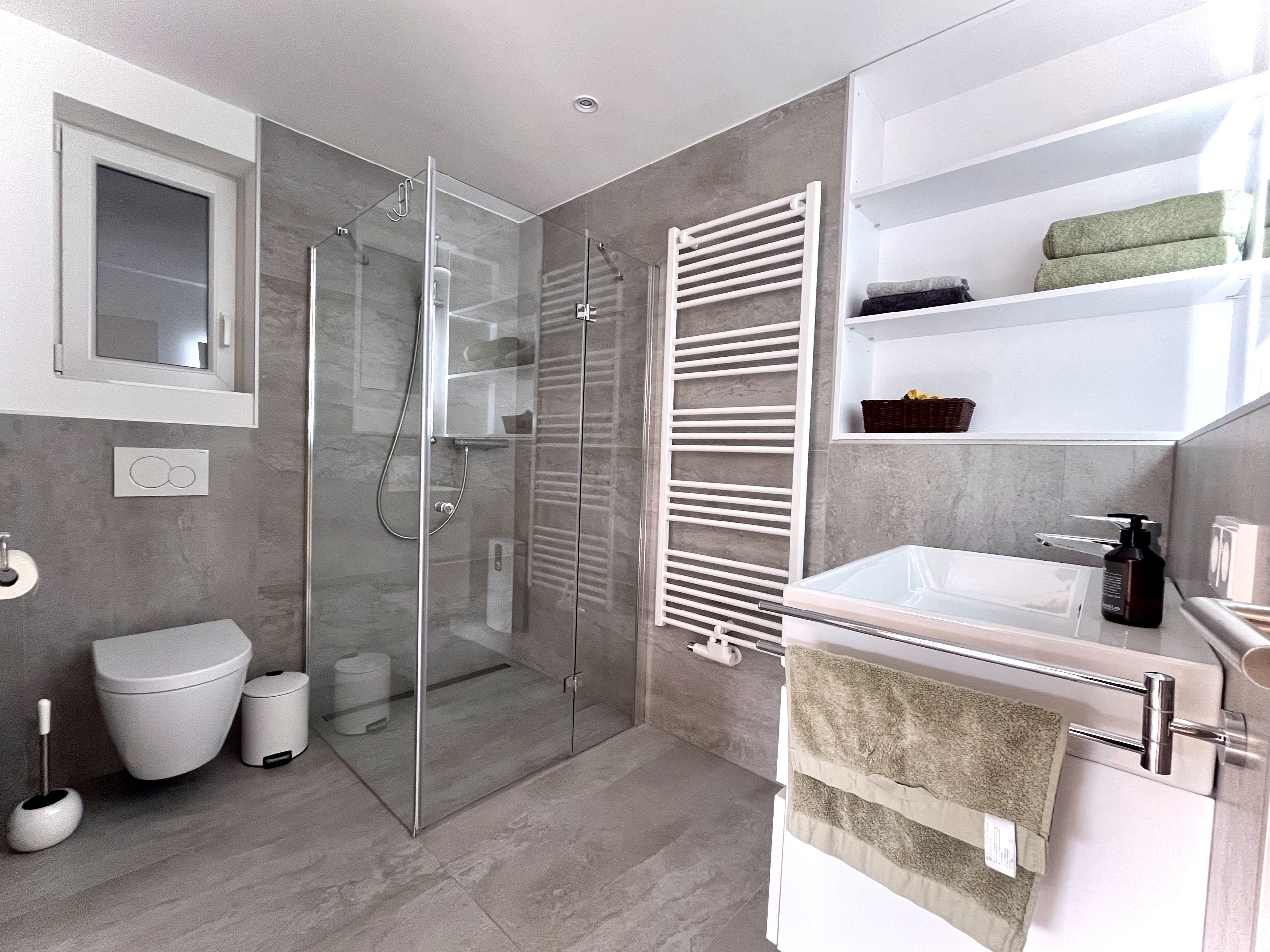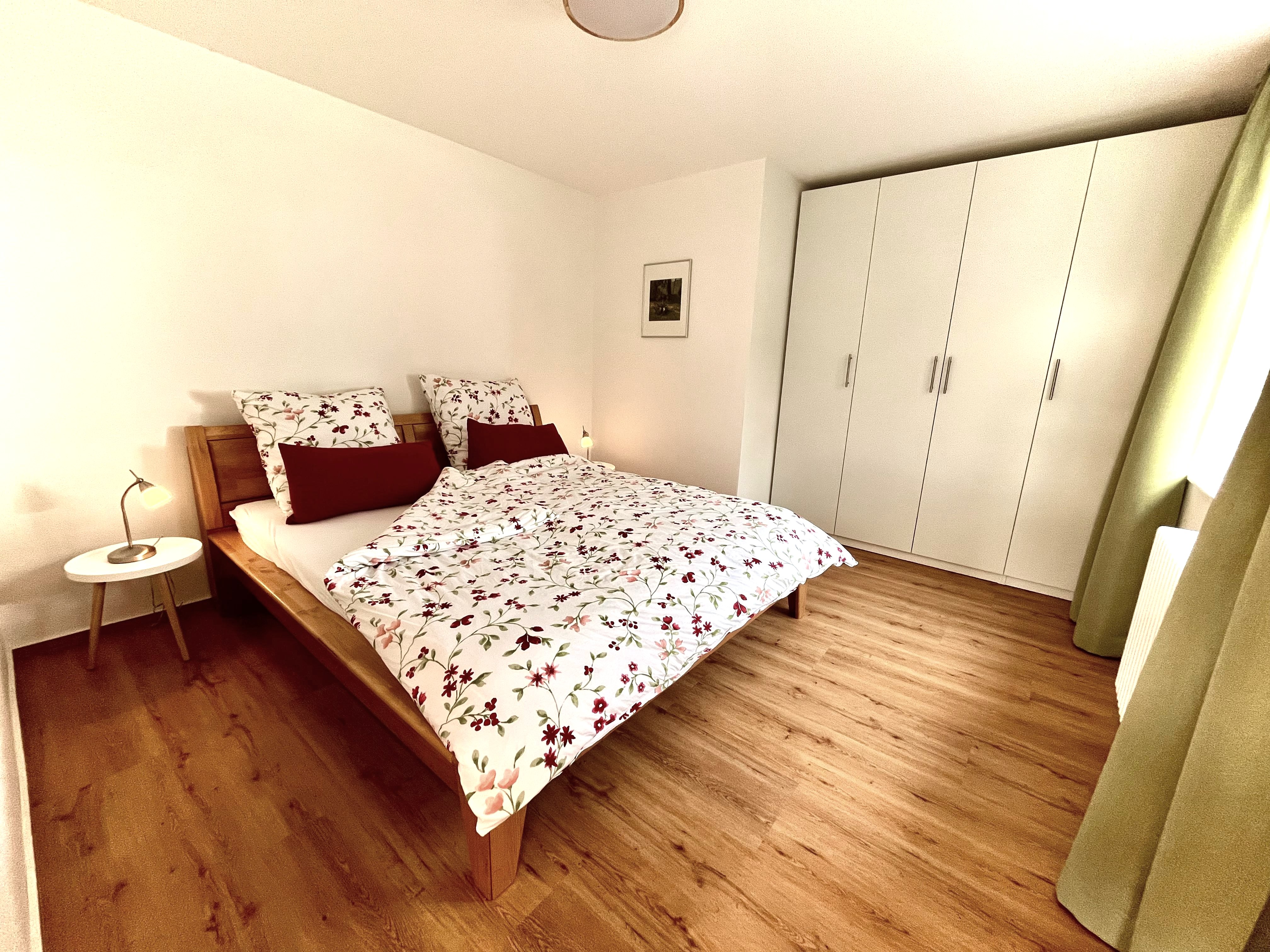 Zwei Stufen führen in das separate Schlafzimmer mit Doppelbett (2m x 2m) und großem Kleiderschrank. Das moderne Bad ist mit Walk-in Dusche, Handtuchtrockner und Fön ausgestattet.