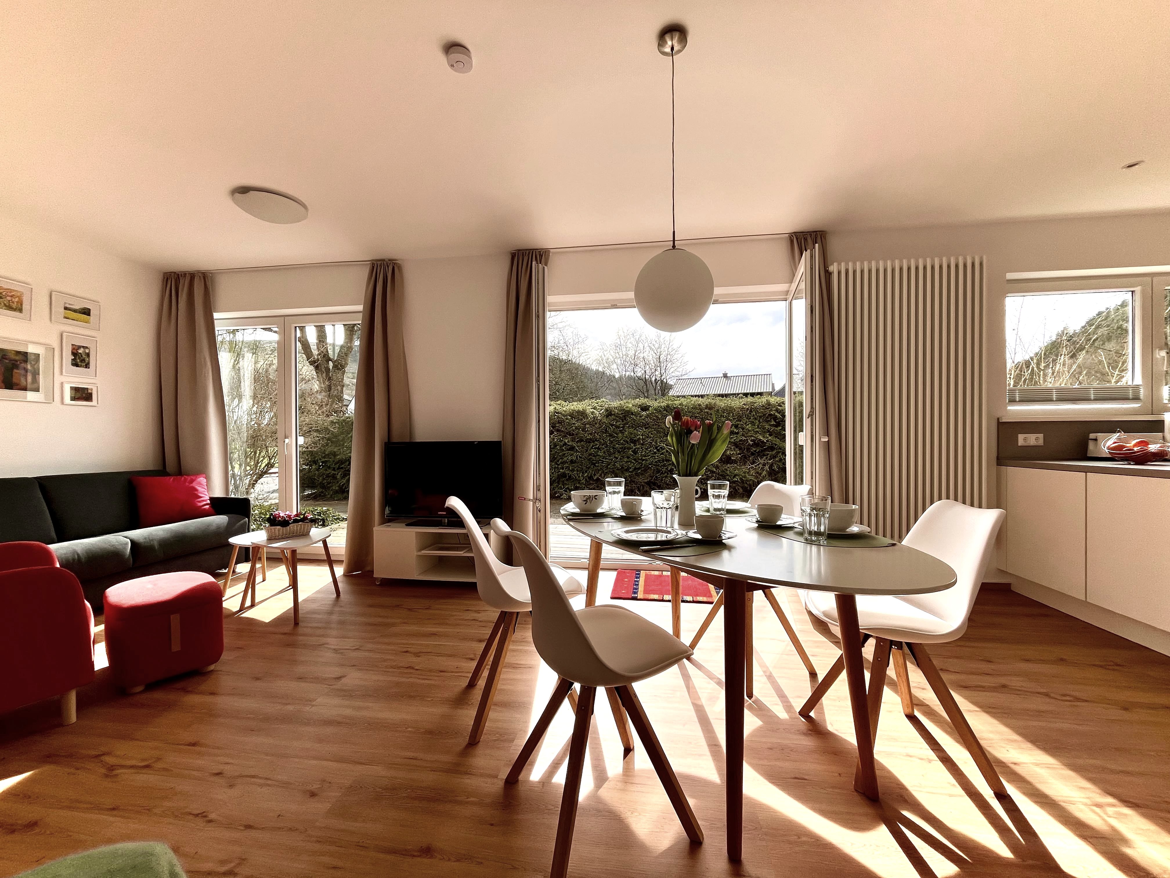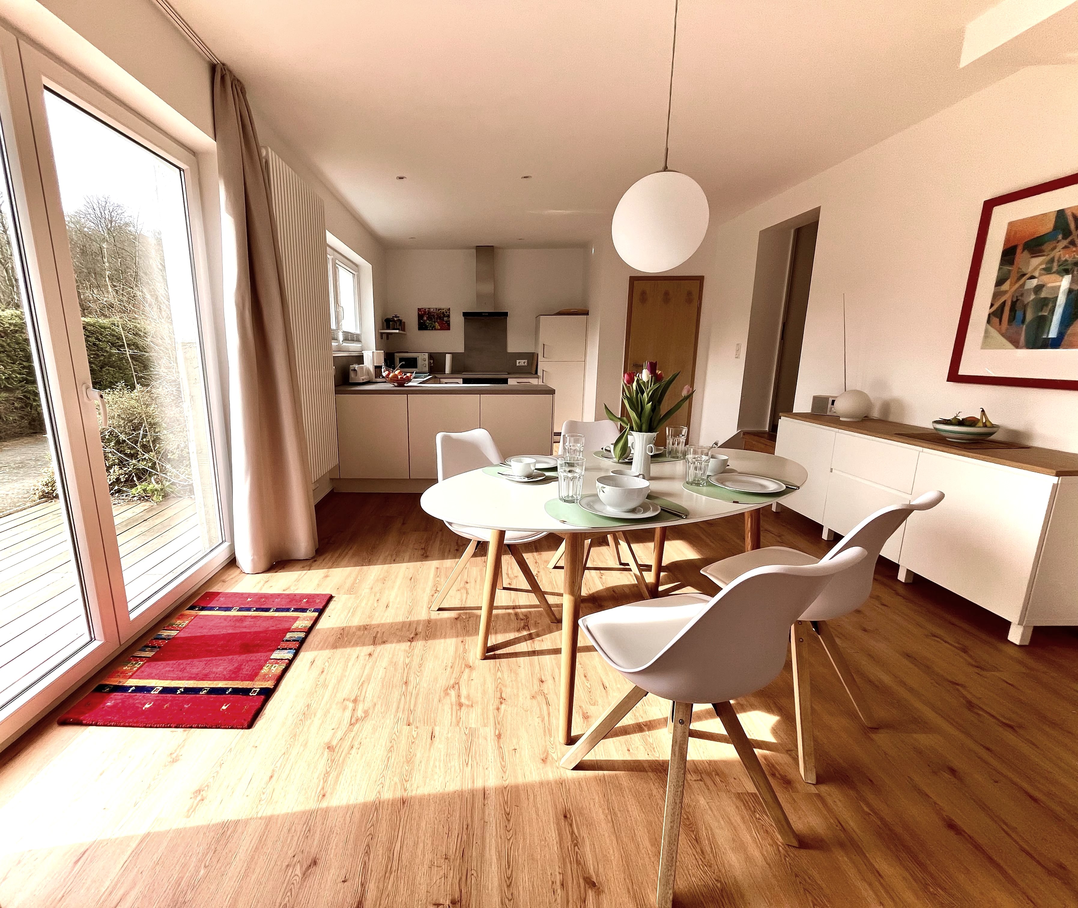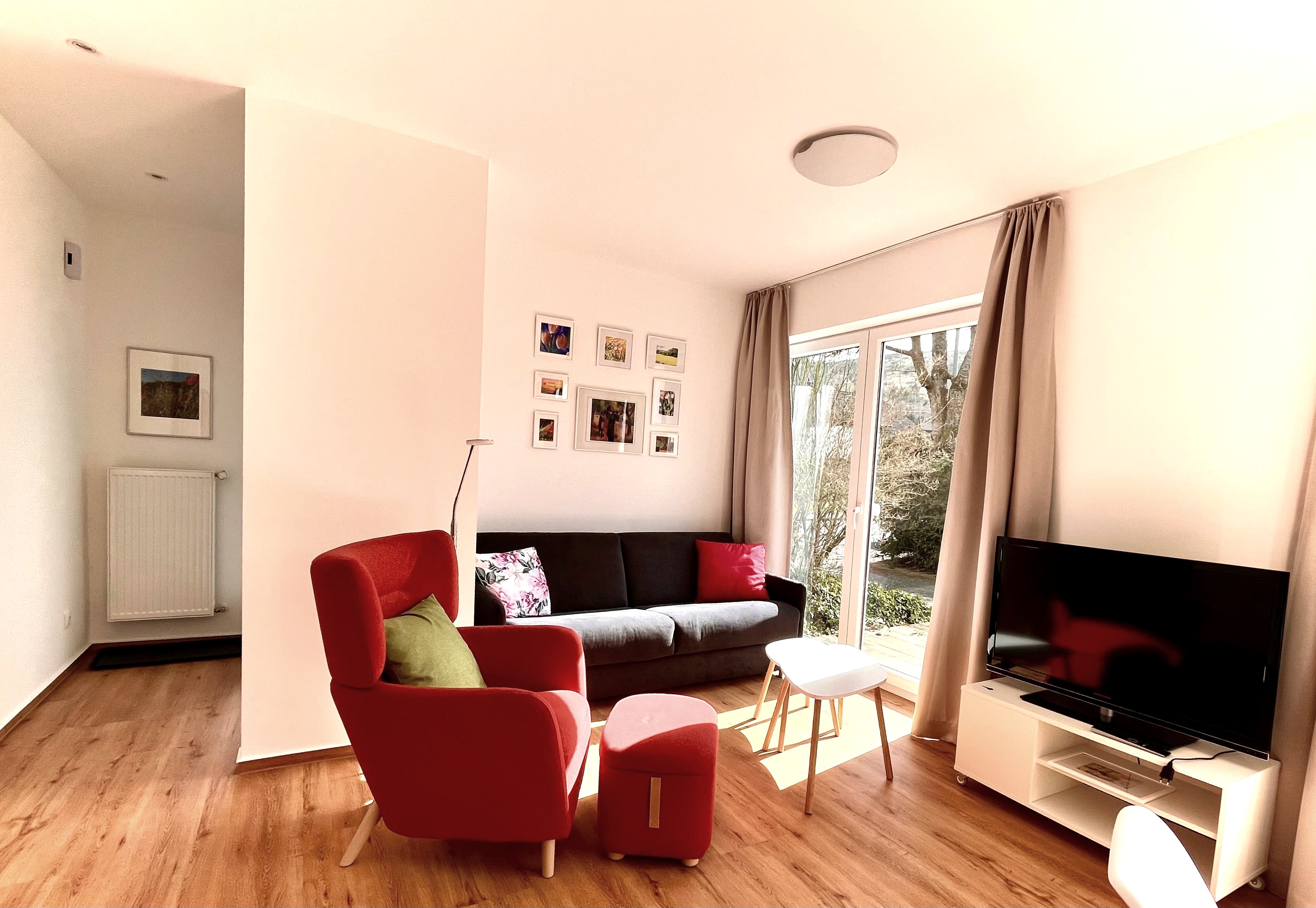 Im idyllischen Burgdorf Reifferscheid im Herzen der Nordeifel bieten wir unsere neue moderne 60 qm große Ferienwohnung für bis zu 4 Personen an. Die abgeschlossene Einliegerwohnung im Erdgeschoss besteht aus einem großen, hellen Wohn-Essraum mit offener komplett eingerichteter Küche, einem separaten Schlafzimmer, einem geräumigen Bad und einer zur Südseite gelegene Terrasse.