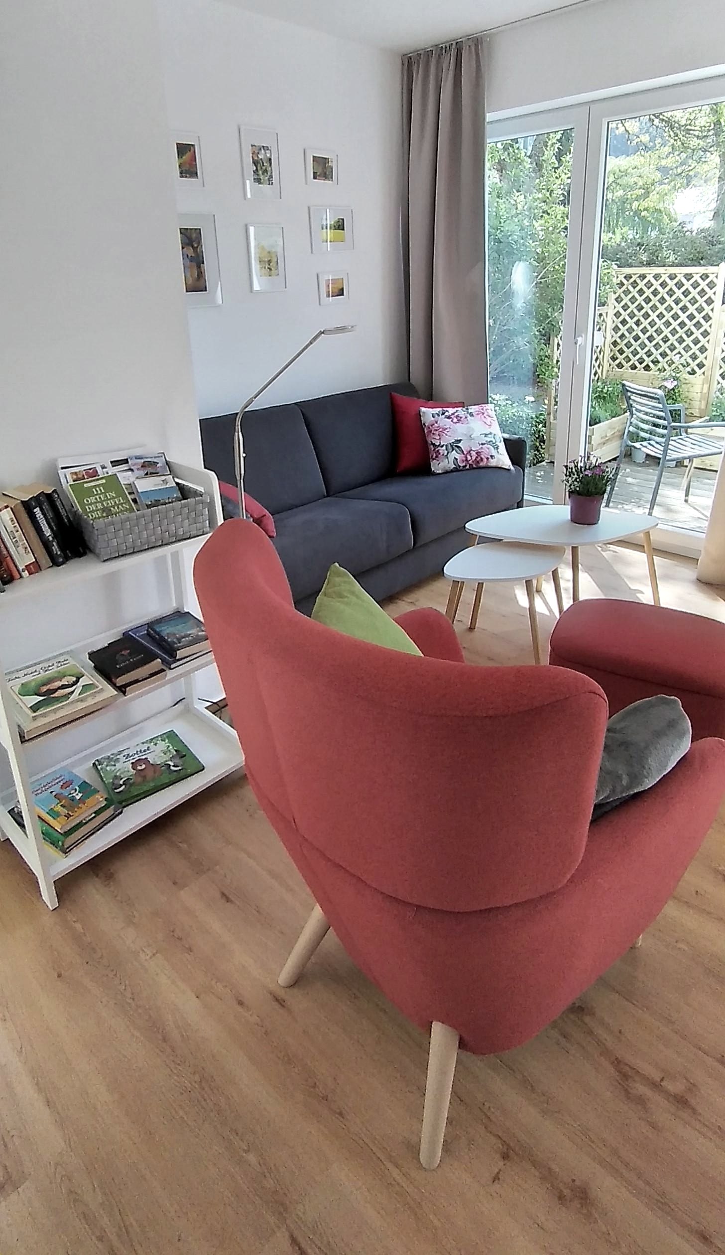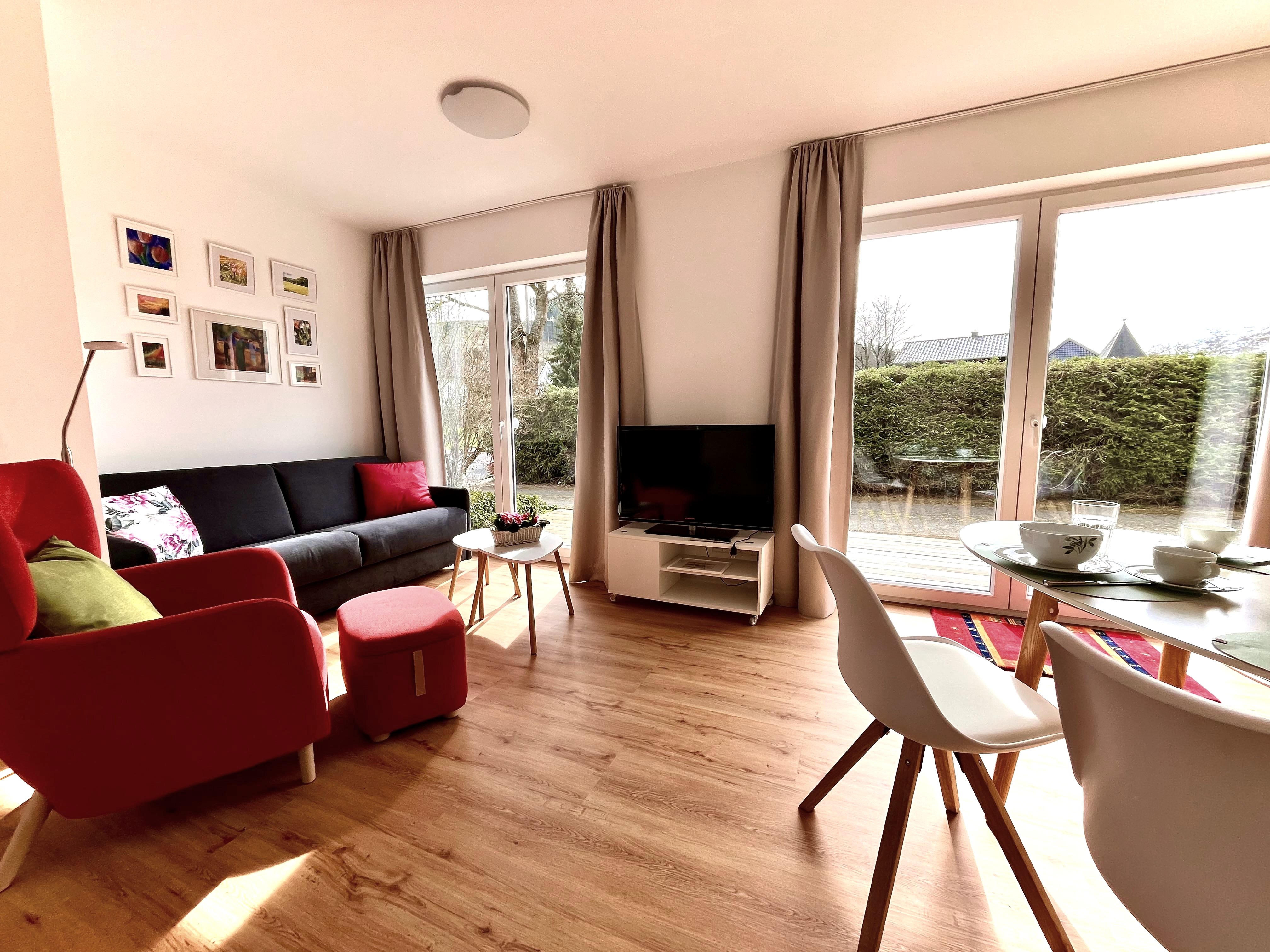 Die Sitzecke im Wohnzimmer ist mit einem gemütlichen Ohrensessel und einem Sofa ausgestattet, das zu einer vollwertigen Schlafstätte für zwei Erwachsene umgewandelt werden kann. Es gibt WLan, SAT-TV und Bluetoothradio.