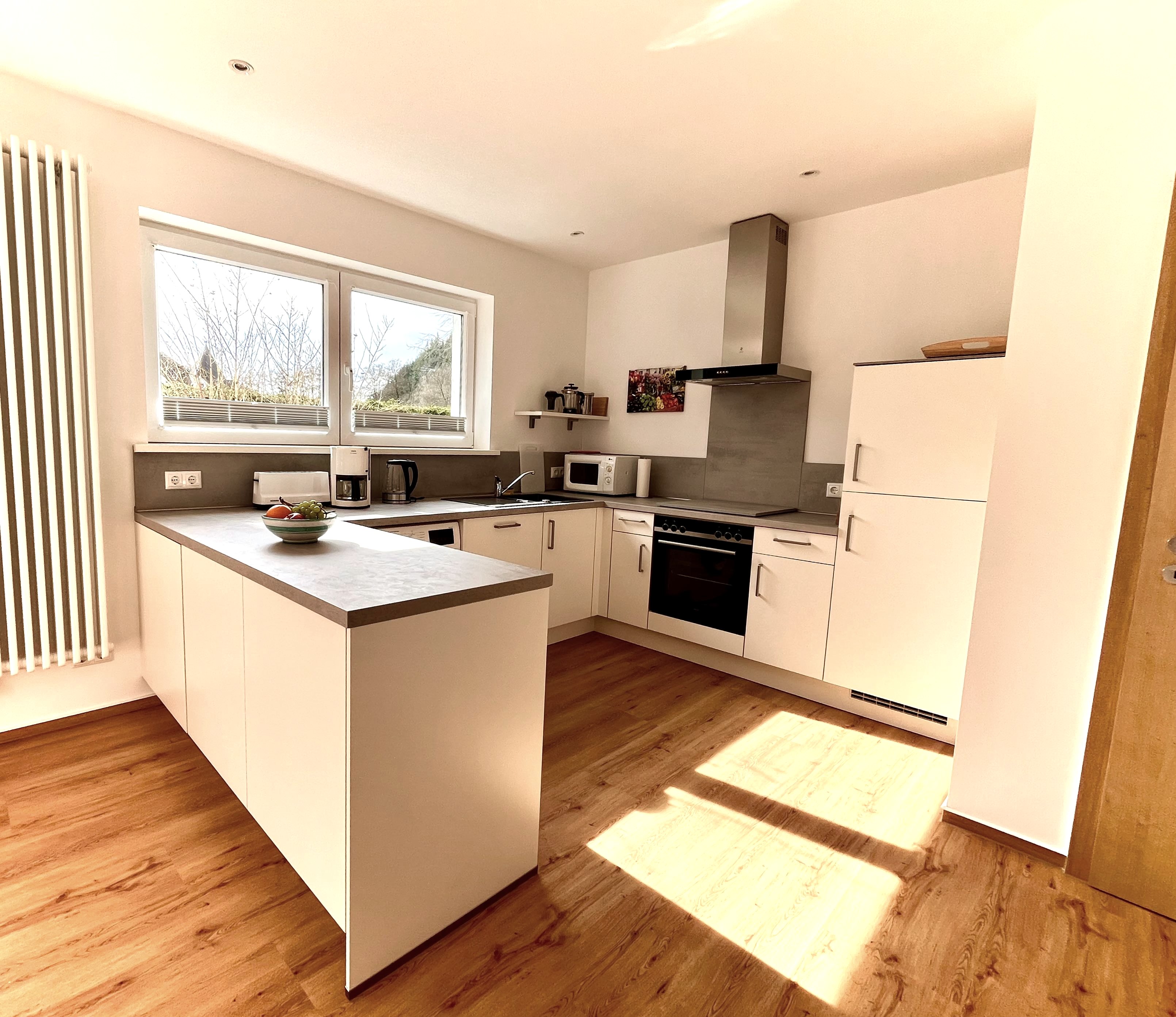 Die großzügige, offene Küche ist komplett eingerichtet mit Geschirrspüler, Waschmaschine, Mikrowelle, Backofen, Toaster und Kaffeemaschine.
