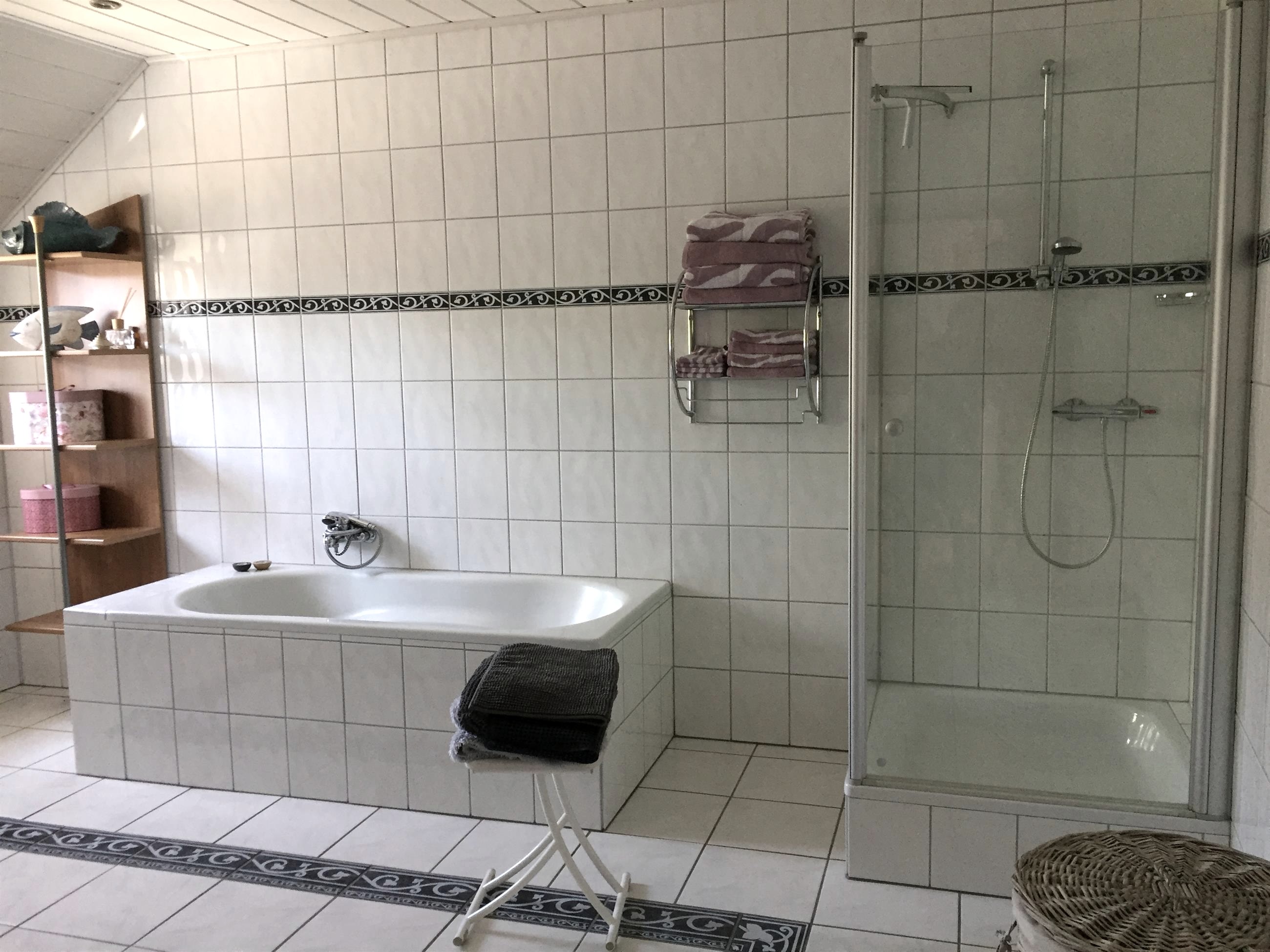 • großes Badezimmer mit Dusche und Badewanne, mit Fön und Handtüchern ausgestattet