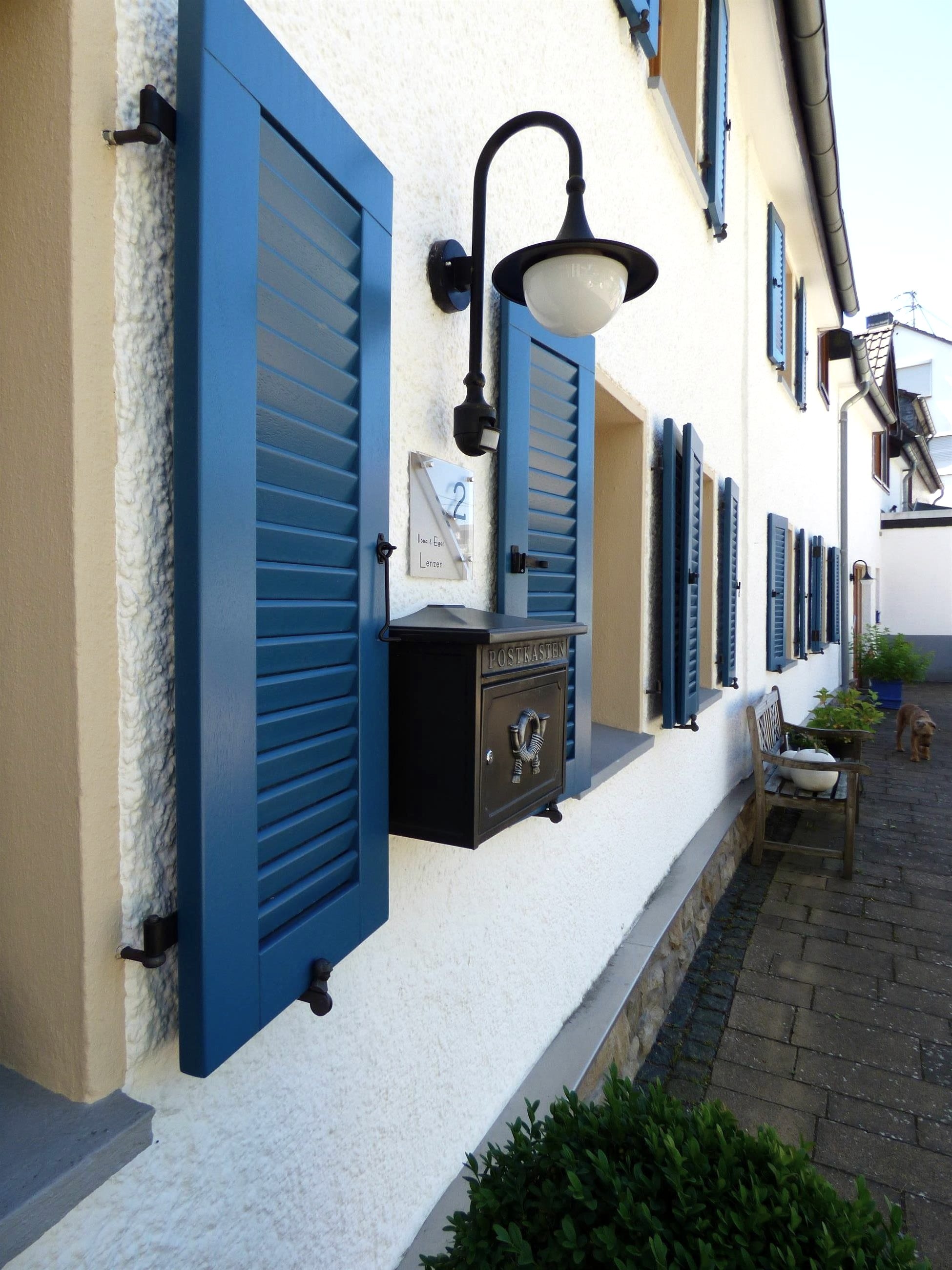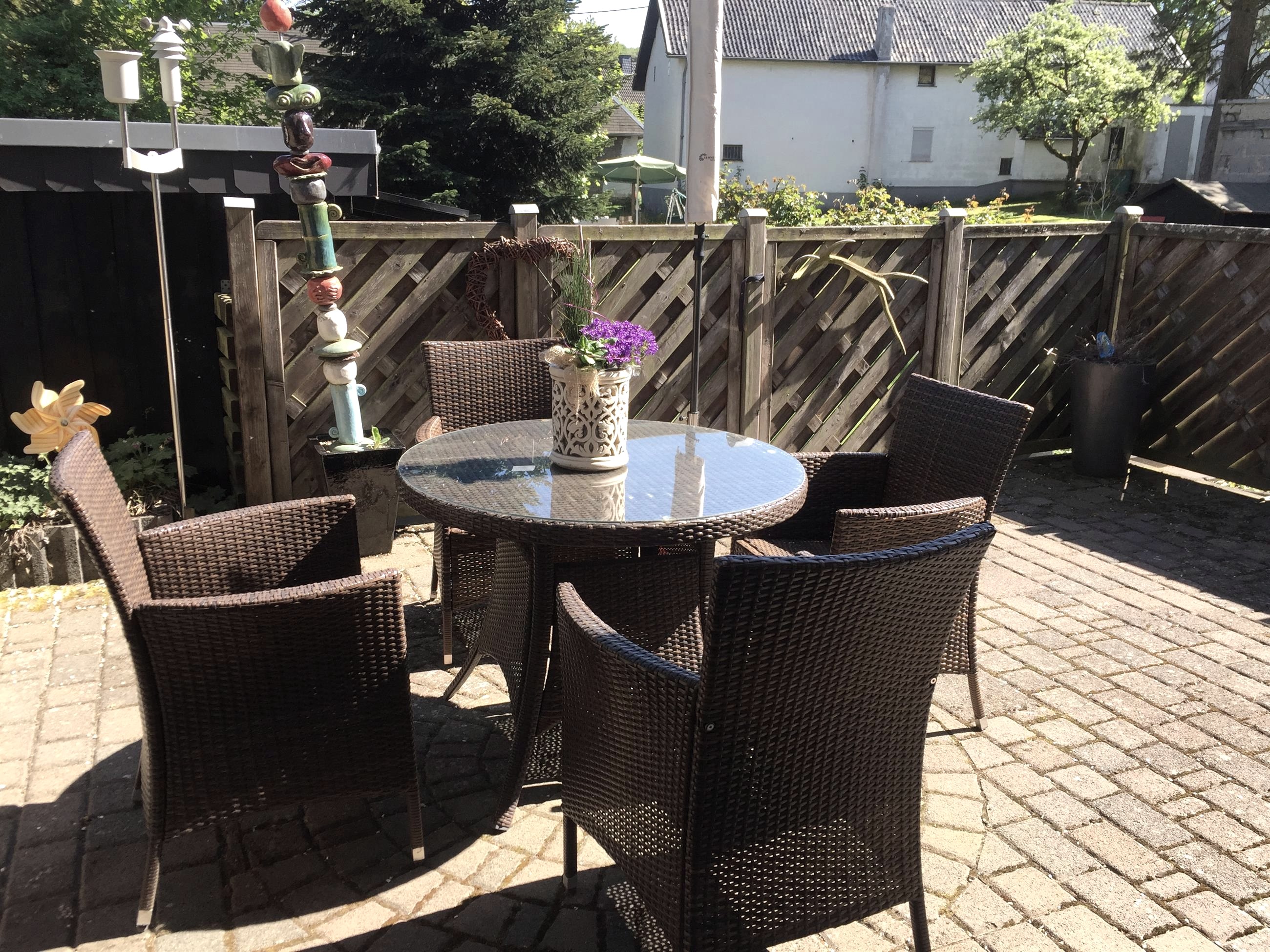 Für die Stühle der Terrasse liegen im Abstellraum im Erdgeschoss Auflagen bereit. Wir bitten unsere Gäste, diese abends oder bei schlechtem Wetter, nicht draußen zu lassen.